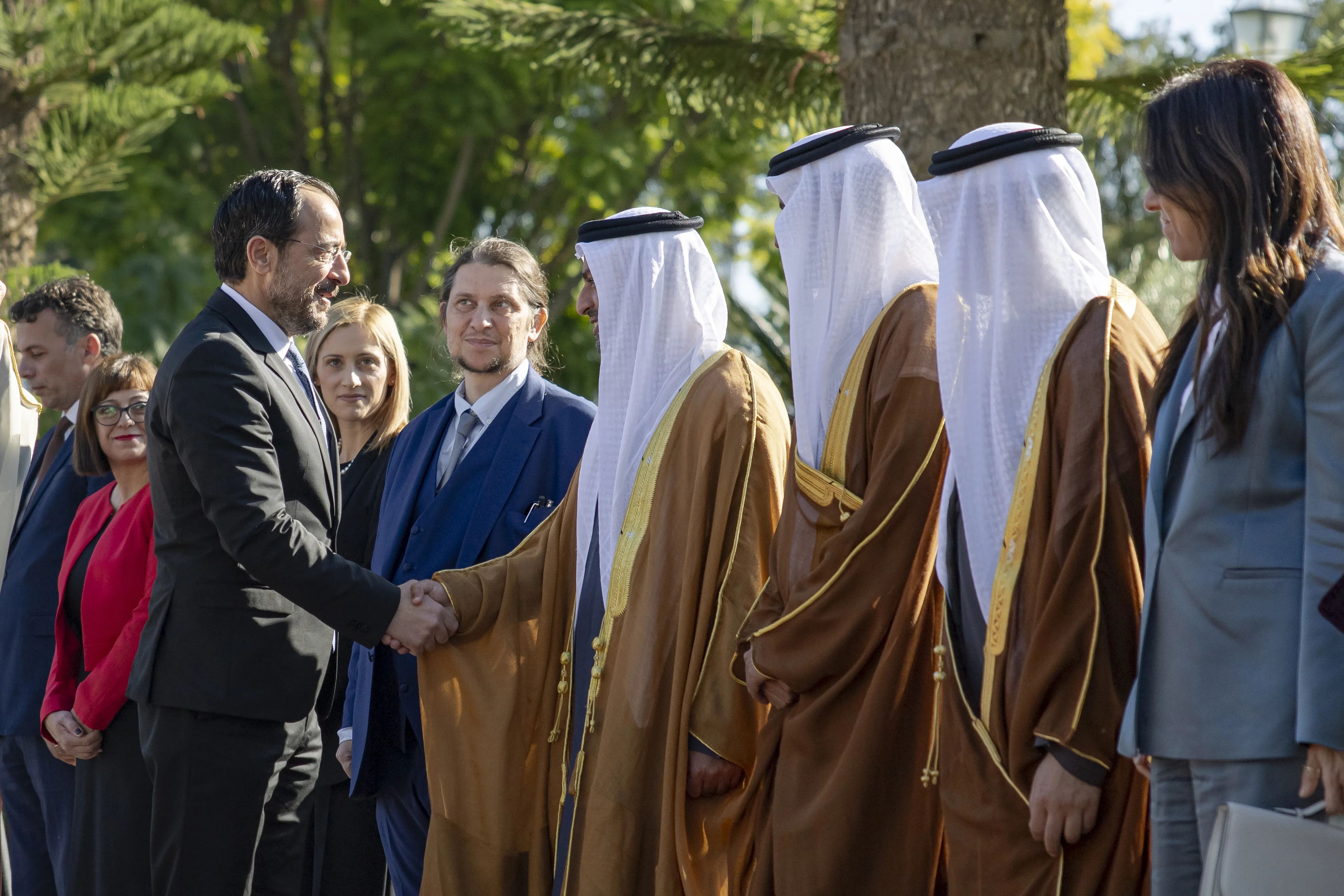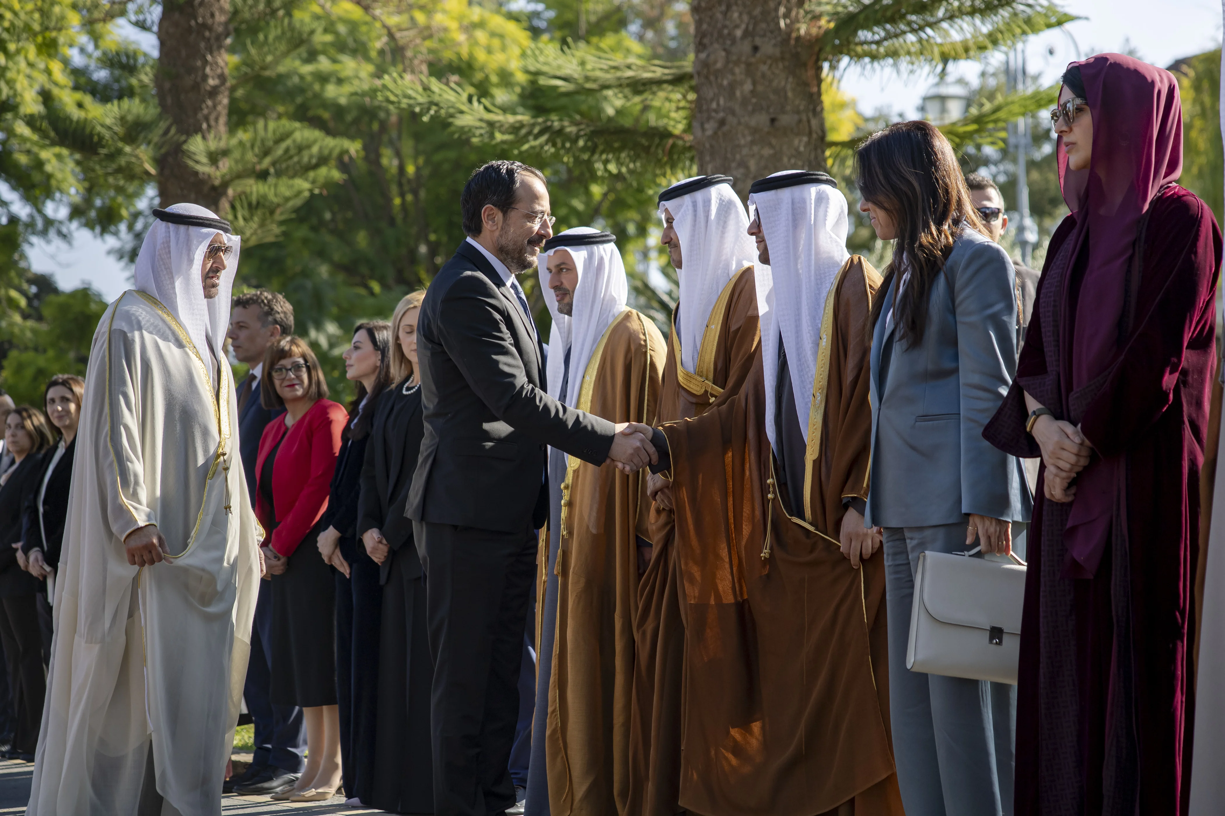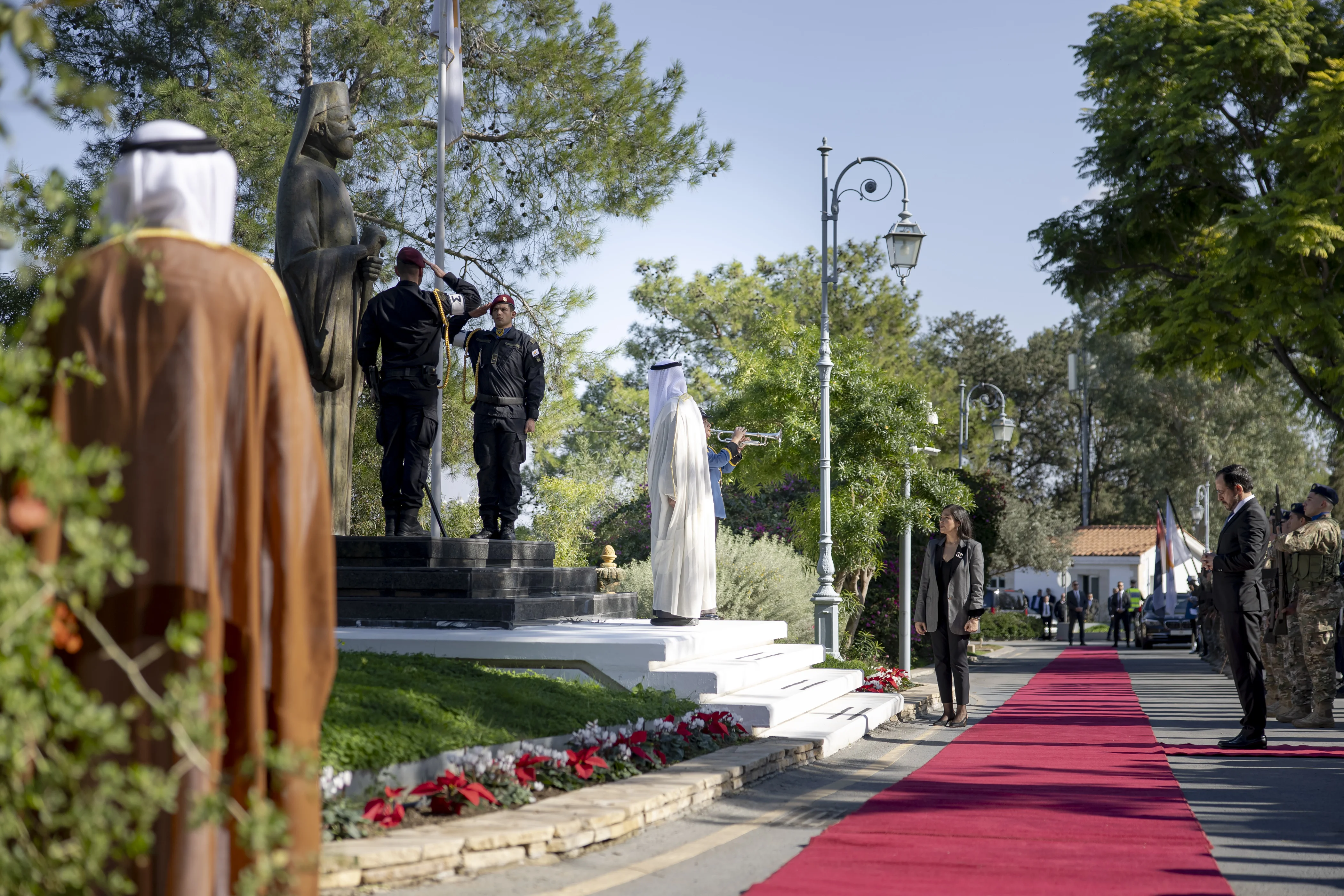 وجرت لسموه لدى وصوله القصر مراسم استقبال رسمية حيث عزف السلام الوطني لكل من دولة الإمارات وقبرص واستعرض سموه ثلة من حرس الشرف اصطفت تحية لسموه.