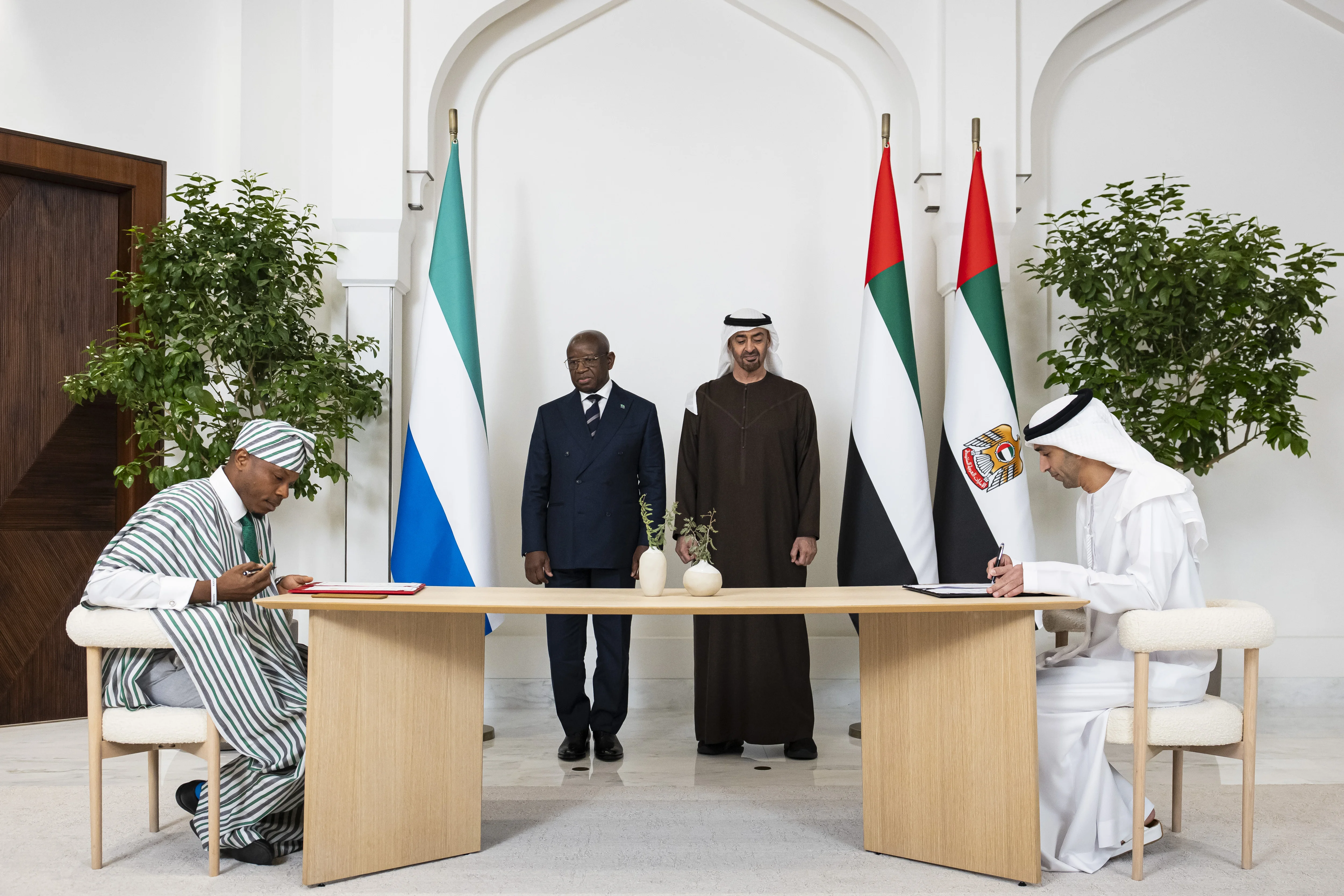 شهد صاحب السمو الشيخ محمد بن زايد آل نهيان رئيس الدولة "حفظه الله"، وفخامة جوليوس مادا بيو رئيس جمهورية سيراليون، مراسم توقيع اتفاقية الشراكة الاقتصادية الشاملة بين البلدين والتي تهدف إلى تعميق الروابط التجارية والاستثمارية وتعزيز شراكتهما الاقتصادية.