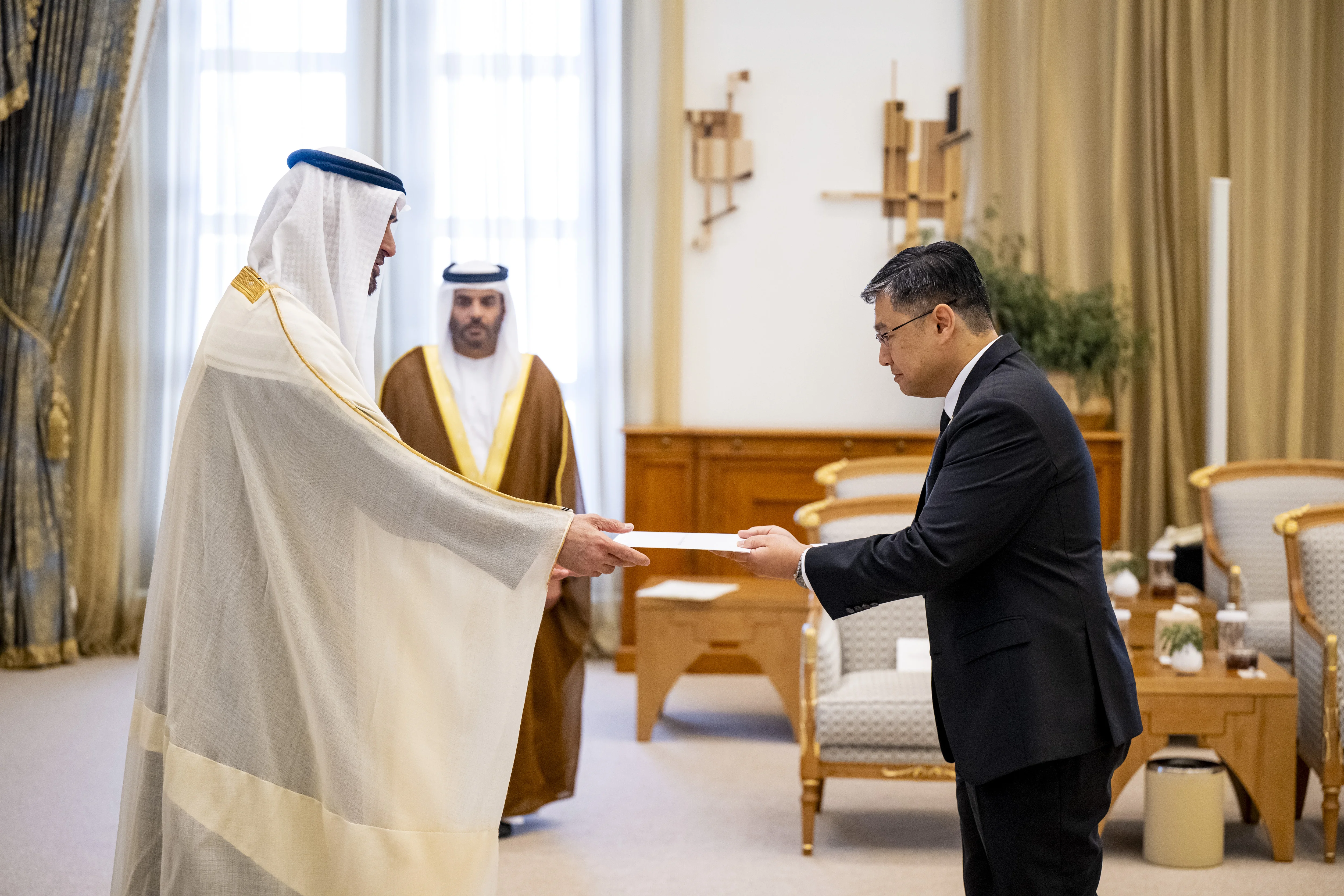 وقد تسلم سموه أوراق اعتماد سعادة كل من..إسحاق أنانياس مويو سفير جمهورية زيمبابوي، وبولبونج فانجفاين سفير مملكة تايلند وتسنغ جيشين سفير جمهورية الصين الشعبية.
