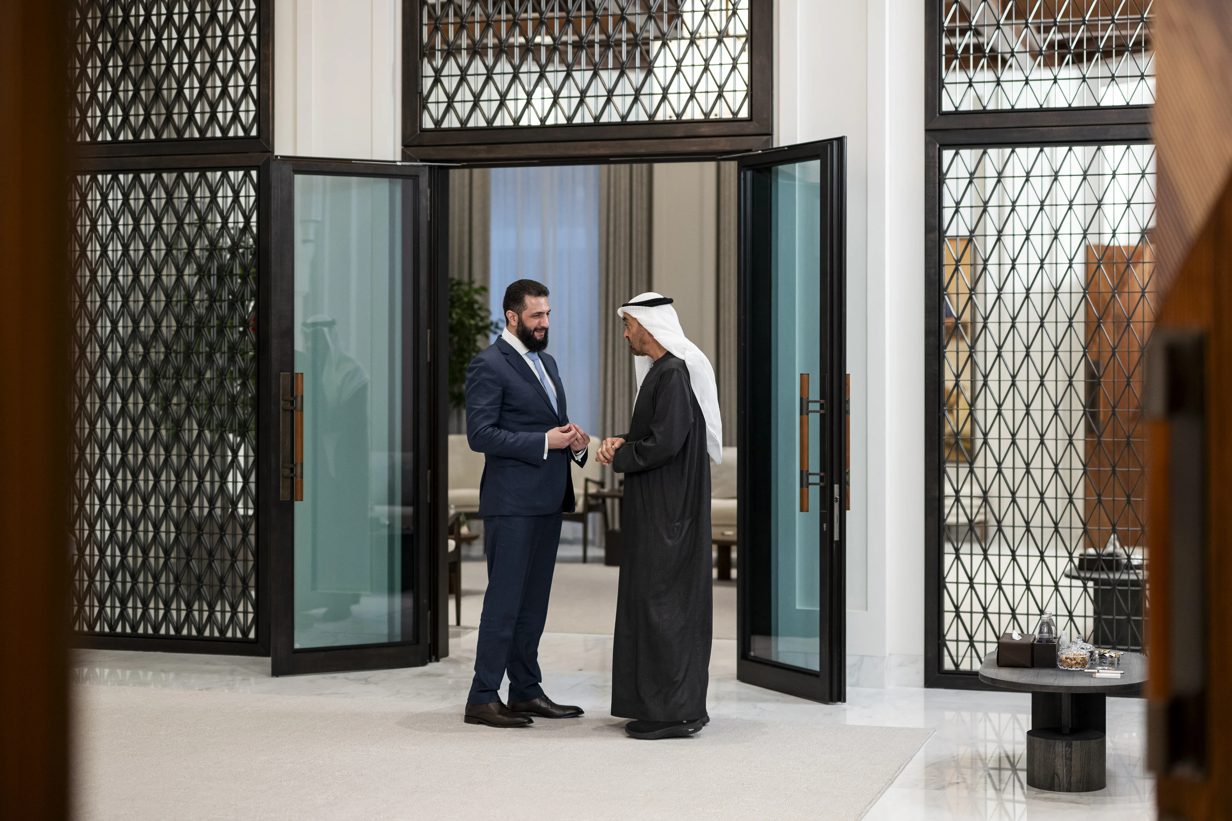 استقبل صاحب السمو الشيخ محمد بن زايد آل نهيان رئيس الدولة "حفظه الله" اليوم فخامة أحمد الشرع رئيس الجمهورية العربية السورية الذي يقوم بزيارة عمل إلى الدولة.