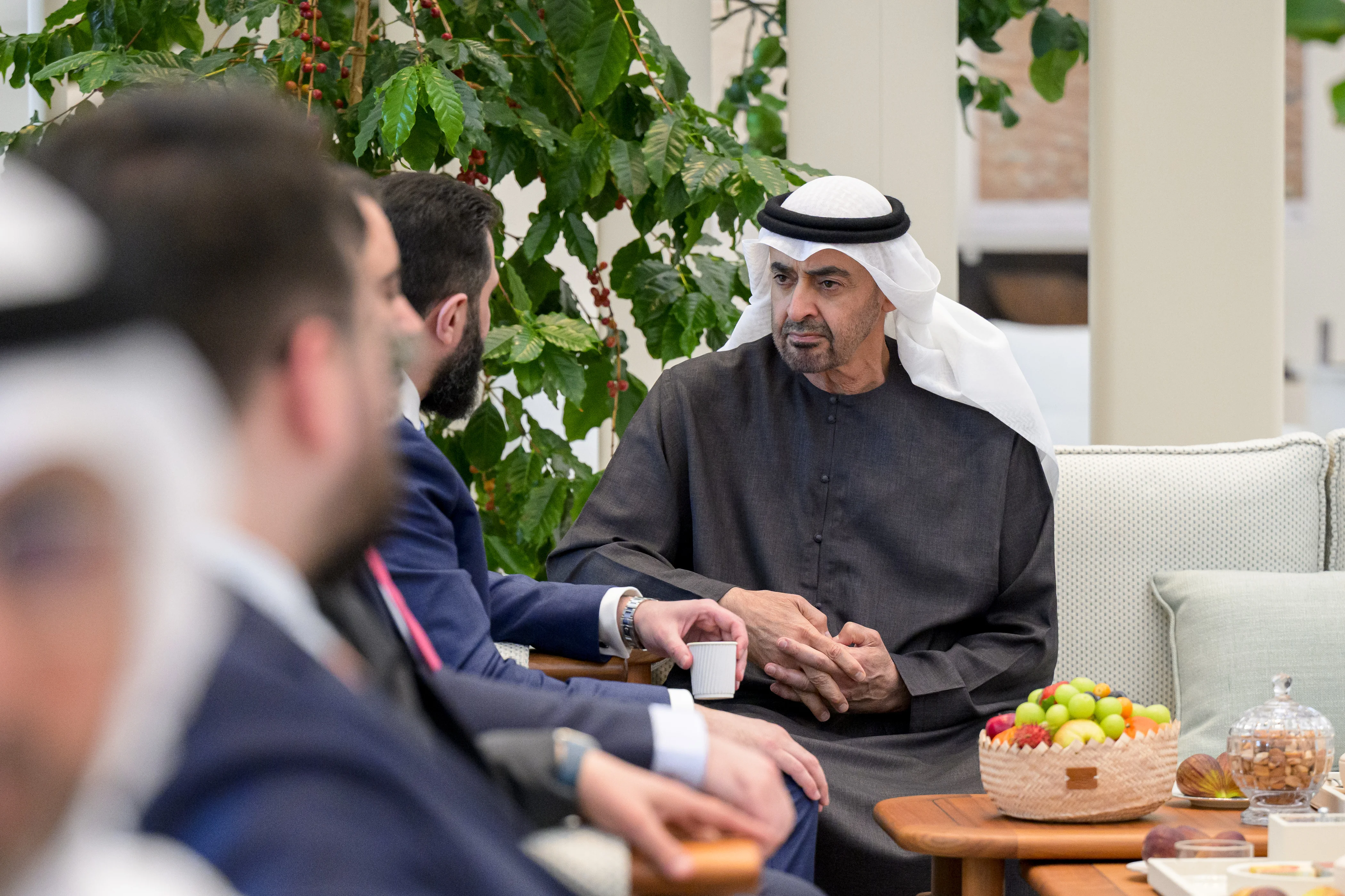 حضر اللقاء..سمو الشيخ منصور بن زايد آل نهيان نائب رئيس الدولة نائب رئيس مجلس الوزراء رئيس ديوان الرئاسة وسمو الشيخ حمدان بن زايد آل نهيان ممثل الحاكم في منطقة الظفرة وسمو الشيخ حامد بن زايد آل نهيان وسمو الشيخ عبد الله بن زايد آل نهيان نائب رئيس مجلس الوزراء وزير الخارجية وسمو الشيخ ذياب بن محمد بن زايد آل نهيان نائب رئيس ديوان الرئاسة للشؤون التنموية وأسر الشهداء وسمو الشيخ حمدان بن محمد بن زايد آل نهيان نائب رئيس ديوان الرئاسة للشؤون الخاصة ومعالي الشيخ نهيان بن مبارك آل نهيان وزير التسامح والتعايش وعدد من الشيوخ والوزراء والمسؤولين..كما حضره الوفد المرافق للرئيس السوري الذي يضم معالي أسعد الشيباني وزير الخارجية والمغتربين وعدداً من المسؤولين.