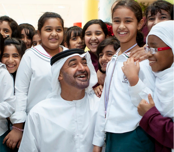 نشأ صاحب السمو الشيخ محمد بن زايد آل نهيان مع بدايات بناء دولة الإمارات، وهو يدرك أن بناء دولة مزدهرة ومؤثرة عالمياً يتطلب تمكين جميع أفراد المجتمع، وأن هذا التمكين يبدأ بتوفير التعليم الجيد وإتاحة الفرص للجميع، لذا يستثمر سموه في قادة الغد مع التركيز على التعليم عالي الجودة والمبادرات التي تدعم التقاليد الأصيلة لدولة الإمارات وصورتها وقوتها، كما يؤمن سموه أن الإنسان يأتي في المقام الأول لأن ازدهار الدولة منوط بازدهار شعبها.