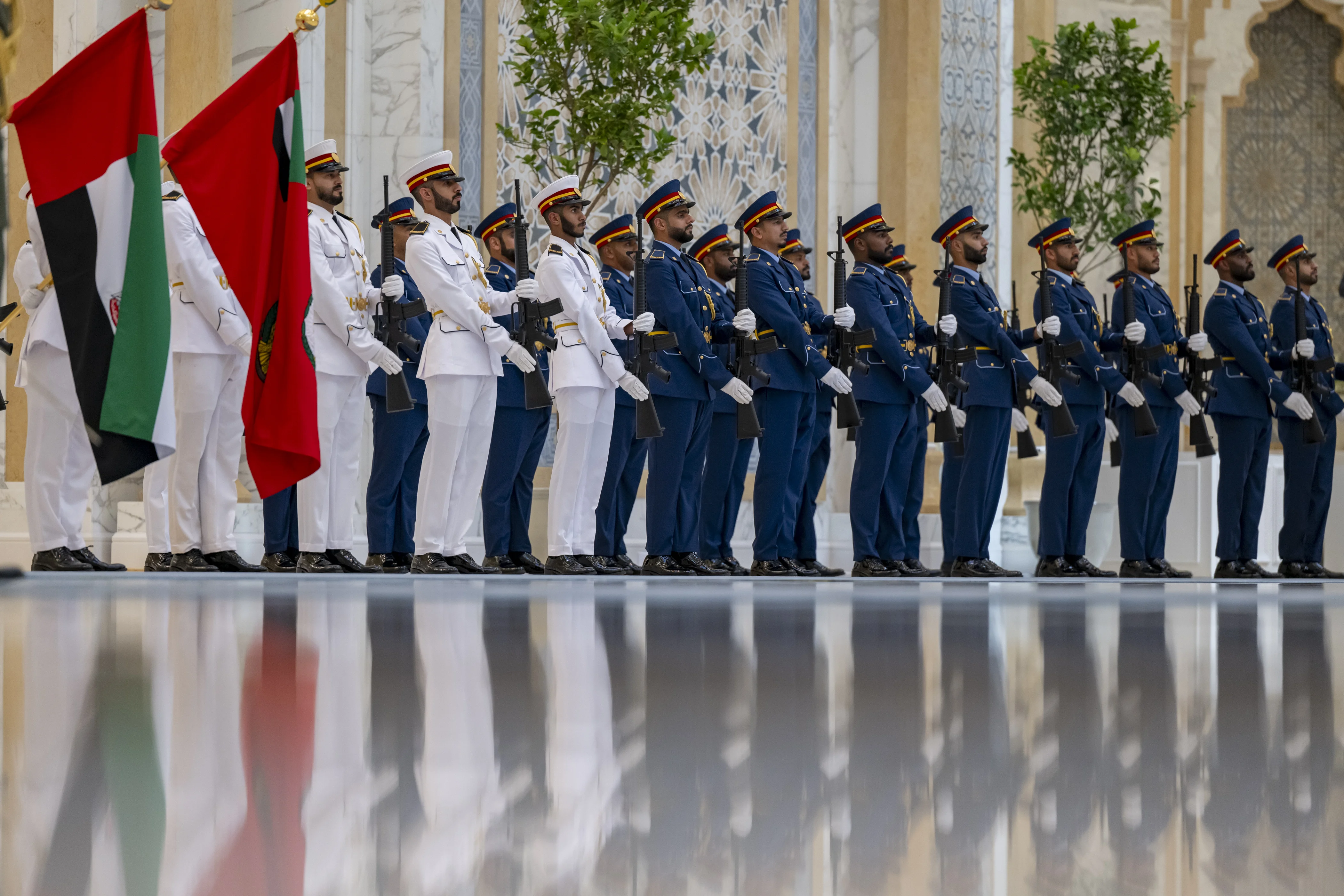 His Highness Sheikh Mohamed bin Zayed accompanied President Subianto to inspect the guard of honour and witness performances of the UAE and Indonesian national anthems. The ceremony featured a 21-gun artillery salute, and the visiting delegation received a warm welcome from groups of Emirati children waving the flags of both countries and offering cheerful greetings.