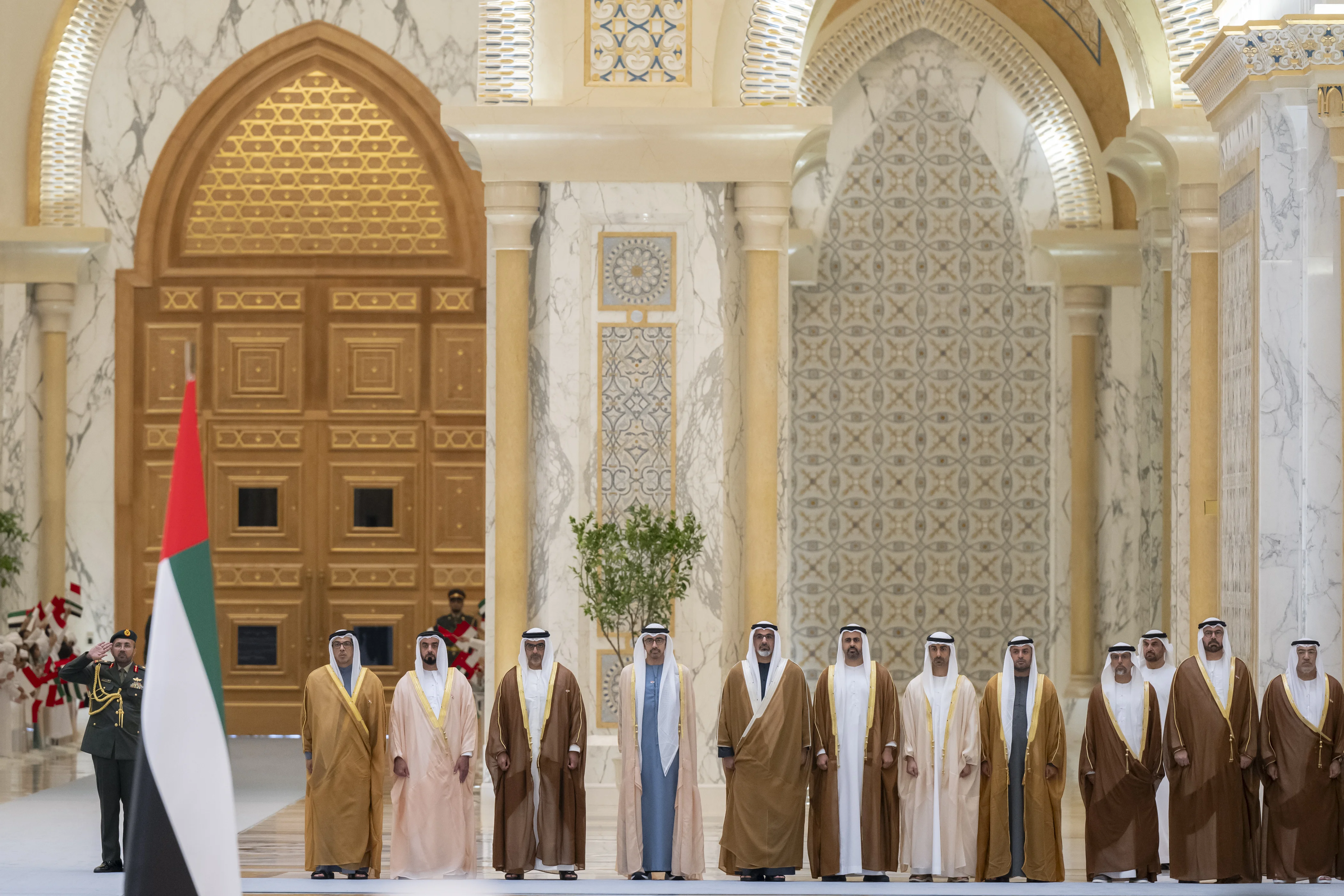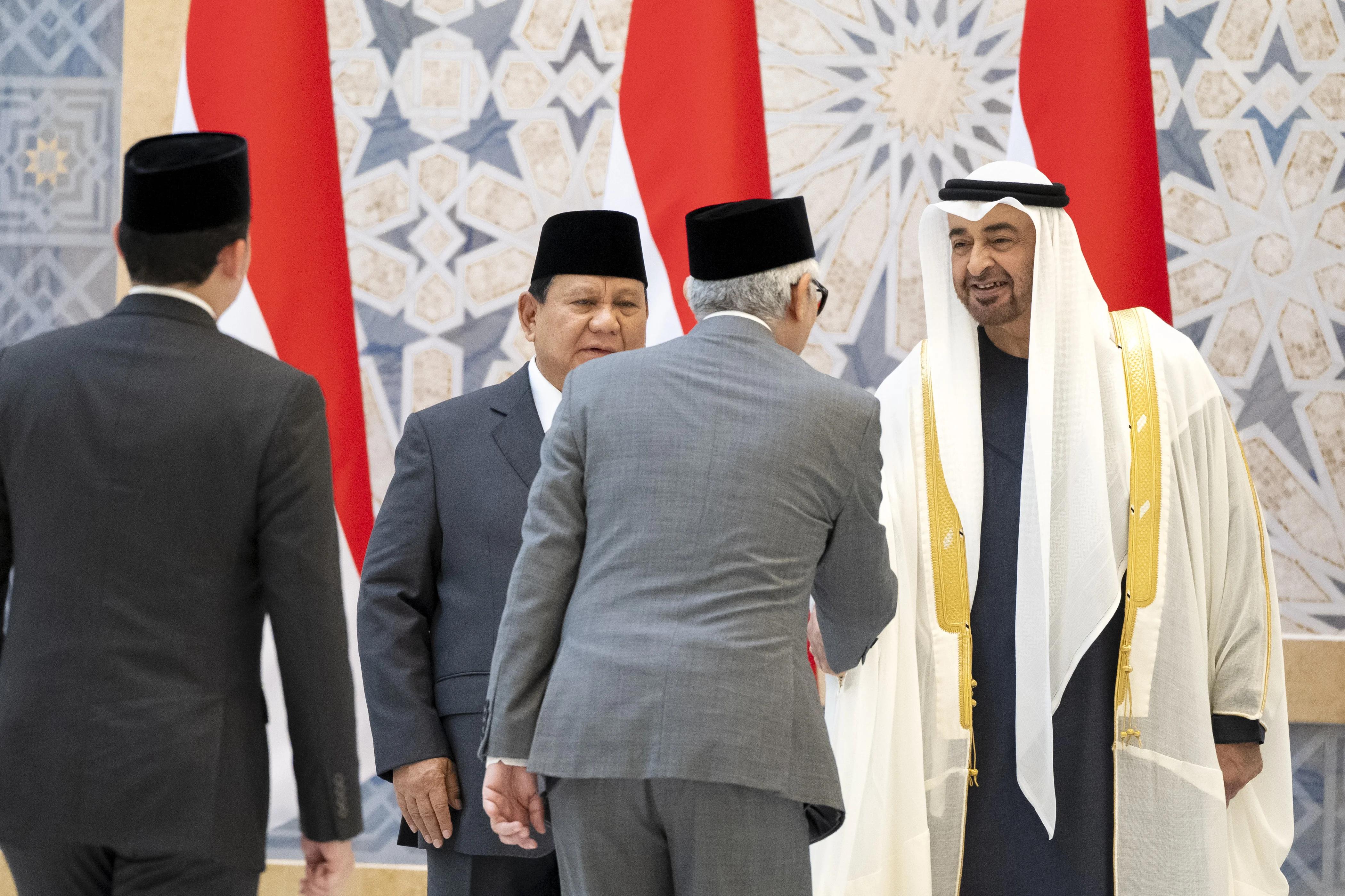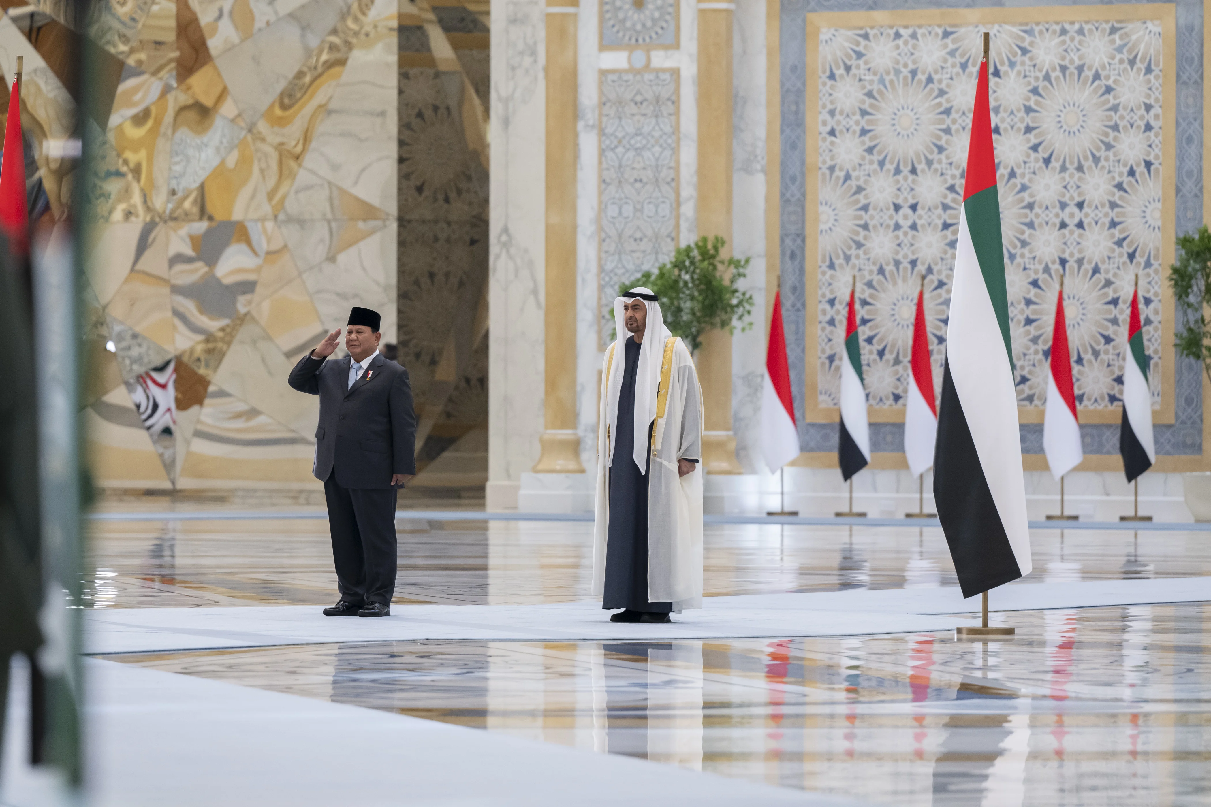 The reception ceremony was attended by His Highness Sheikh Mansour bin Zayed Al Nahyan, Vice President, Deputy Prime Minister and Chairman of the Presidential Court; H.H. Sheikh Khaled bin Mohamed bin Zayed Al Nahyan, Crown Prince of Abu Dhabi; H.H. Lt. General Sheikh Saif bin Zayed Al Nahyan, Deputy Prime Minister and Minister of the Interior; H.H. Sheikh Hamed bin Zayed Al Nahyan, Managing Director of the Abu Dhabi Investment Authority (ADIA); H.H. Sheikh Abdullah bin Zayed Al Nahyan, Deputy Prime Minister and Minister of Foreign Affairs; H.H. Sheikh Theyab bin Mohamed bin Zayed, Deputy Chairman of the Presidential Court for Development and Fallen Heroes’ Affairs; H.H. Sheikh Hamdan bin Mohamed bin Zayed Al Nahyan, Deputy Chairman of the Presidential Court for Special Affairs; Sheikh Mohammed bin Hamad bin Tahnoun Al Nahyan, Advisor for Special Affairs at the Presidential Court; Mohammad bin Abdullah Al Gergawi, Minister of Cabinet Affairs; Abdul Rahman bin Mohammad bin Nasser Al Owais, Minister of Health and Prevention; Suhail bin Mohammed Al Mazrouei, Minister of Energy and Infrastructure and Head of the Honorary Mission accompanying the guest President; Dr. Sultan bin Ahmed Al Jaber, Minister of Industry and Advanced Technology; Dr. Amna bint Abdullah Al Dahak, Minister of Climate Change and Environment; Mohamed Hassan Alsuwaidi, Minister of Investment; Ahmed Ali Al Sayegh, Minister of State; Faisal Abdulaziz Mohammed Al Bannai, Adviser to the UAE President for Strategic Research and Advanced Technology; Abdullah Salem Al Dhaheri, UAE Ambassador to Indonesia, and a number of senior officials.
