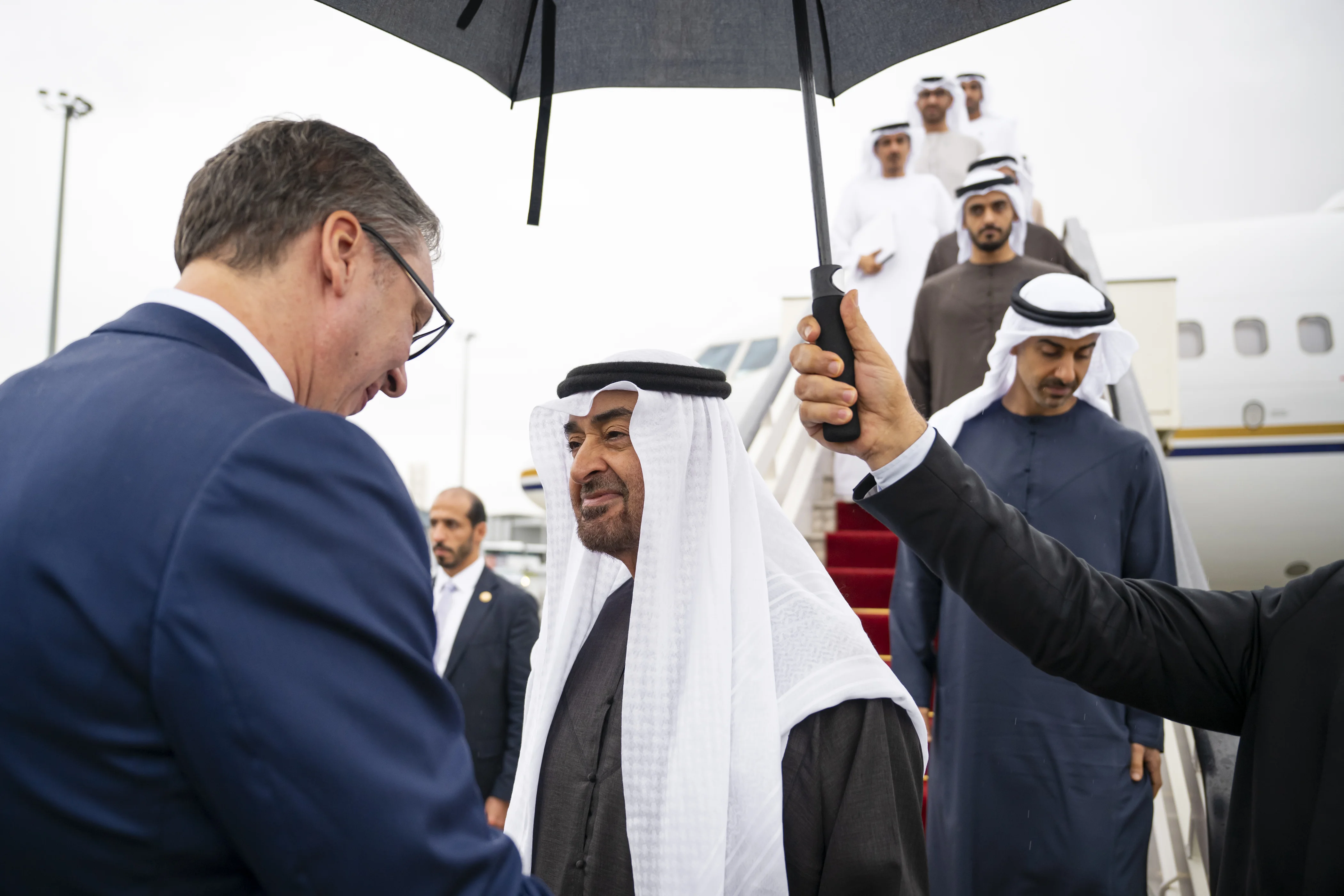 His Highness is accompanied on the visit by a delegation that includes H.H. Sheikh Hamdan bin Mohamed bin Zayed Al Nahyan, Deputy Chairman of the Presidential Court for Special Affairs; H.H. Sheikh Zayed bin Mohamed bin Zayed Al Nahyan; Sheikh Mohammed bin Hamad bin Tahnoun Al Nahyan, Adviser to the UAE President; Ali bin Hammad Al Shamsi, Secretary-General of the Supreme Council for National Security; Dr. Sultan bin Ahmed Al Jaber, Minister of Industry and Advanced Technology; Sheikh Shakhboot bin Nahyan Al Nahyan, Minister of State; Faisal Abdulaziz Al Bannai, Adviser to the UAE President for Strategic Research and Advanced Technology Affairs; Dr. Ahmed Mubarak Ali Al Mazrouei, Chairman of the President’s Office for Strategic Affairs and Chairman of the Abu Dhabi Executive Office; Lana Zaki Nusseibeh, Assistant of Minister of Foreign Affairs for Political Affairs; Khaldoon Khalifa Al Mubarak, Chairman of the Executive Affairs Authority; Ahmed Hatem AlMenhali, UAE Ambassador to Serbia; Mohamed Alabbar, Chairman of the Board of Directors of Eagle Hills; along with several senior officials.
