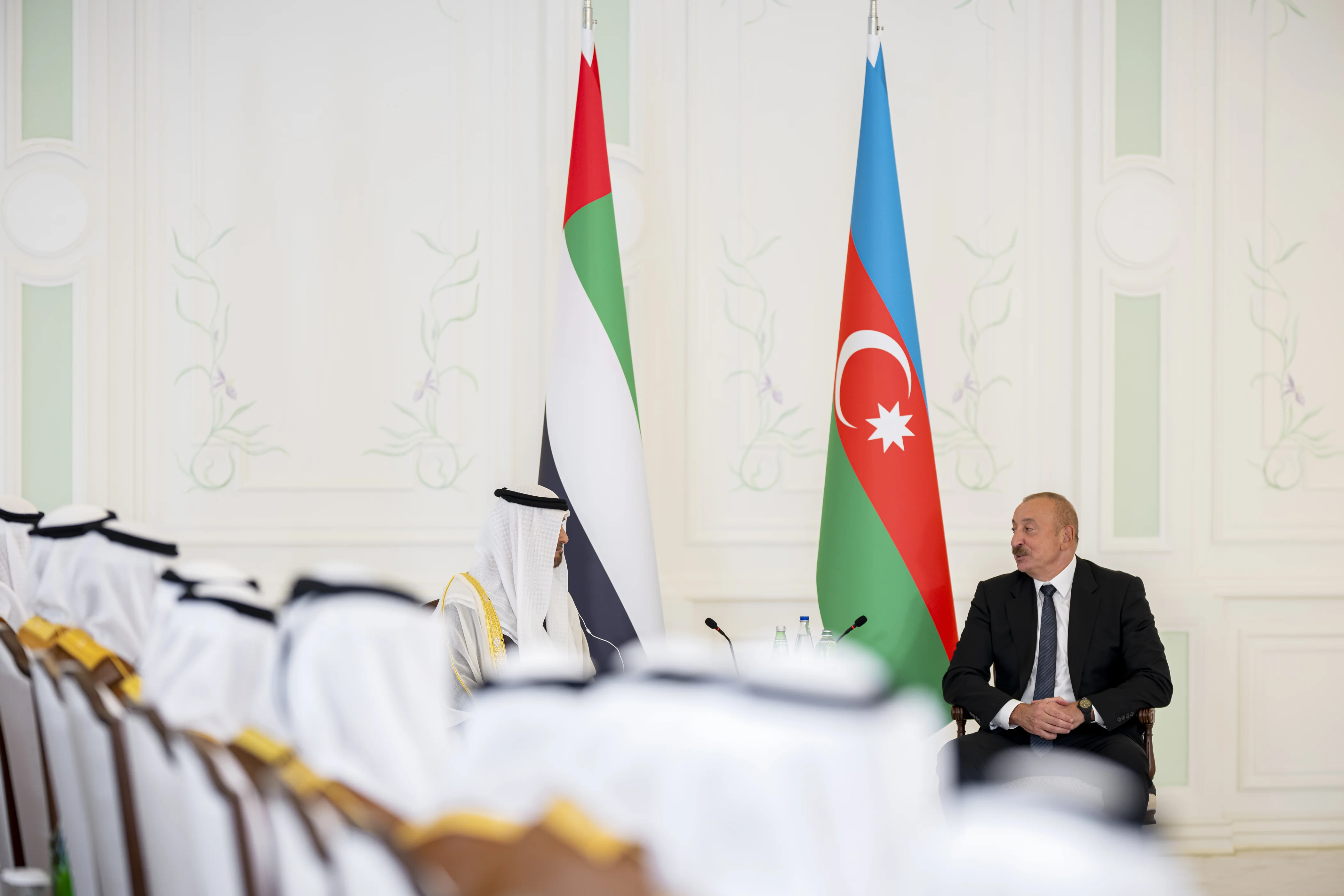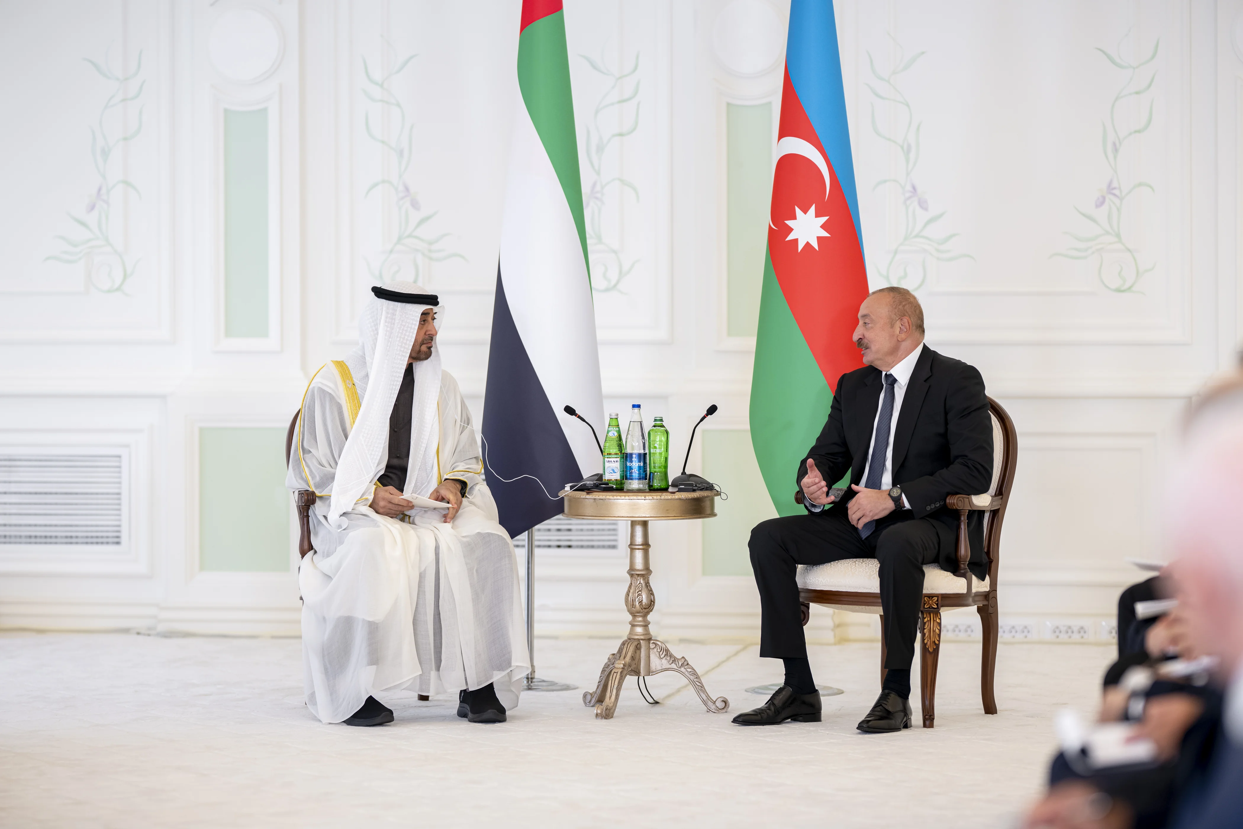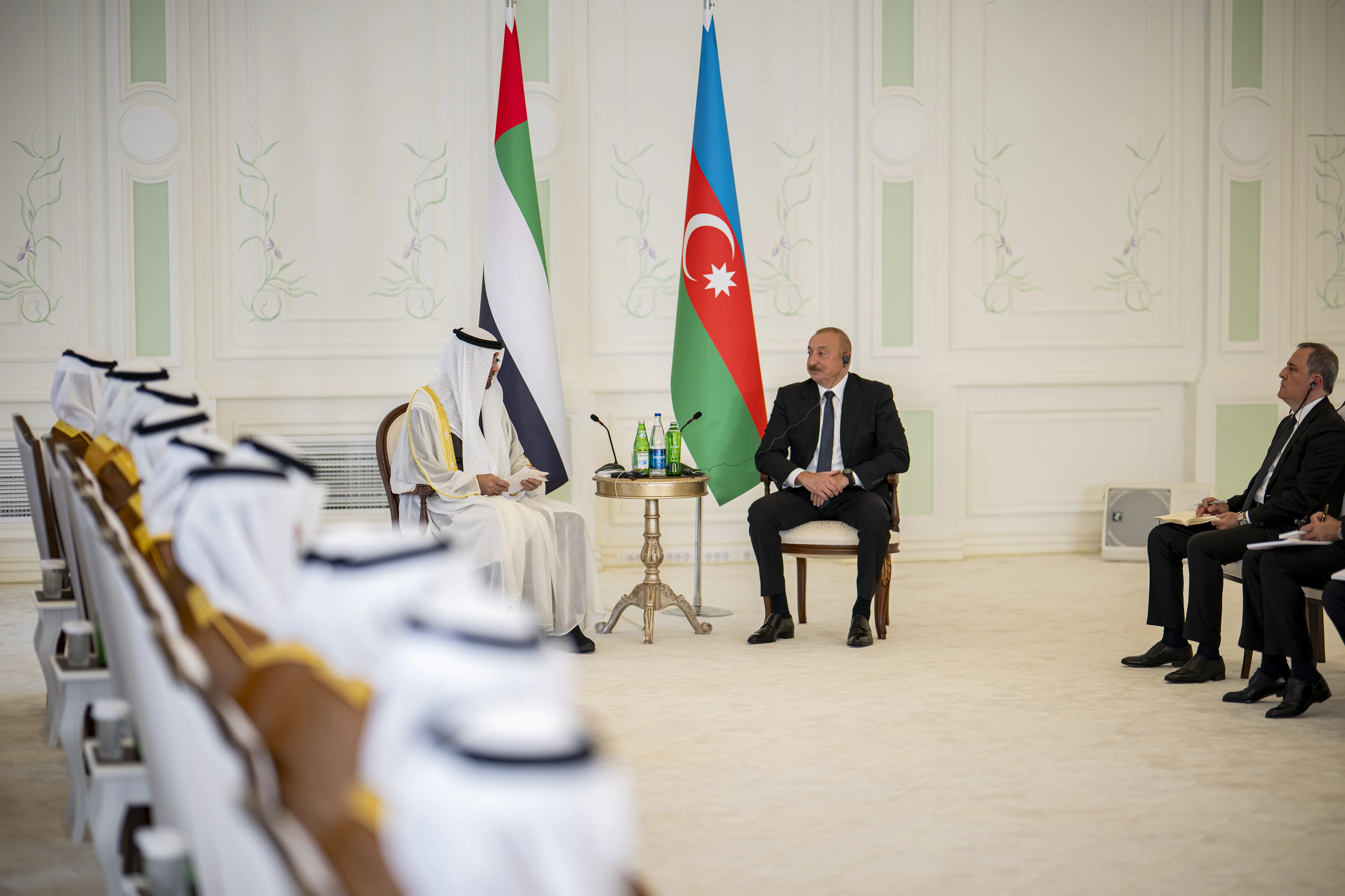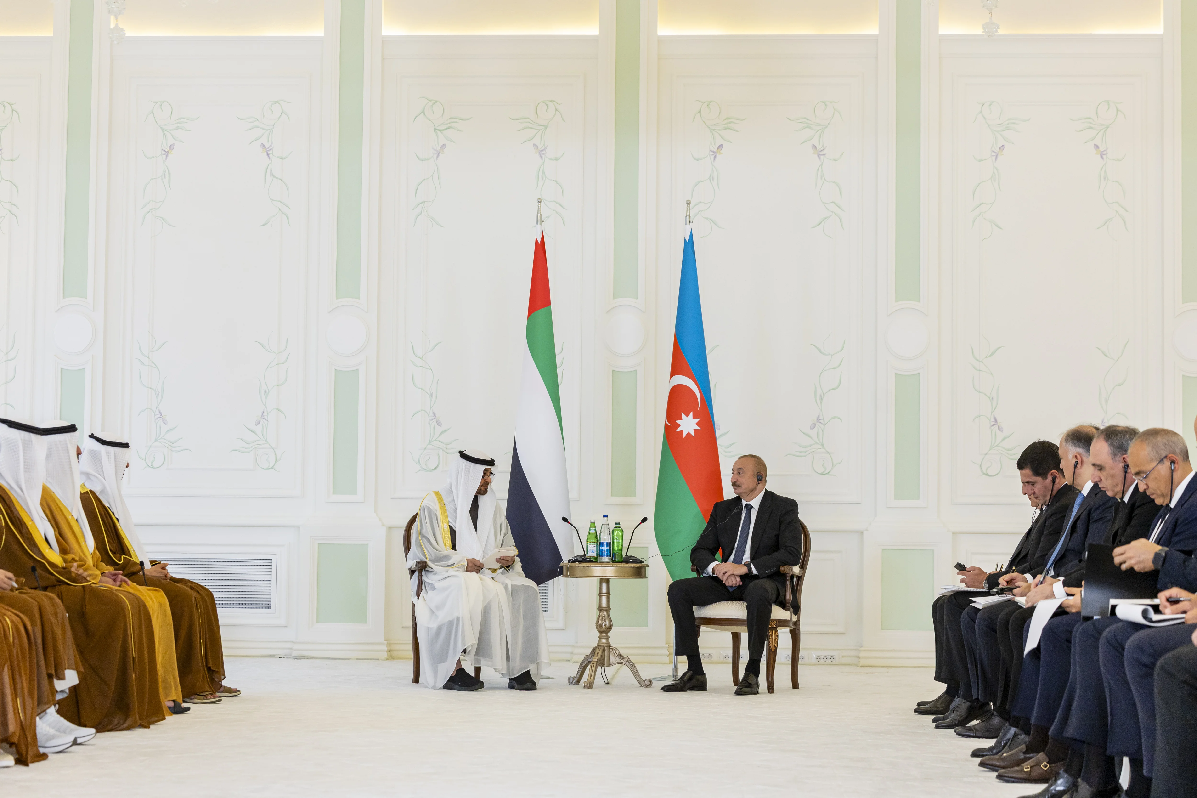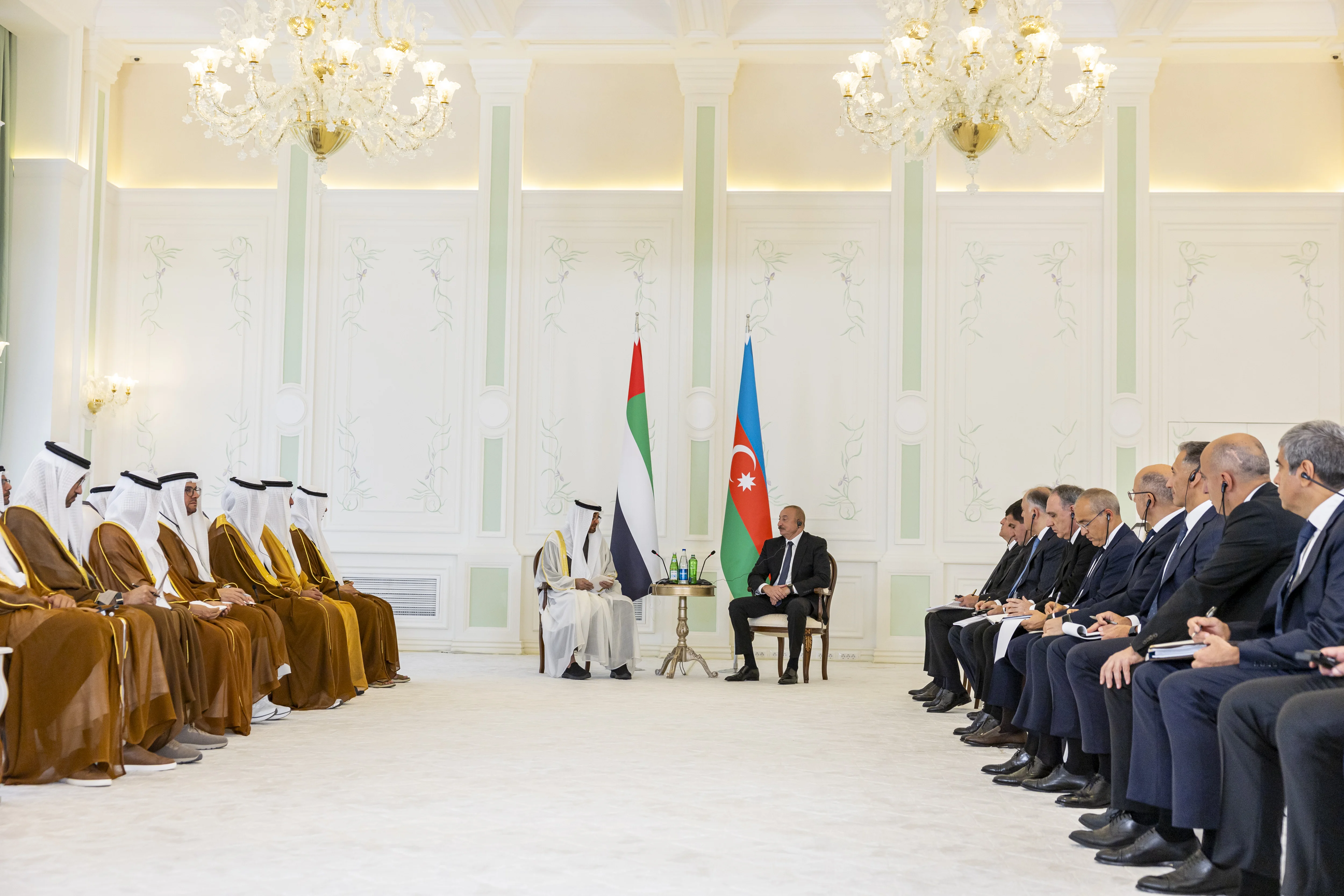 The meeting was attended by the delegation accompanying His Highness the President, which included H.H. Sheikh Hamdan bin Mohamed bin Zayed Al Nahyan, Deputy Chairman of the Presidential Court for Special Affairs, Sheikh Mohammed bin Hamad bin Tahnoun Al Nahyan, Adviser to the UAE President, along with a number of ministers and senior officials. From the Azerbaijani side, several ministers and senior officials were in attendance.