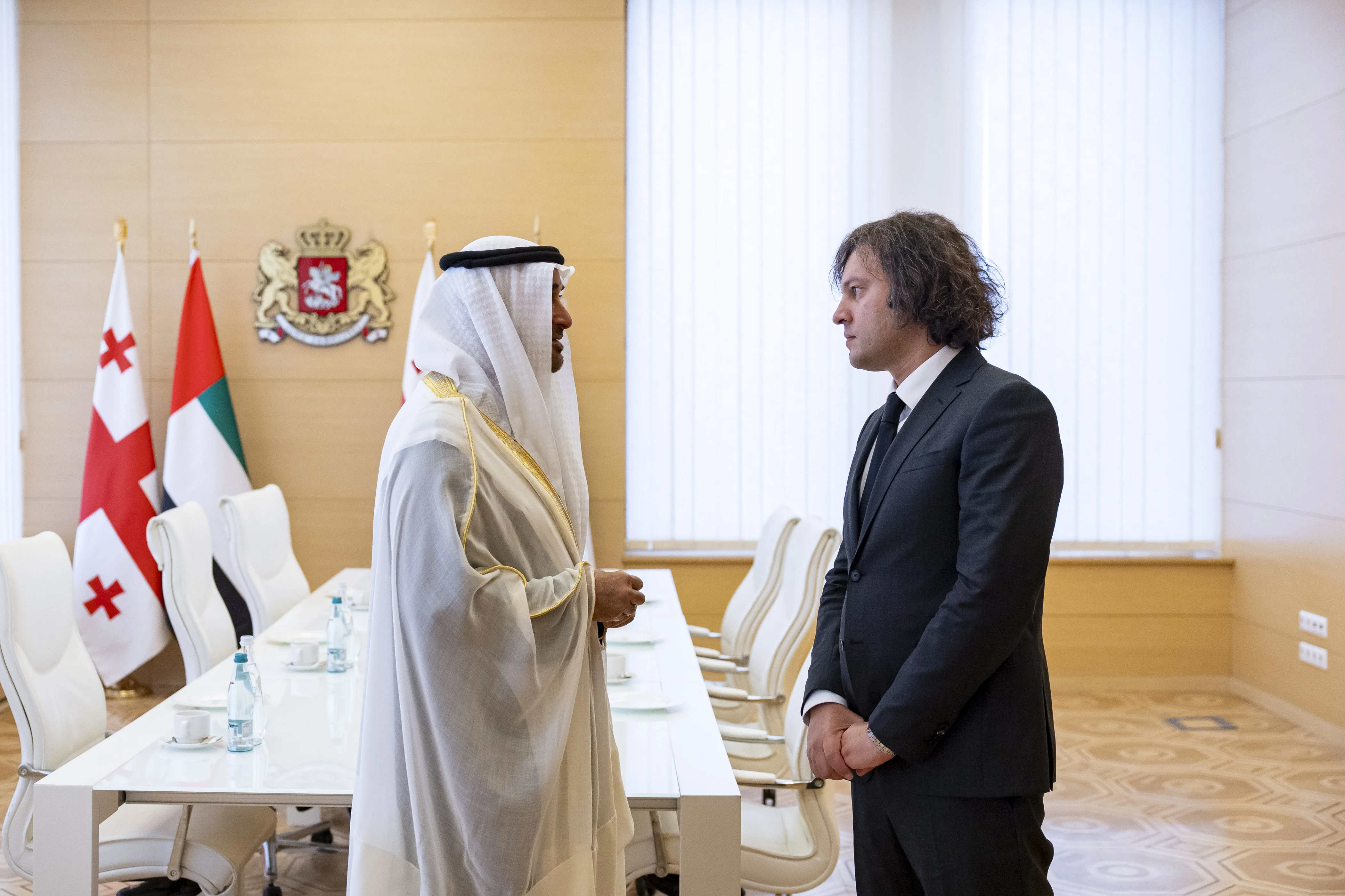 UAE President His Highness Sheikh Mohamed bin Zayed Al Nahyan held talks today with Georgian Prime Minister His Excellency Irakli Kobakhidze, focusing on strengthening cooperation across key sectors, including investment, the economy, agriculture, renewable energy, and sustainability, which are considered strategic priorities in both countries’ development plans.