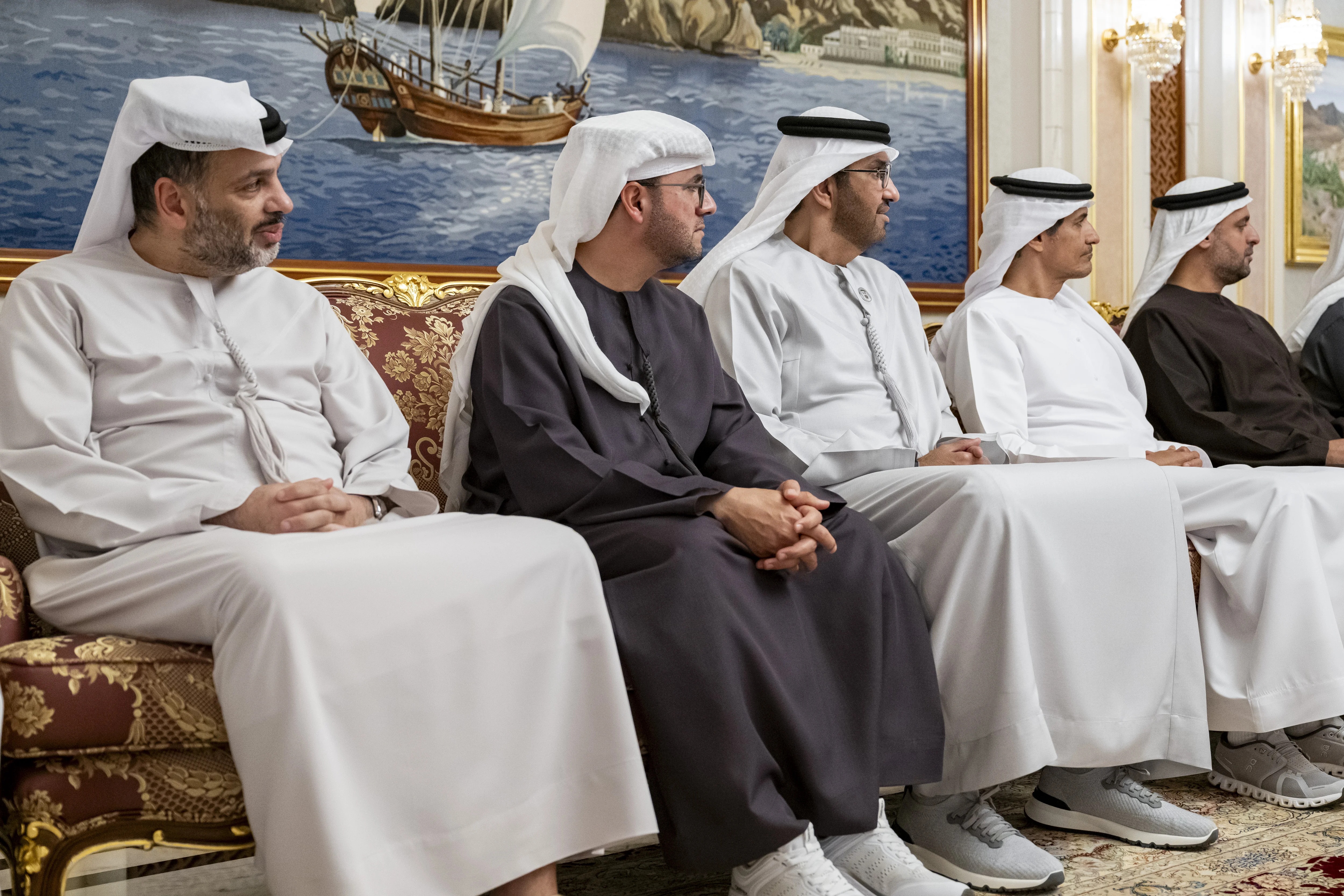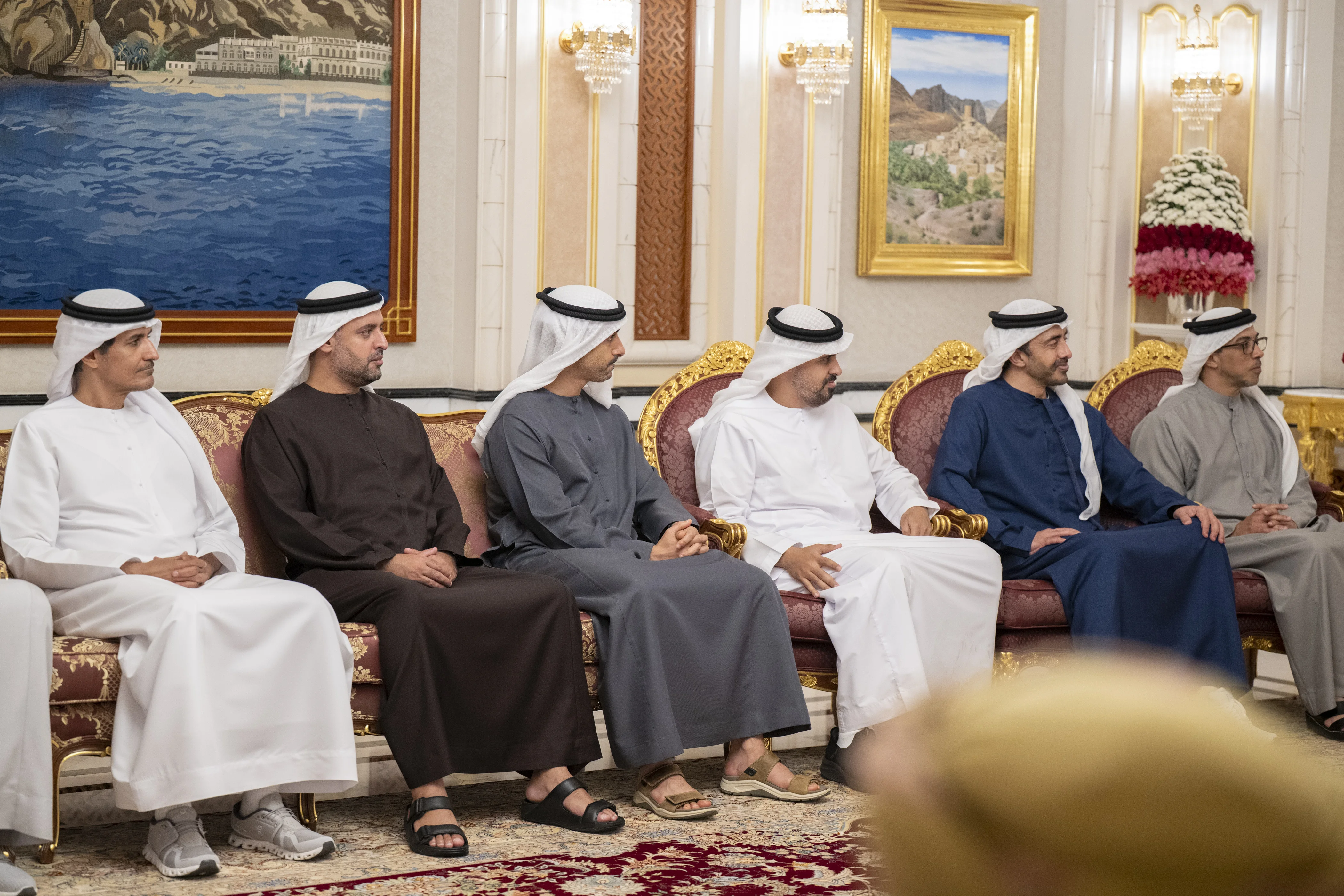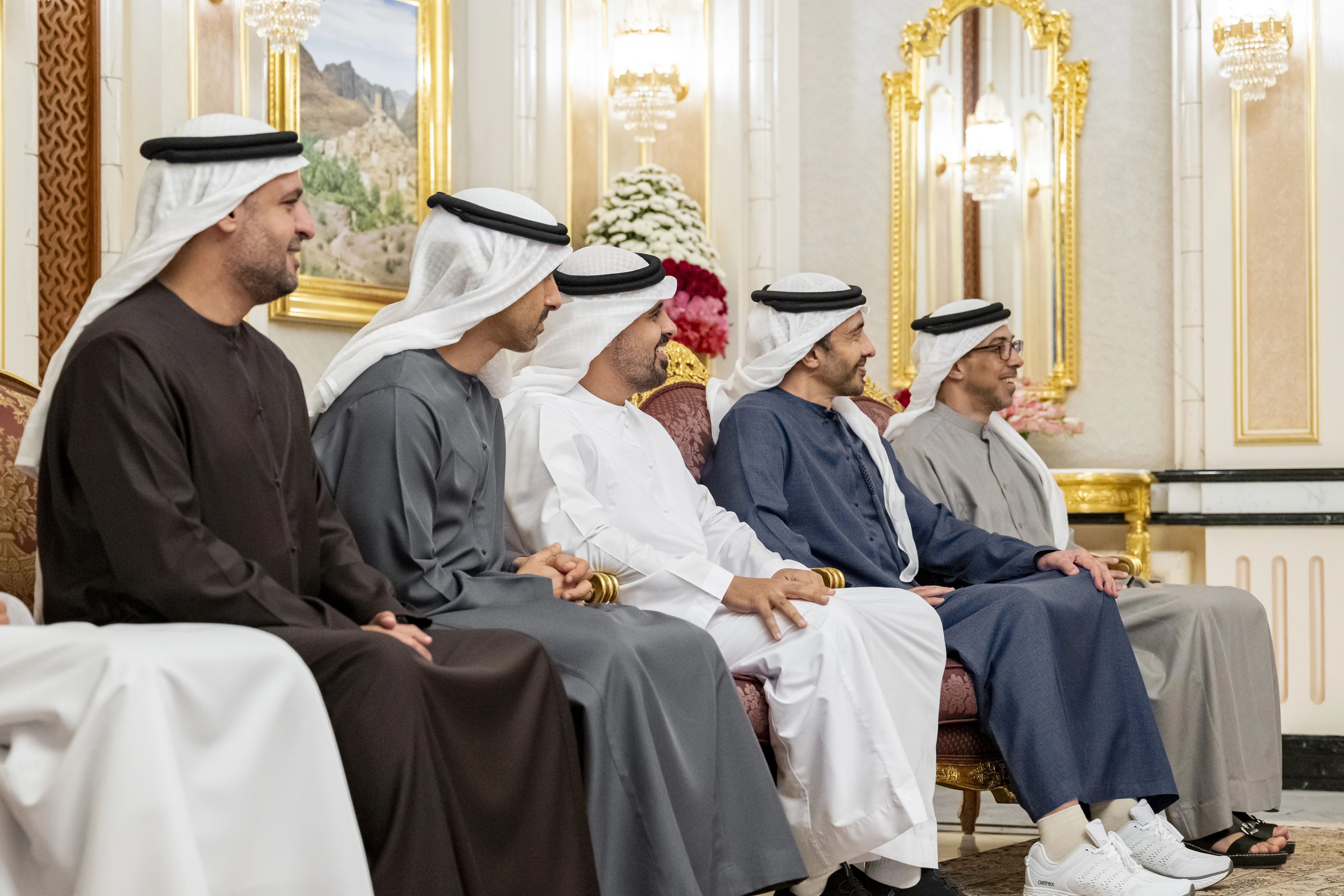 The meeting was attended by His Highness Sheikh Mansour bin Zayed Al Nahyan, Vice President, Deputy Prime Minister and Chairman of the Presidential Court; H.H. Sheikh Abdullah bin Zayed Al Nahyan, Deputy Prime Minister and Minister of Foreign Affairs; H.H. Sheikh Theyab bin Mohamed bin Zayed Al Nahyan, Deputy Chairman of the Presidential Court for Development and Fallen Heroes' Affairs; H.H. Sheikh Hamdan bin Mohamed bin Zayed Al Nahyan, Deputy Chairman of the Presidential Court for Special Affairs; and Sheikh Mohammed bin Hamad bin Tahnoon Al Nahyan, Advisor to the UAE President, along with a number of ministers and senior officials.