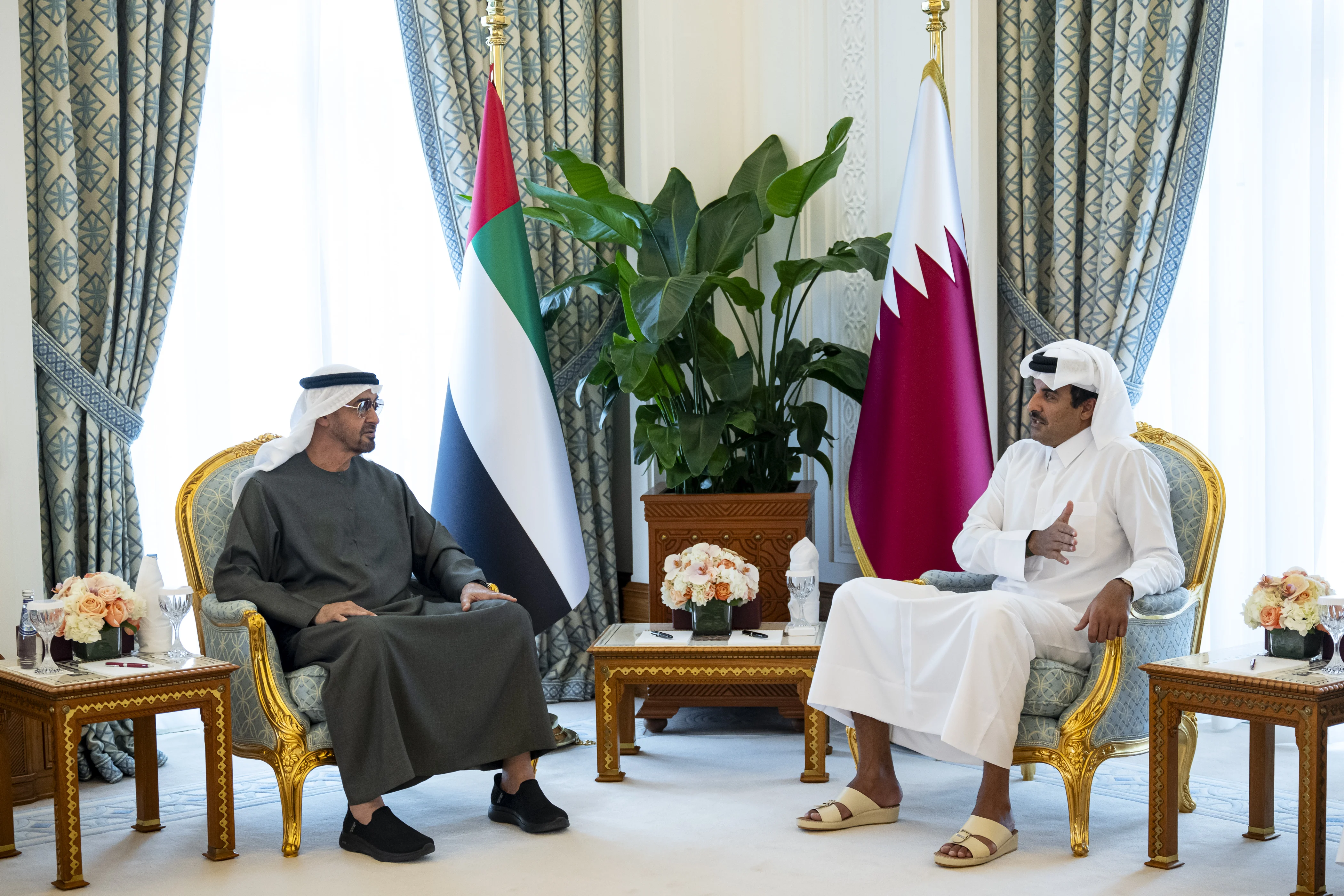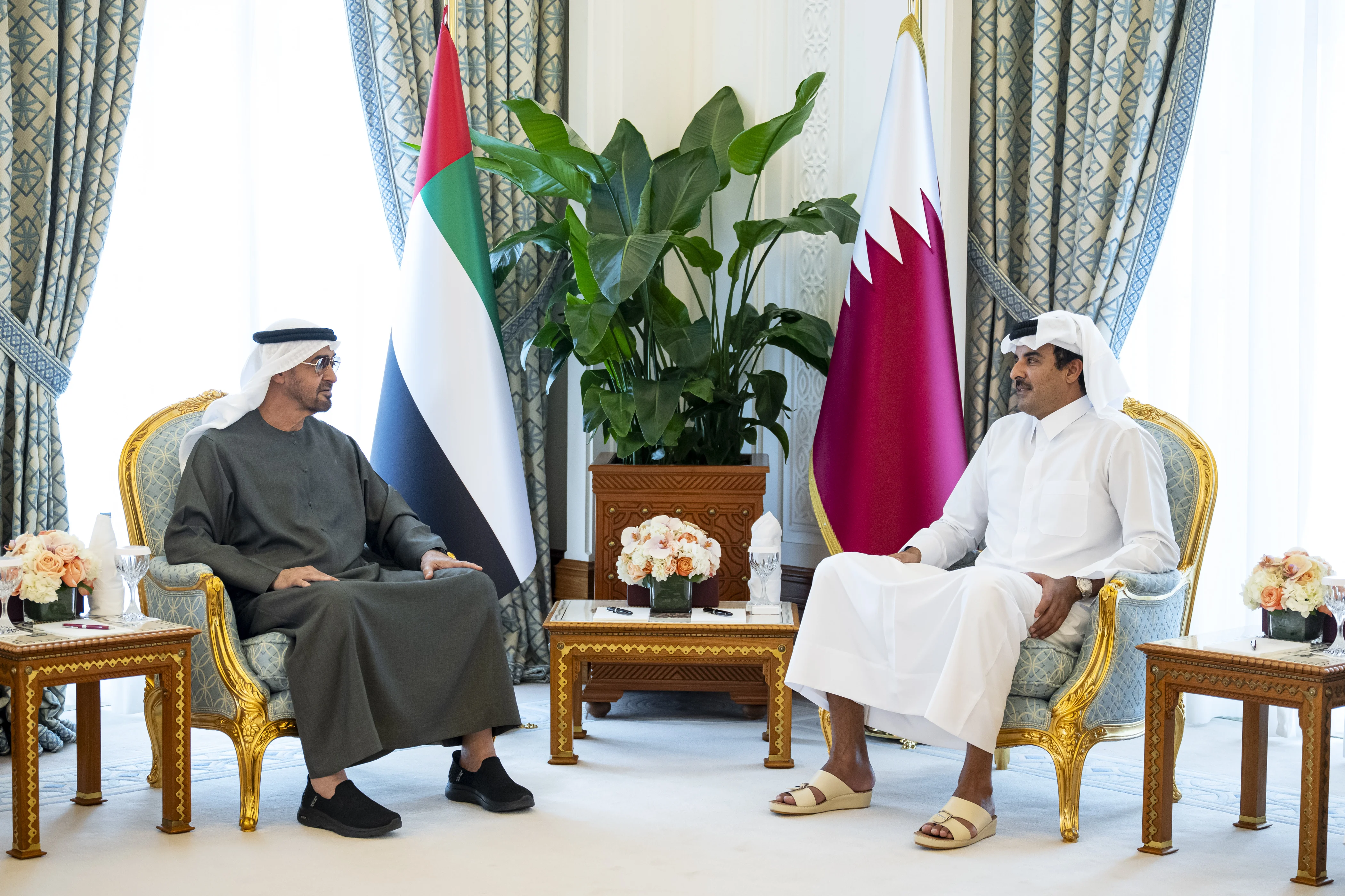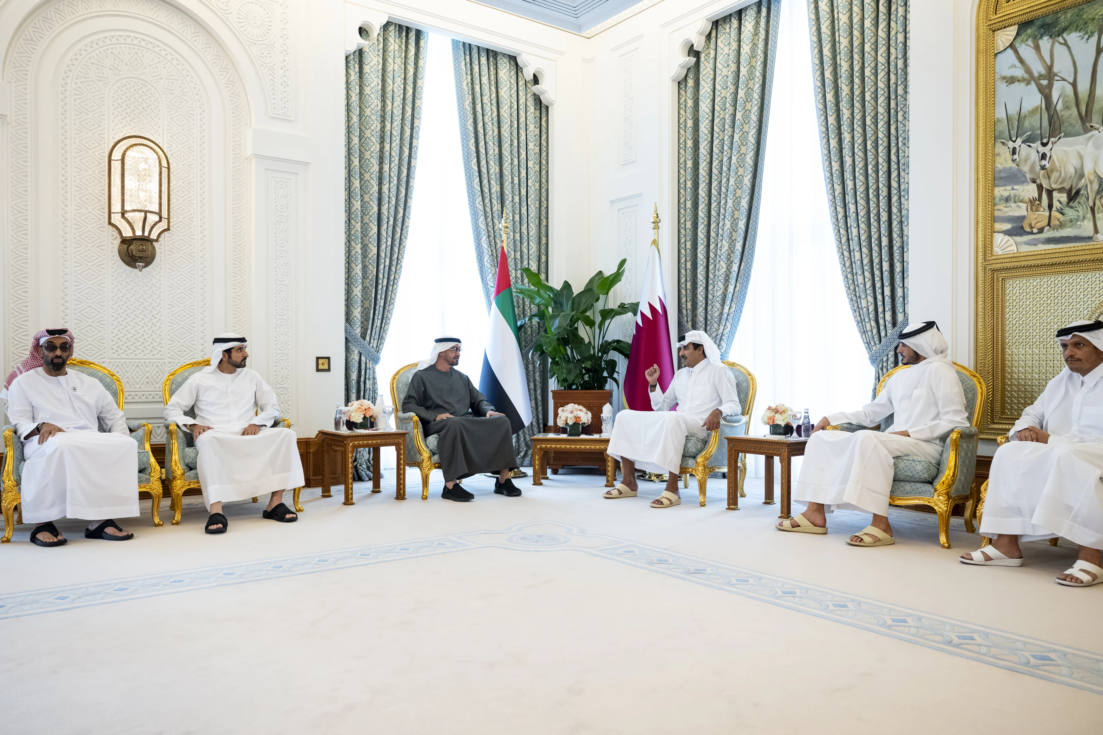 President His Highness Sheikh Mohamed bin Zayed Al Nahyan met today with His Highness Sheikh Tamim bin Hamad Al Thani, Emir of the State of Qatar, to discuss the strong ties between the two countries and the repercussions of the Israeli attack on Qatari territory.