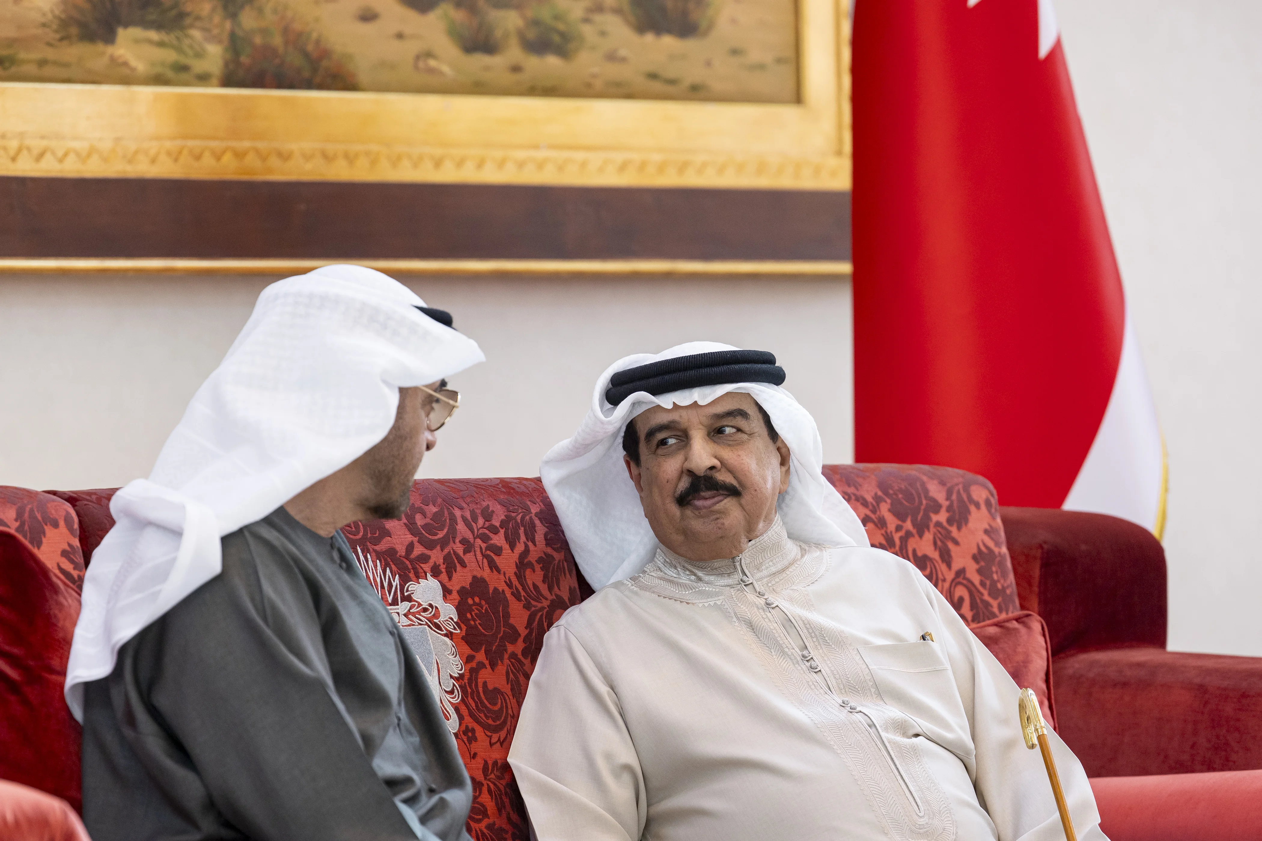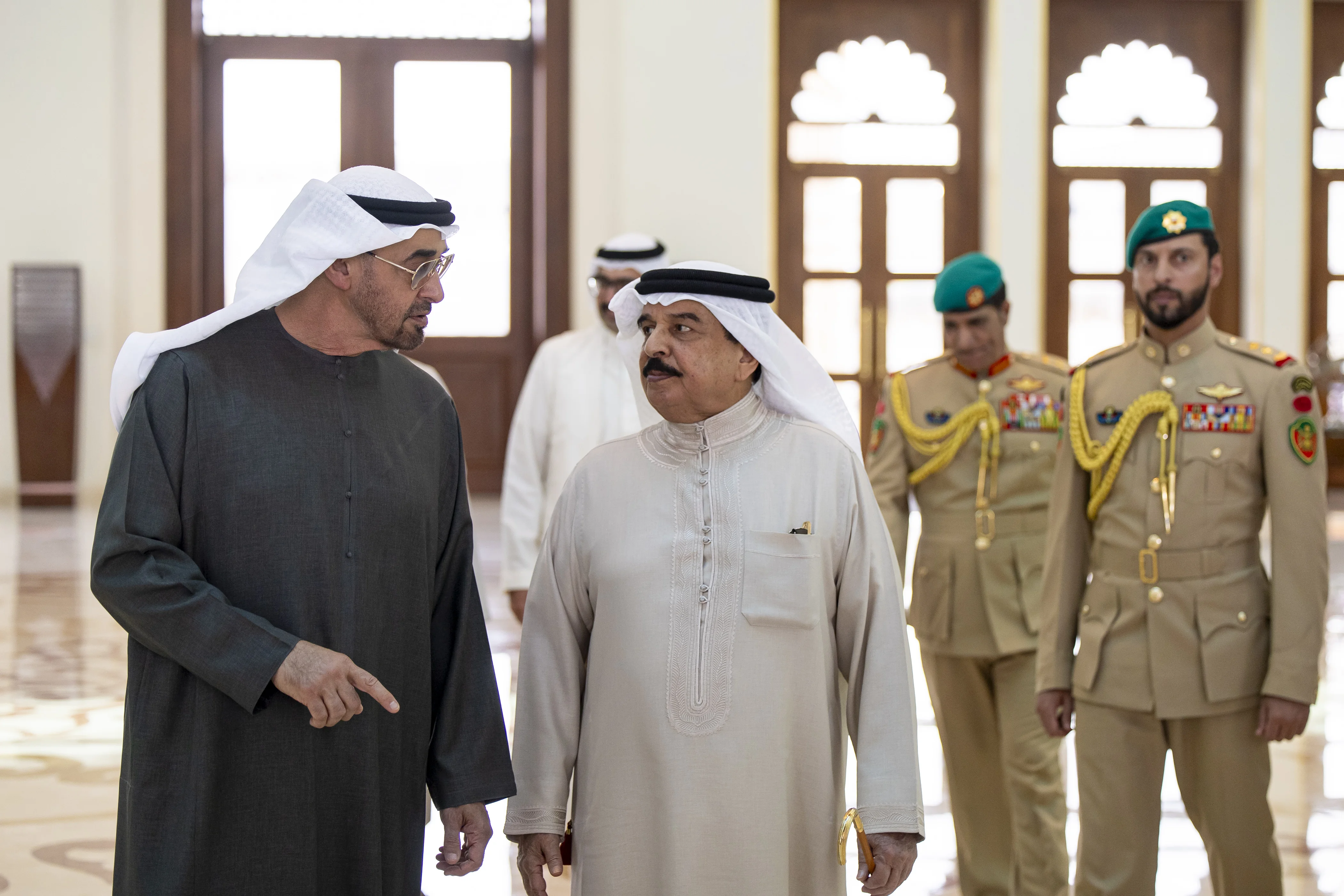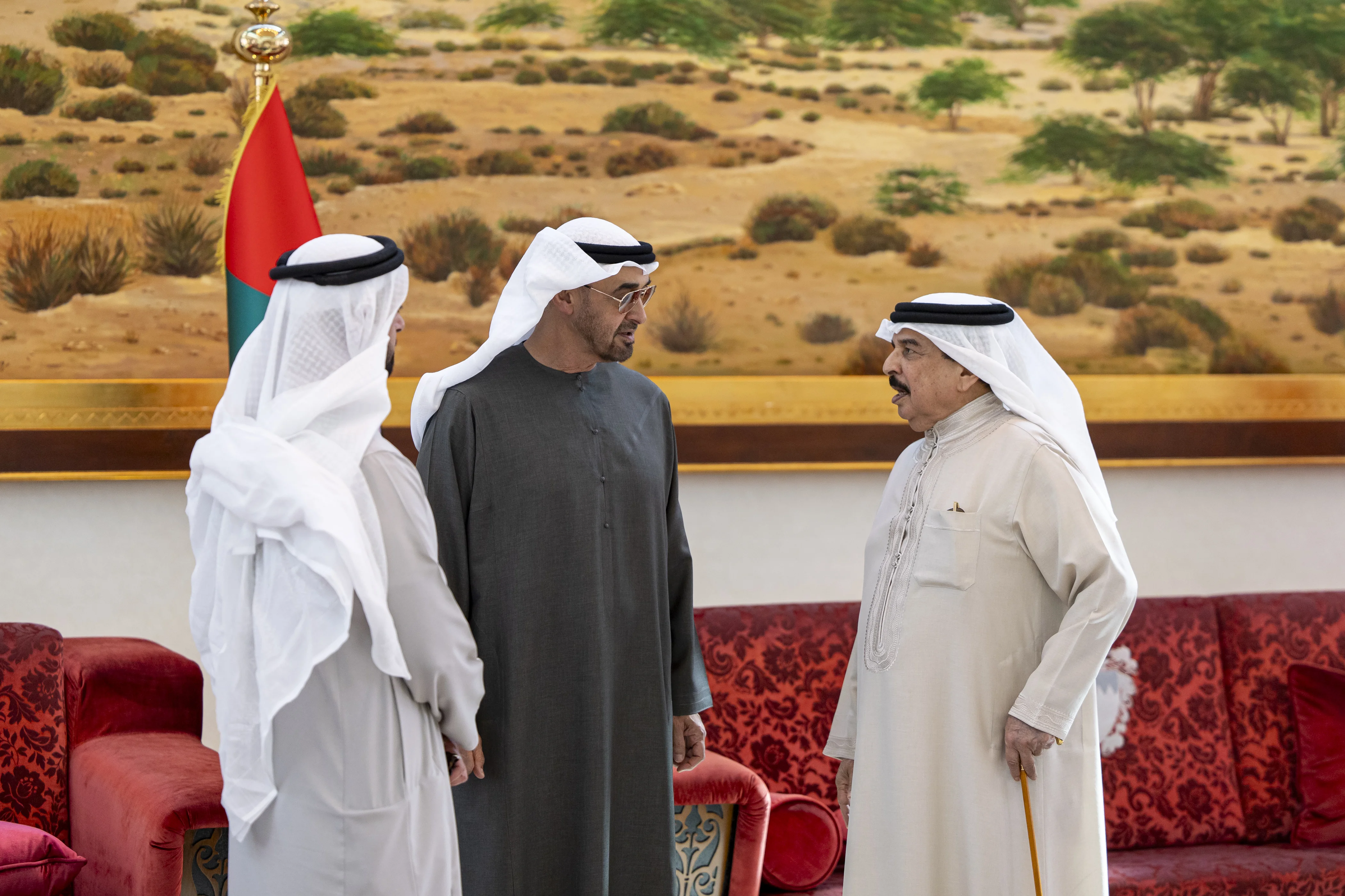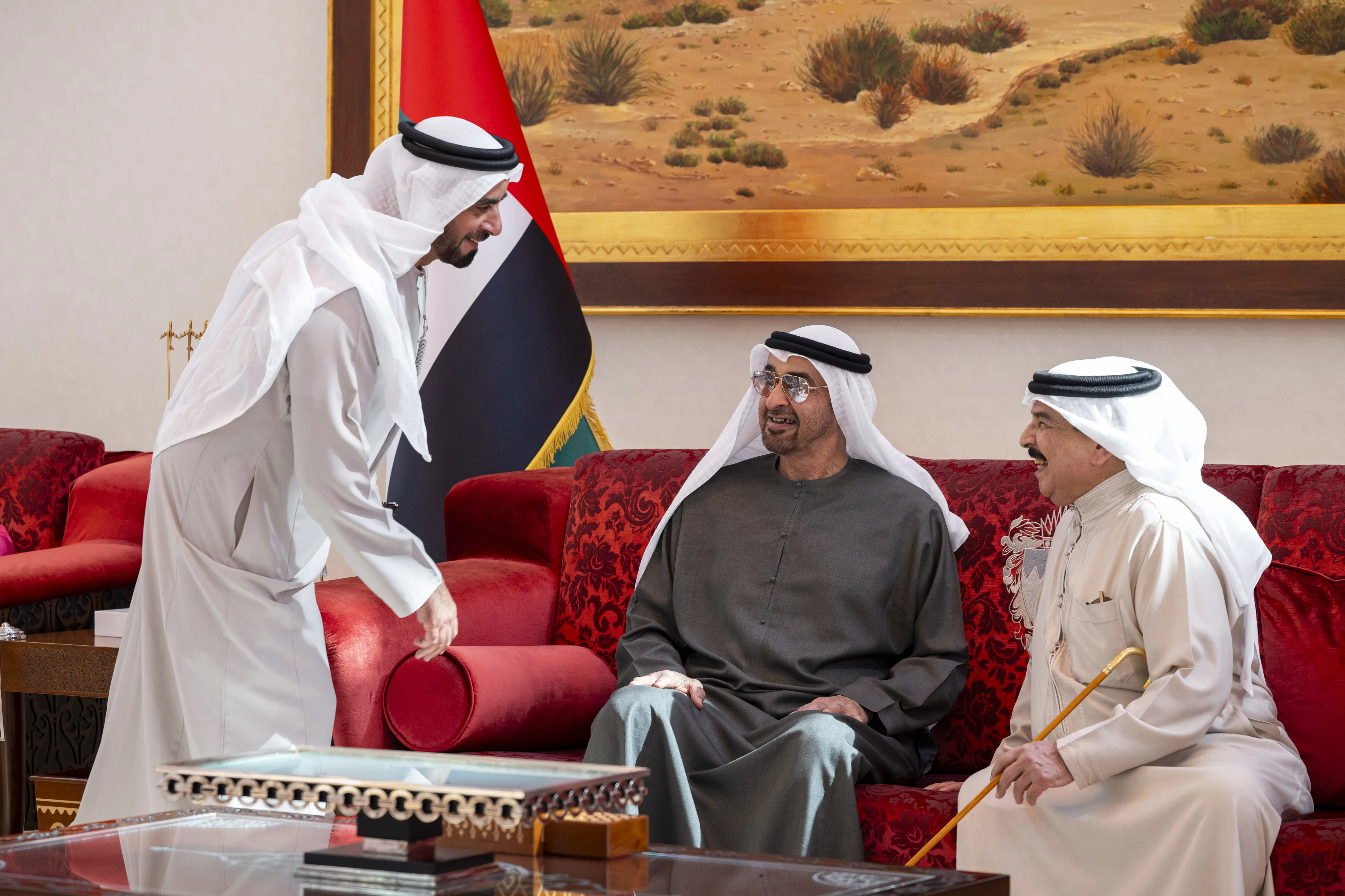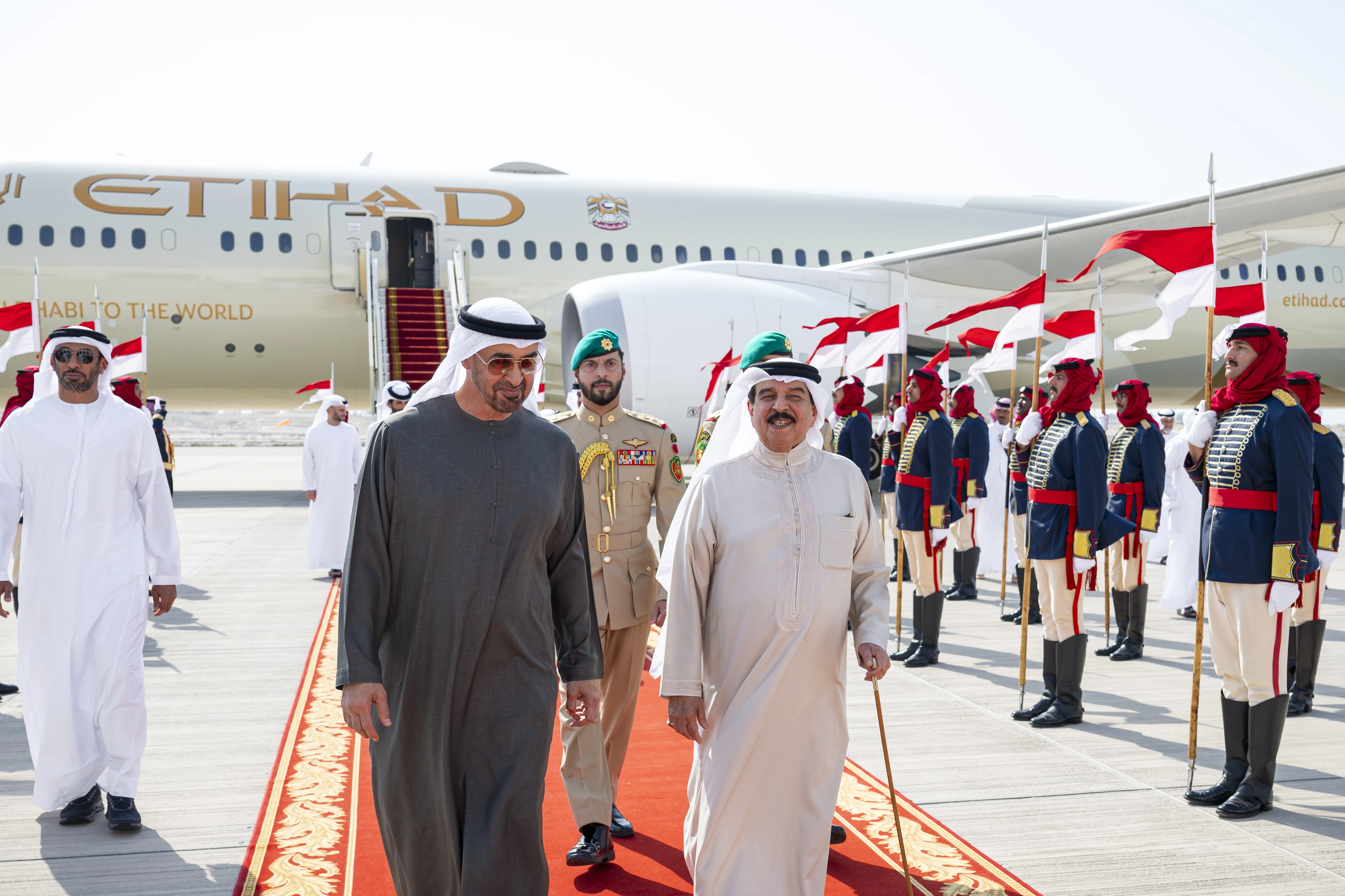 His Highness is accompanied by a delegation that includes H.H. Lt. General Sheikh Saif bin Zayed Al Nahyan, Deputy Prime Minister and Minister of the Interior; H.H. Sheikh Theyab bin Mohamed bin Zayed Al Nahyan, Deputy Chairman of the Presidential Court for Development and Fallen Heroes' Affairs; H.H. Sheikh Hamdan bin Mohamed bin Zayed Al Nahyan, Deputy Chairman of the Presidential Court for Special Affairs; Sheikh Mohammed bin Hamad bin Tahnoon Al Nahyan, Advisor to the UAE President; Ali bin Hammad Al Shamsi, Secretary-General of the Supreme Council for National Security; Dr. Ahmed Mubarak Ali Al Mazrouei, Chairman of the President’s Office for Strategic Affairs and Chairman of the Abu Dhabi Executive Office; Dr. Sultan bin Ahmed Al Jaber, Minister of Industry and Advanced Technology; Faisal Abdulaziz Al Bannai, Adviser to the UAE President for Strategic Research and Advanced Technology Affairs; Fahad Alameri, UAE Ambassador to Bahrain, and several top officials.