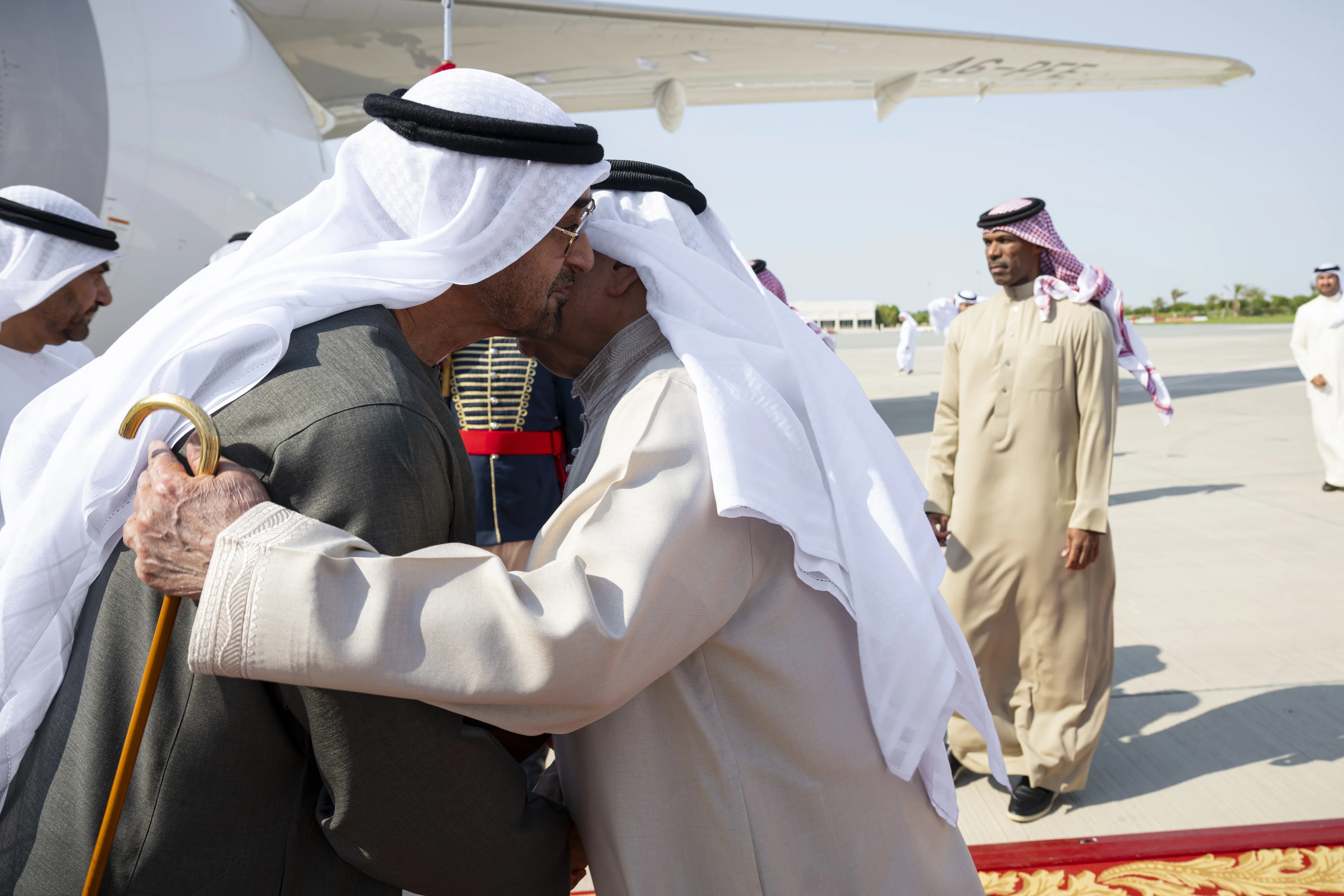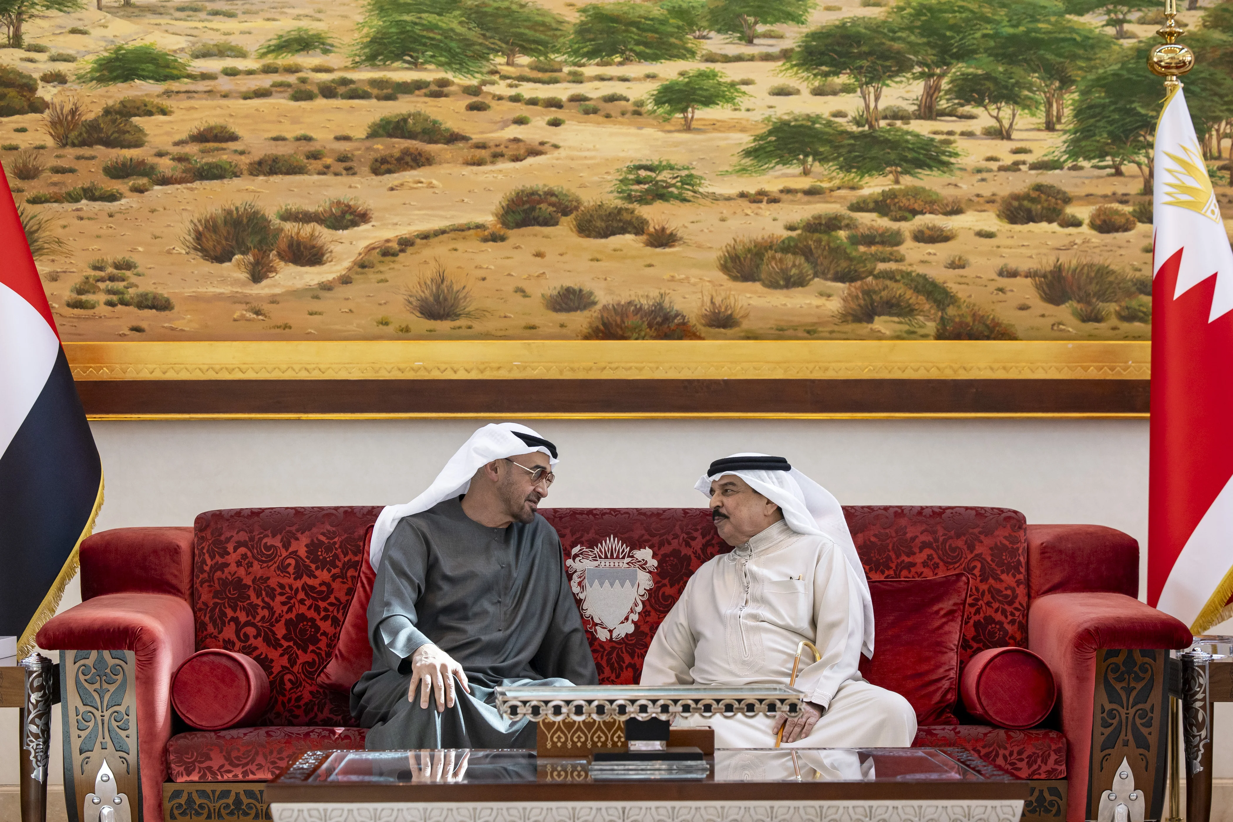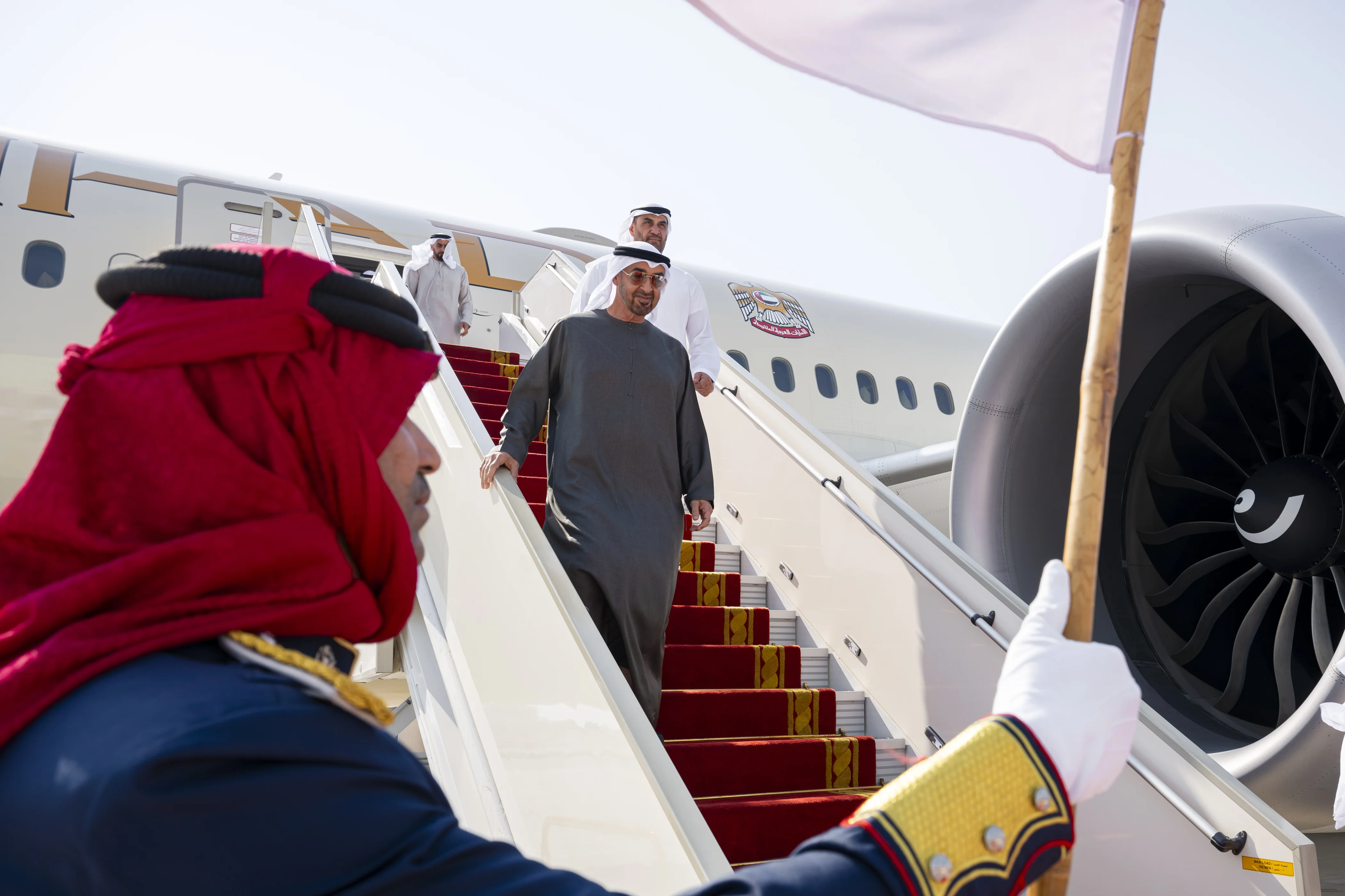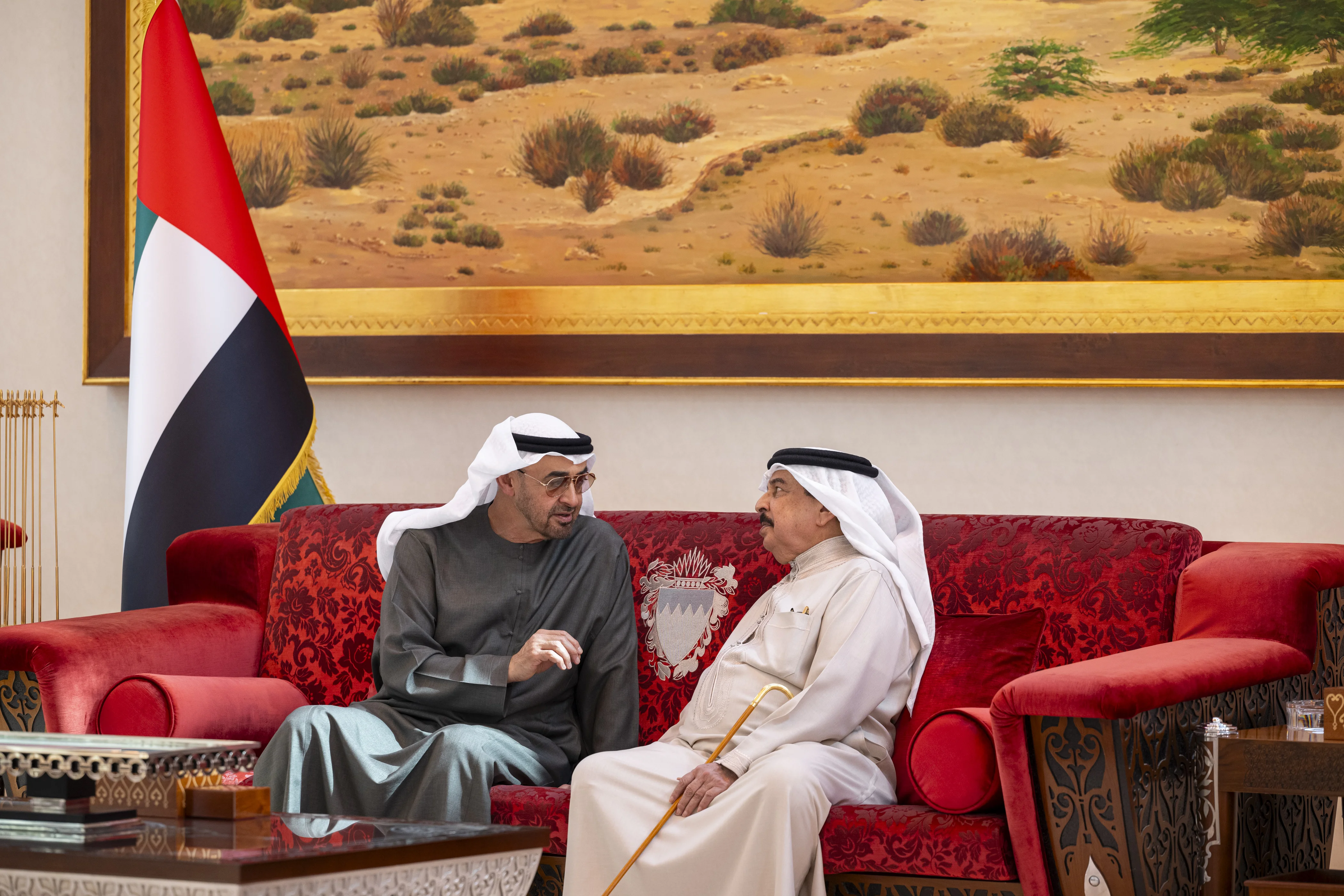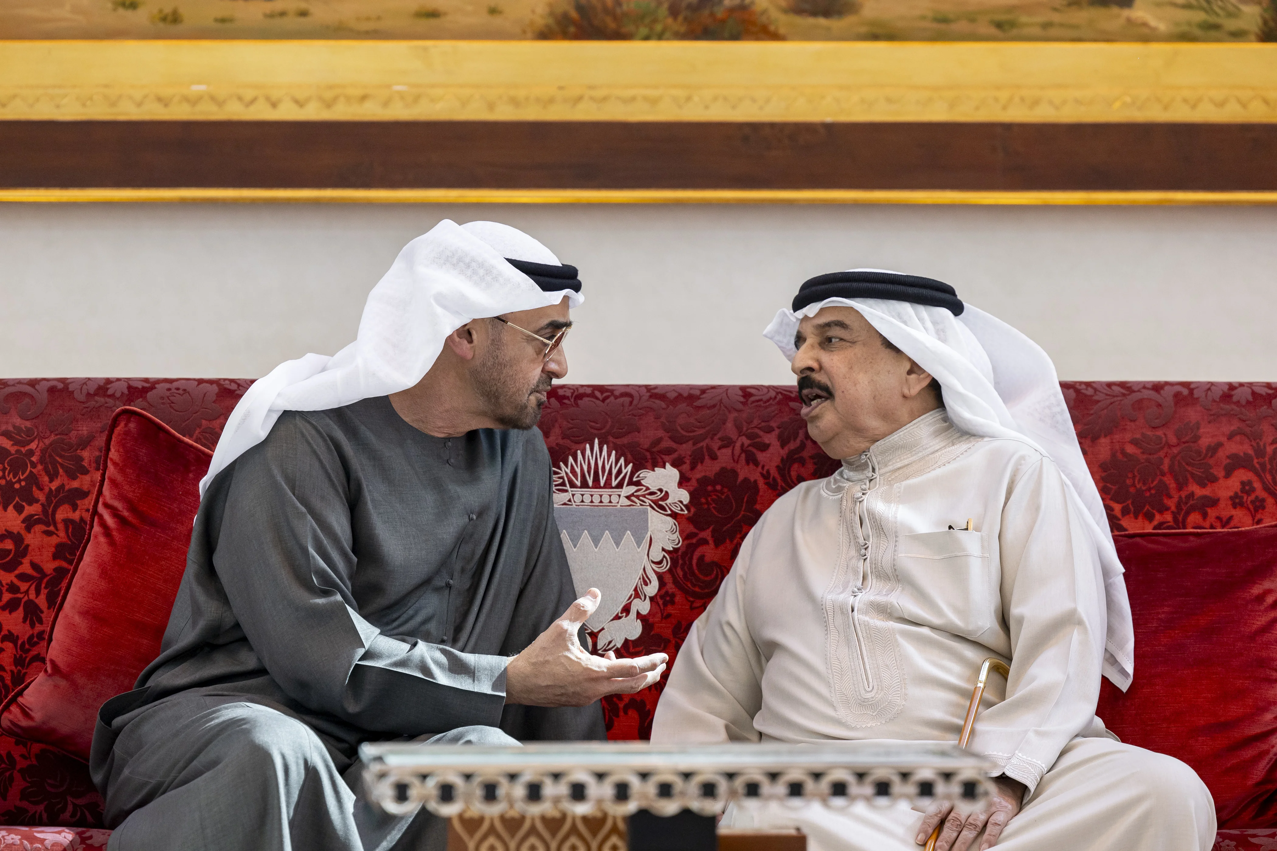 His Highness is accompanied by a delegation that includes H.H. Lt. General Sheikh Saif bin Zayed Al Nahyan, Deputy Prime Minister and Minister of the Interior; H.H. Sheikh Theyab bin Mohamed bin Zayed Al Nahyan, Deputy Chairman of the Presidential Court for Development and Fallen Heroes' Affairs; H.H. Sheikh Hamdan bin Mohamed bin Zayed Al Nahyan, Deputy Chairman of the Presidential Court for Special Affairs; Sheikh Mohammed bin Hamad bin Tahnoon Al Nahyan, Advisor to the UAE President; Ali bin Hammad Al Shamsi, Secretary-General of the Supreme Council for National Security; Dr. Ahmed Mubarak Ali Al Mazrouei, Chairman of the President’s Office for Strategic Affairs and Chairman of the Abu Dhabi Executive Office; Dr. Sultan bin Ahmed Al Jaber, Minister of Industry and Advanced Technology; Faisal Abdulaziz Al Bannai, Adviser to the UAE President for Strategic Research and Advanced Technology Affairs; Fahad Alameri, UAE Ambassador to Bahrain, and several top officials.