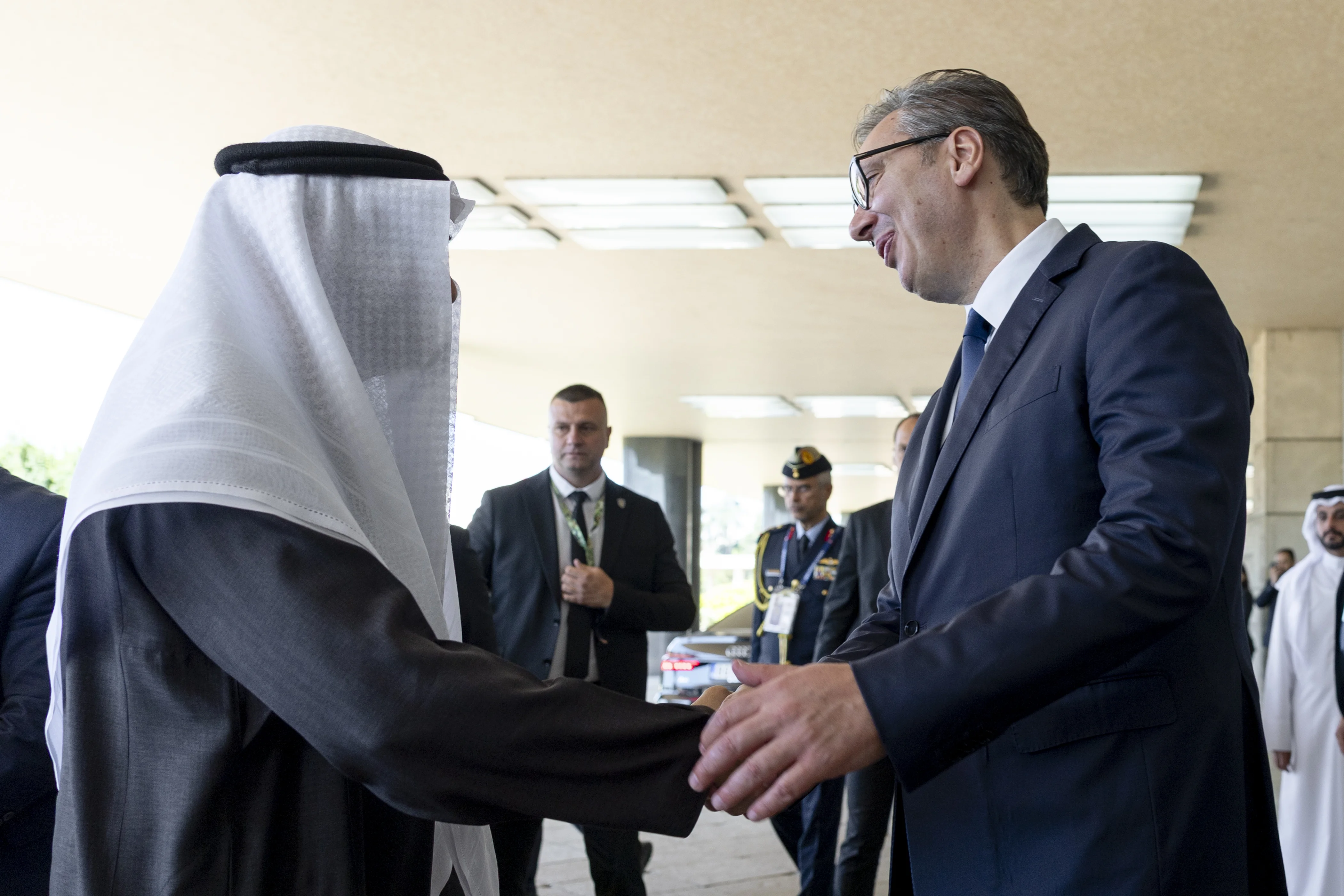H.H. was welcomed by President Vučić and senior Serbian officials upon his arrival at the Palace of Serbia in Belgrade, in front of which the parade took place.