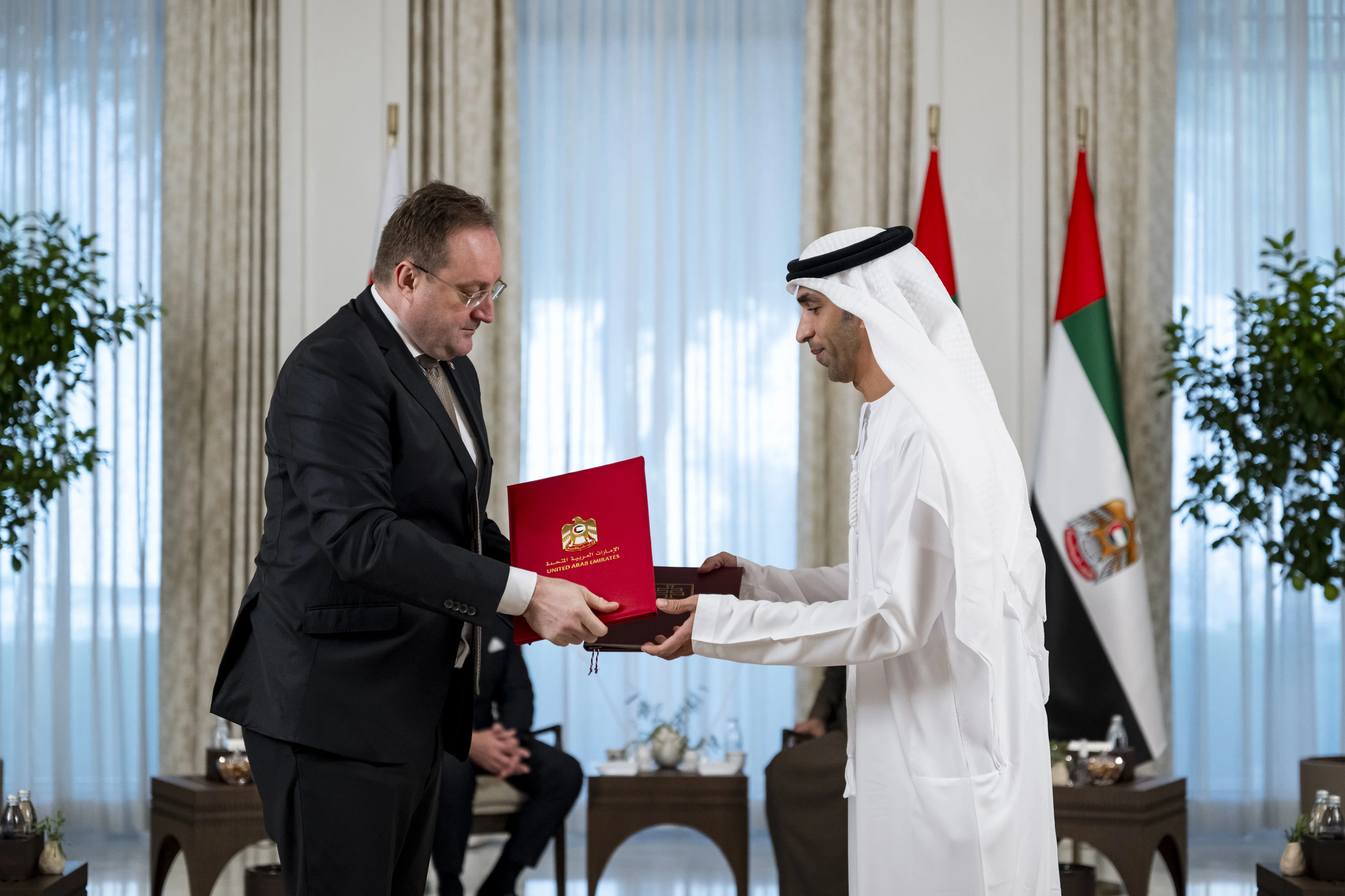 His Highness the UAE President and the Slovak Prime Minister also witnessed the exchange of a cooperation agreement in the economic field between the governments of the UAE and Slovakia, as well as a memorandum of understanding in the field of investment. The agreements were exchanged on behalf of the UAE by His Excellency Dr Thani bin Ahmed Al Zeyoudi, Minister of Foreign Trade, and on behalf of Slovakia by His Excellency Vladimír Šimoňák, State Secretary at the Ministry of Economy.