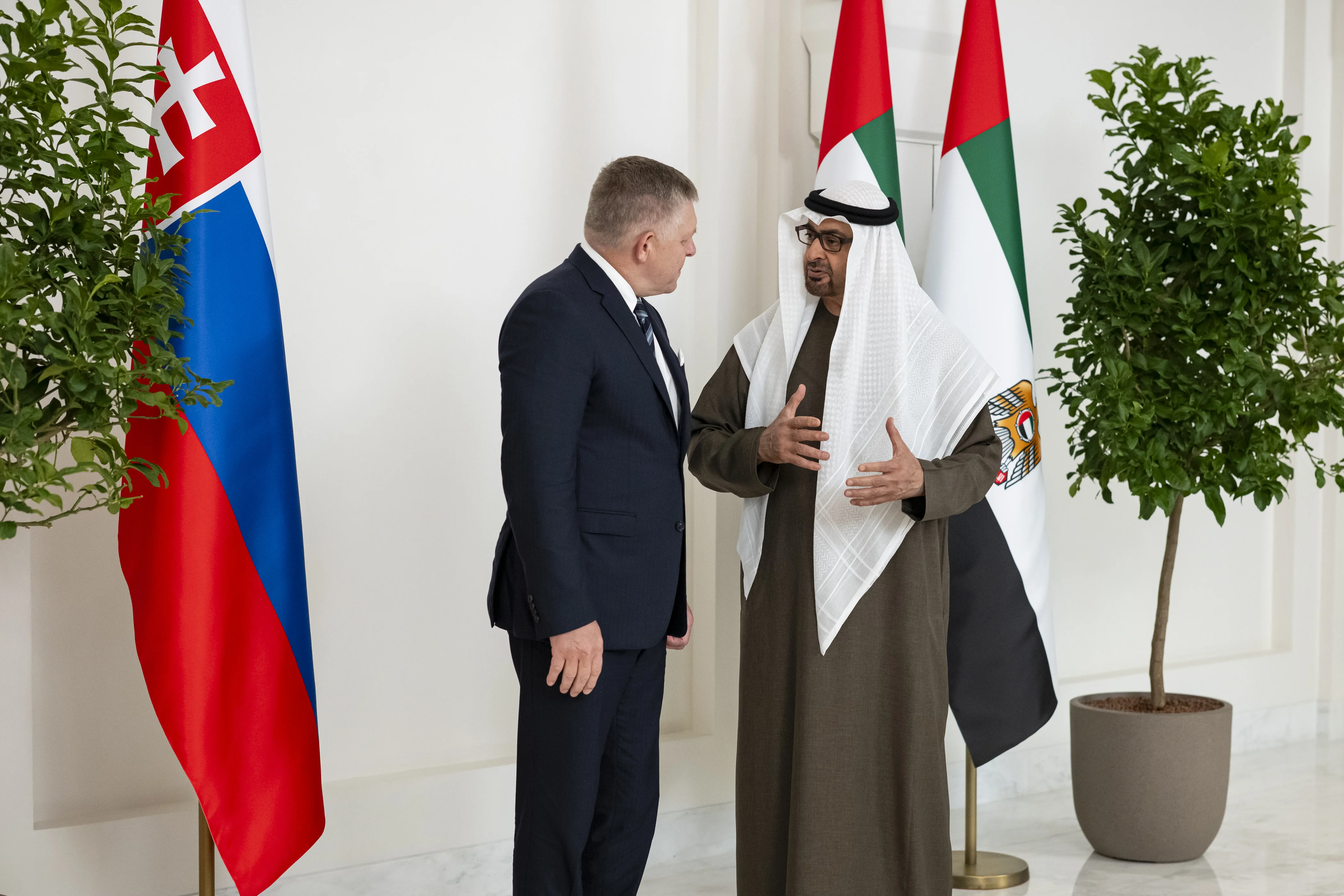 UAE President His Highness Sheikh Mohamed bin Zayed Al Nahyan and His Excellency Robert Fico, Prime Minister of the Slovak Republic, held talks today to explore ways to strengthen bilateral cooperation and expand prospects for development, particularly in areas such as the economy, trade, renewable energy, innovation, future technologies, and culture.