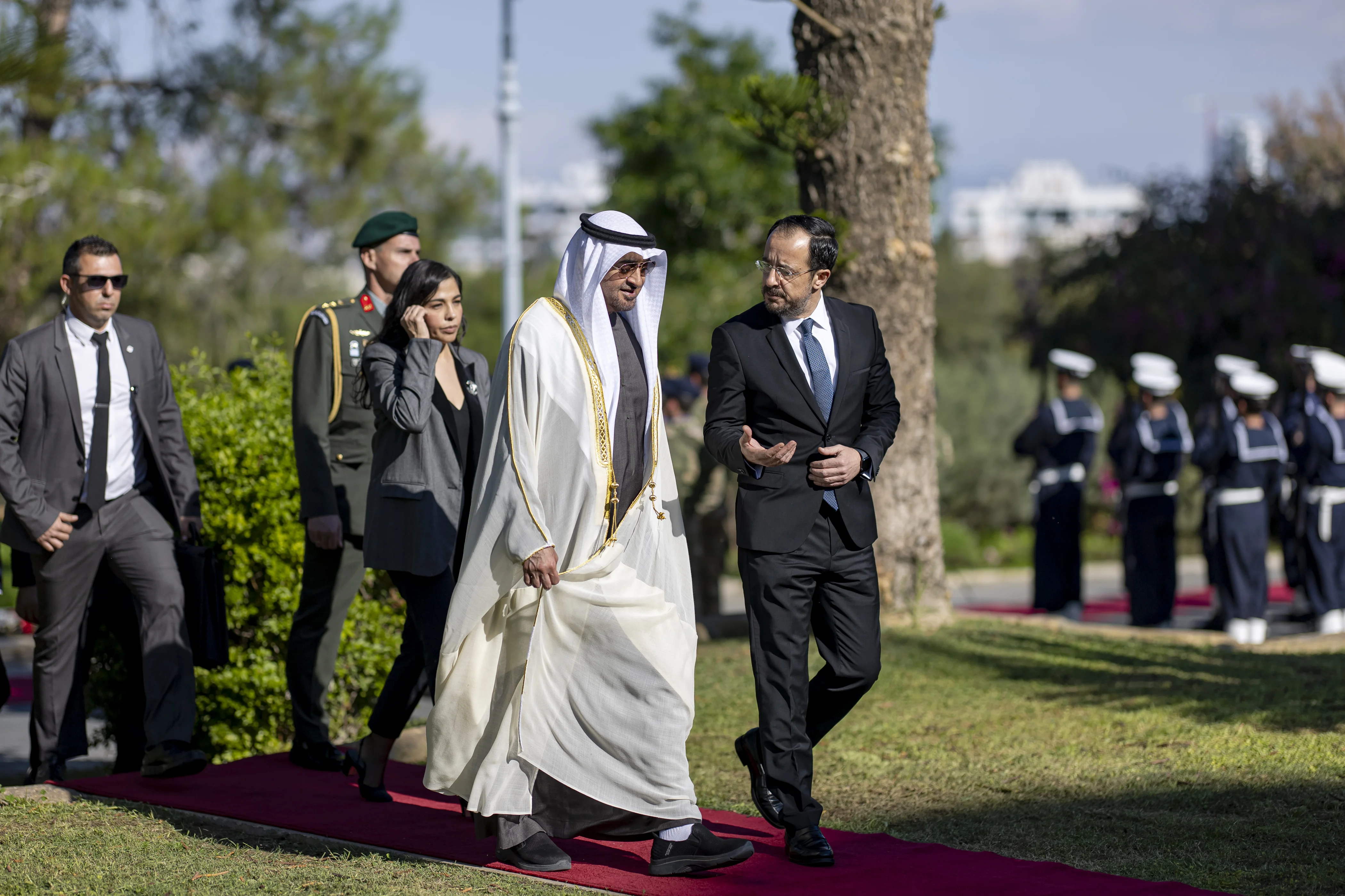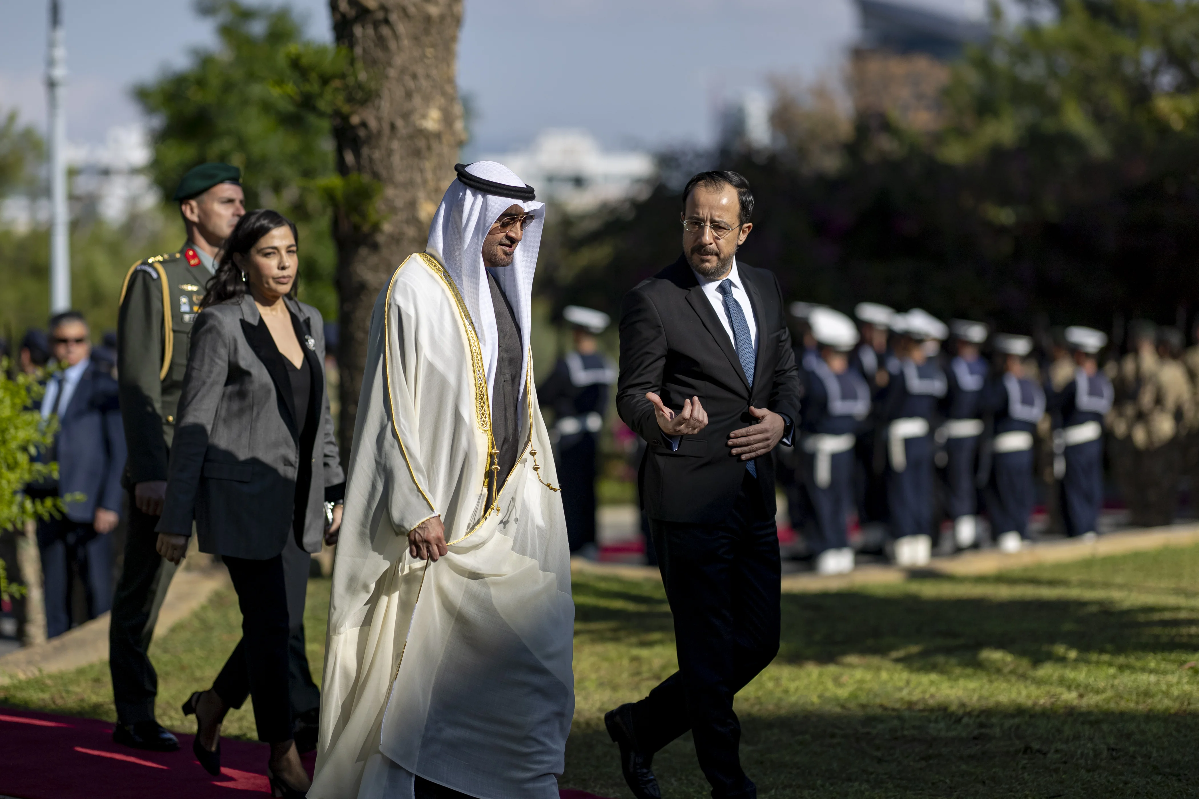 UAE President His Highness Sheikh Mohamed bin Zayed Al Nahyan arrived at the Presidential Palace in Nicosia, accompanied by the President of Cyprus His Excellency Nikos Christodoulides.