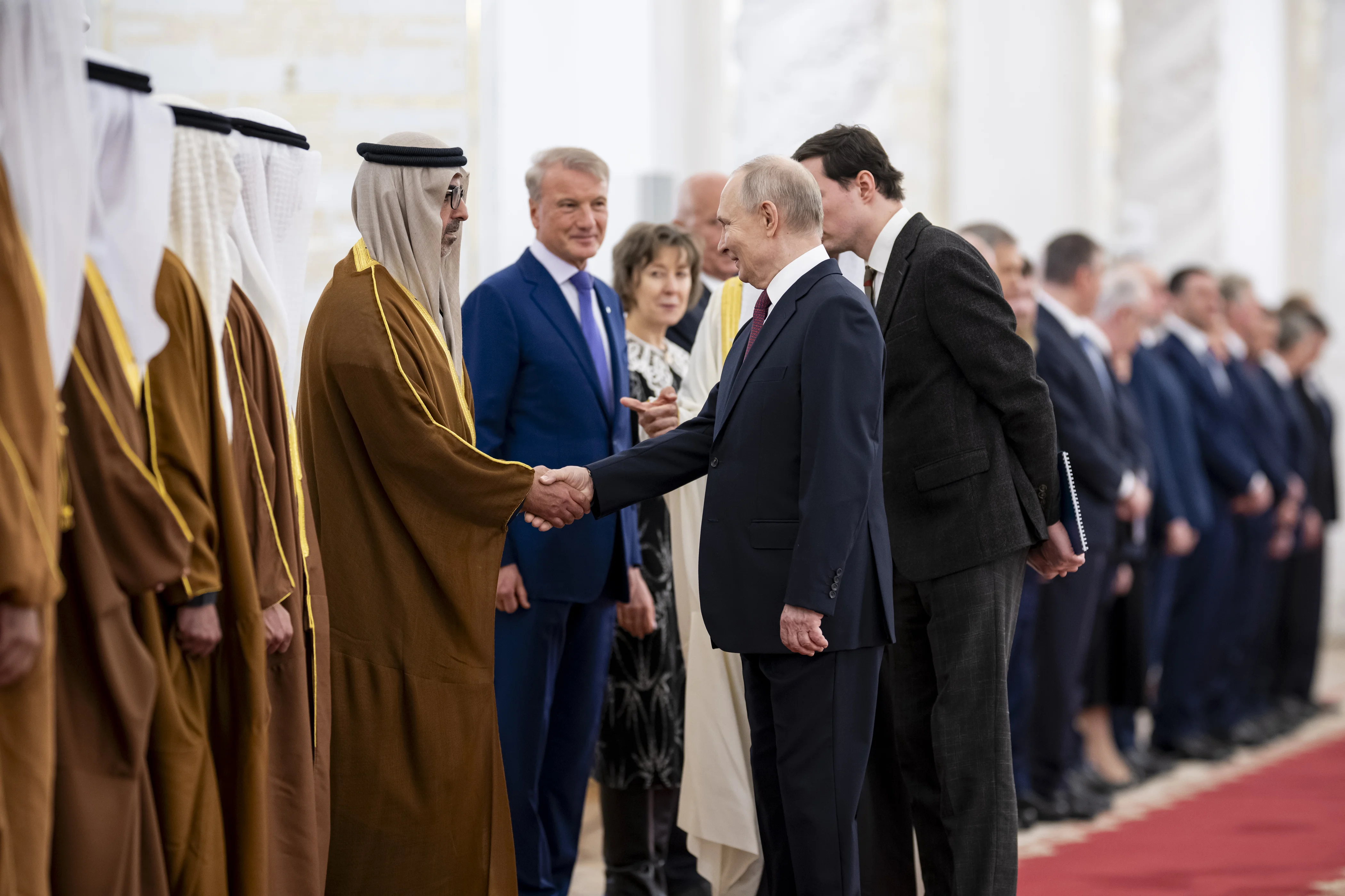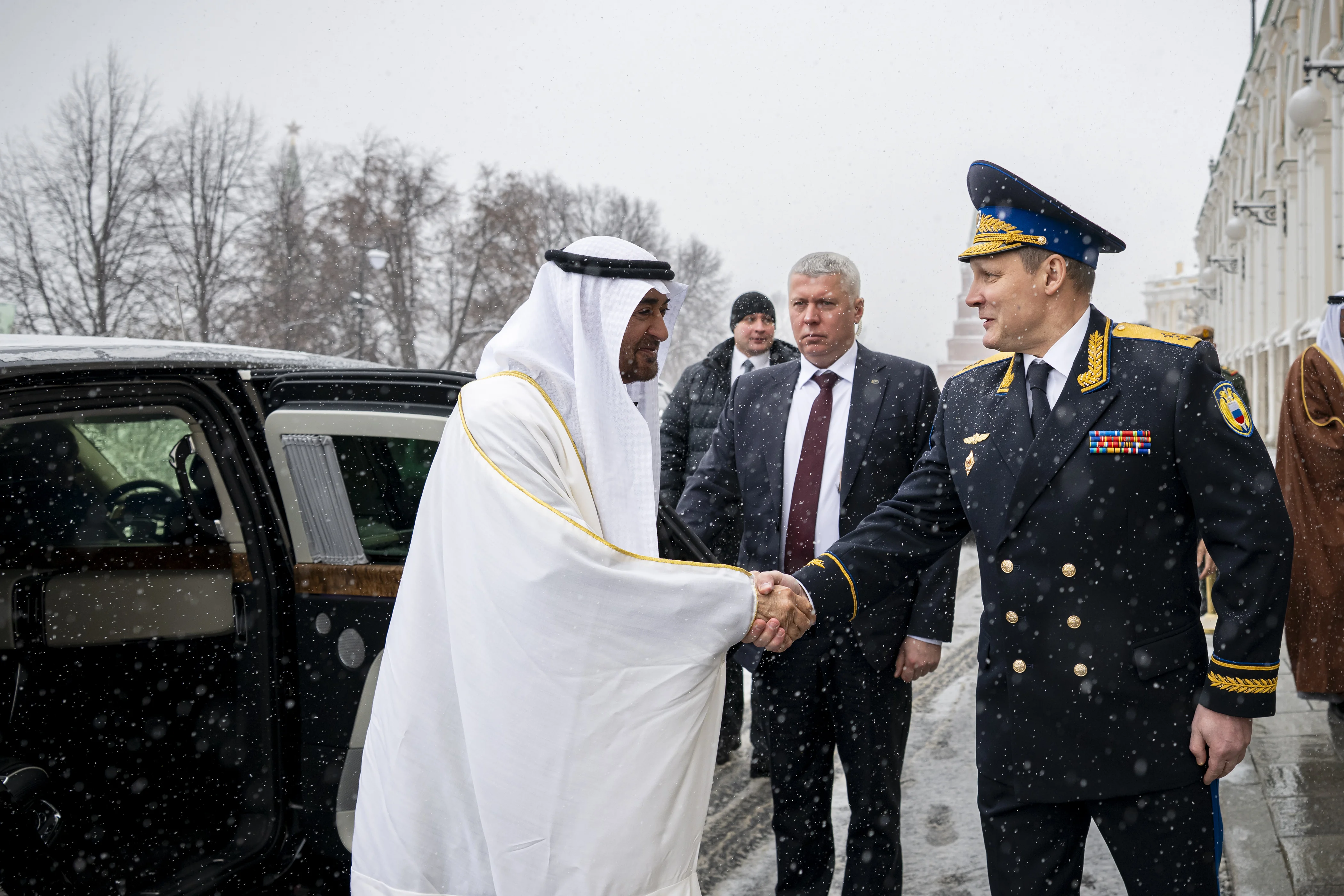 An official reception ceremony was held for His Highness upon his arrival at the Kremlin, where His Excellency Putin welcomed him, the two countries’ national anthems were played, and an honour guard and cavalry were present.