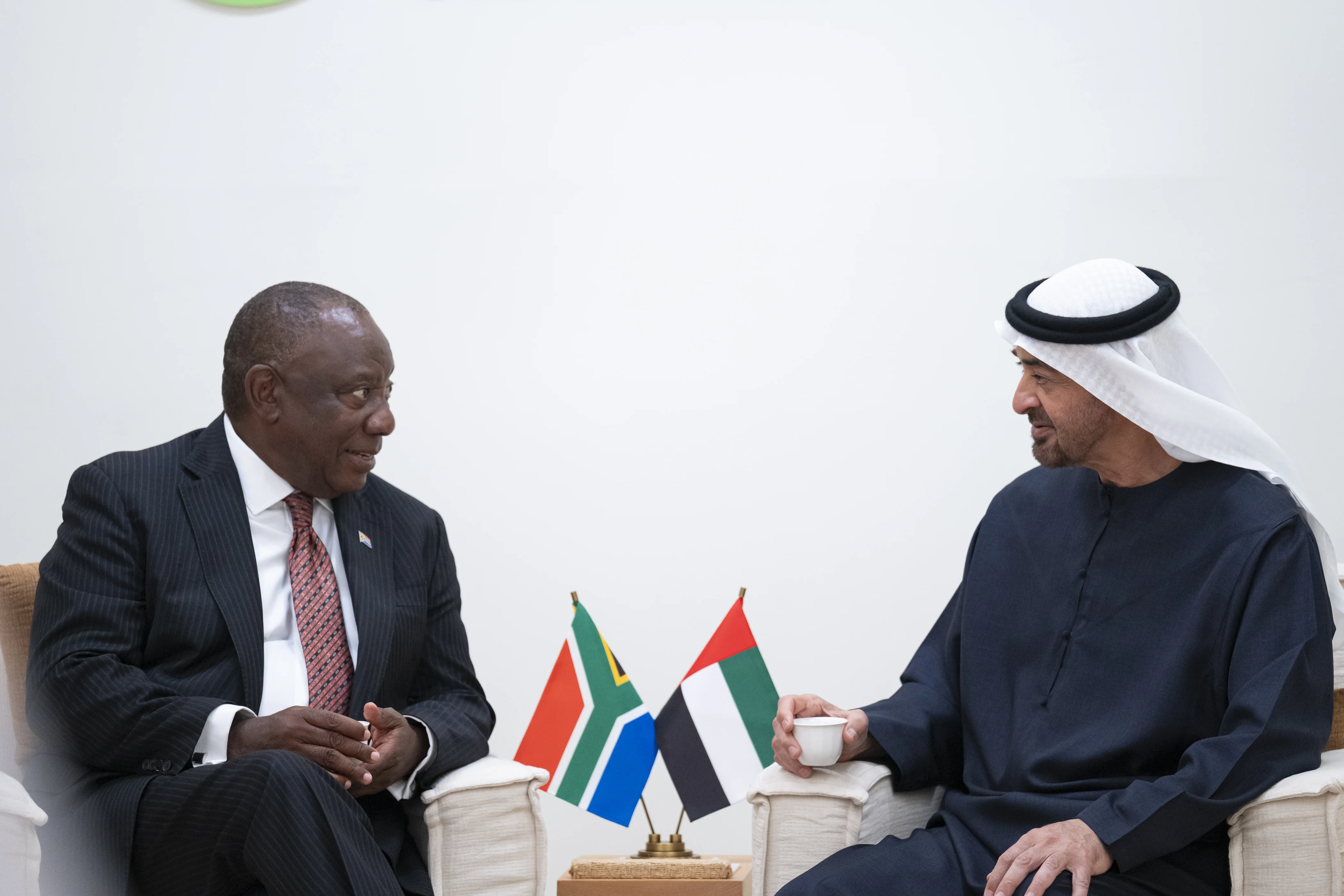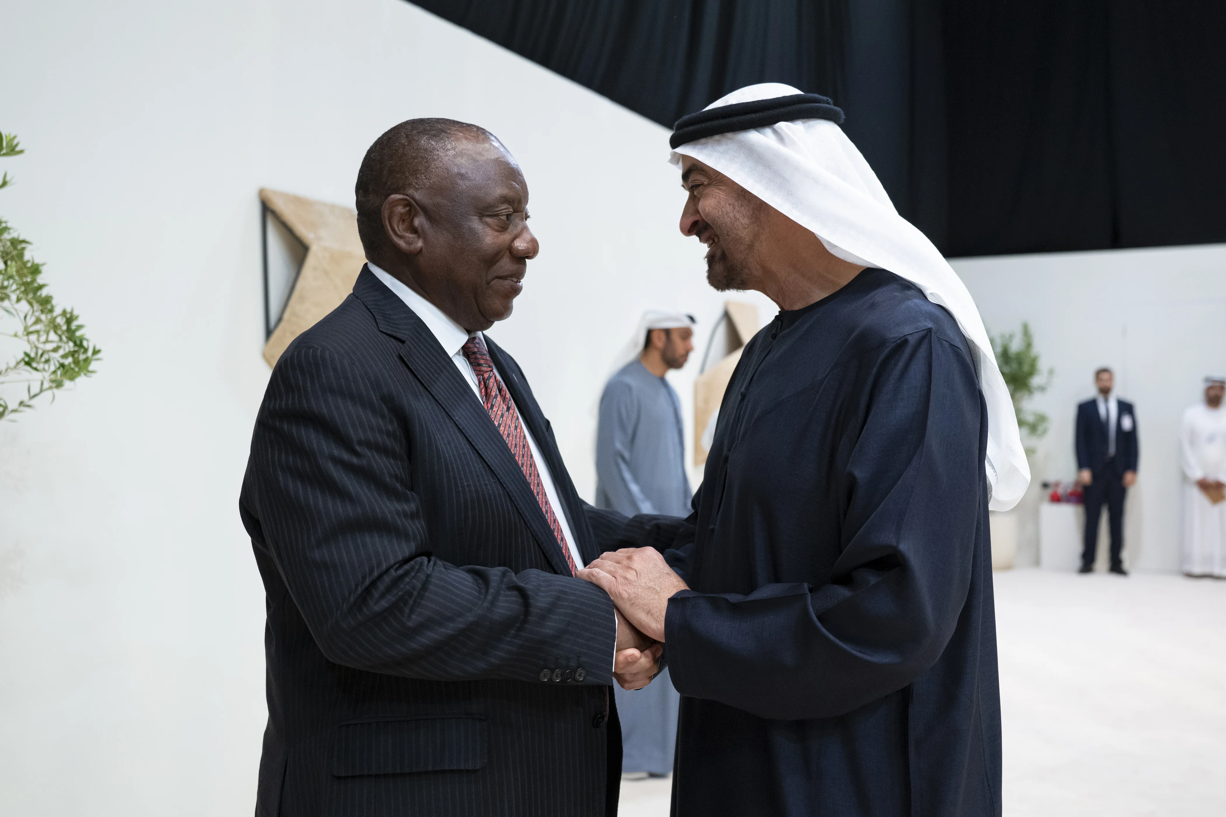 President His Highness Sheikh Mohamed bin Zayed Al Nahyan and His Excellency Cyril Ramaphosa, President of the Republic of South Africa, held talks today on ways to strengthen cooperation between the two countries across a range of fields, particularly in the areas of economy, trade, development, and sustainability.