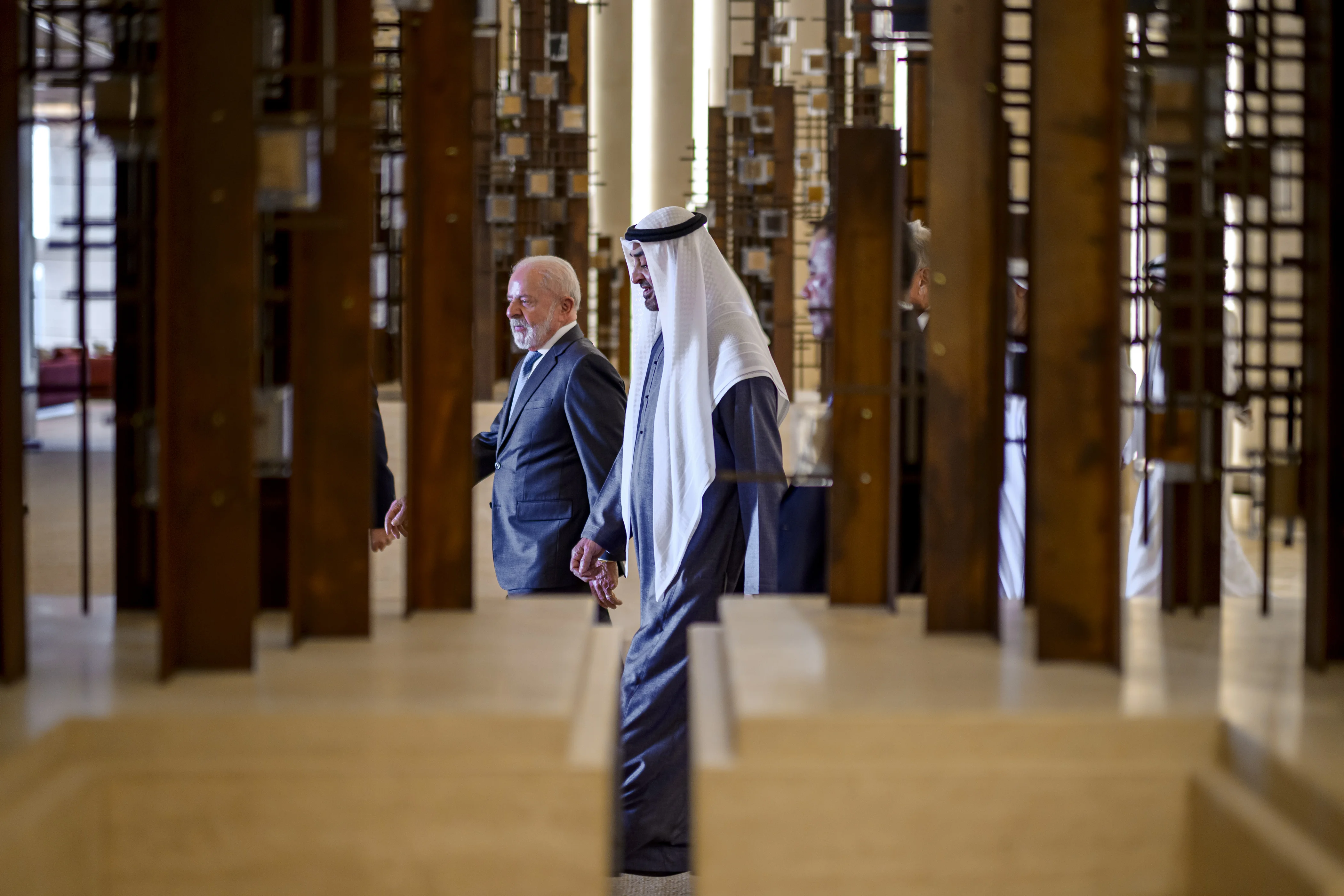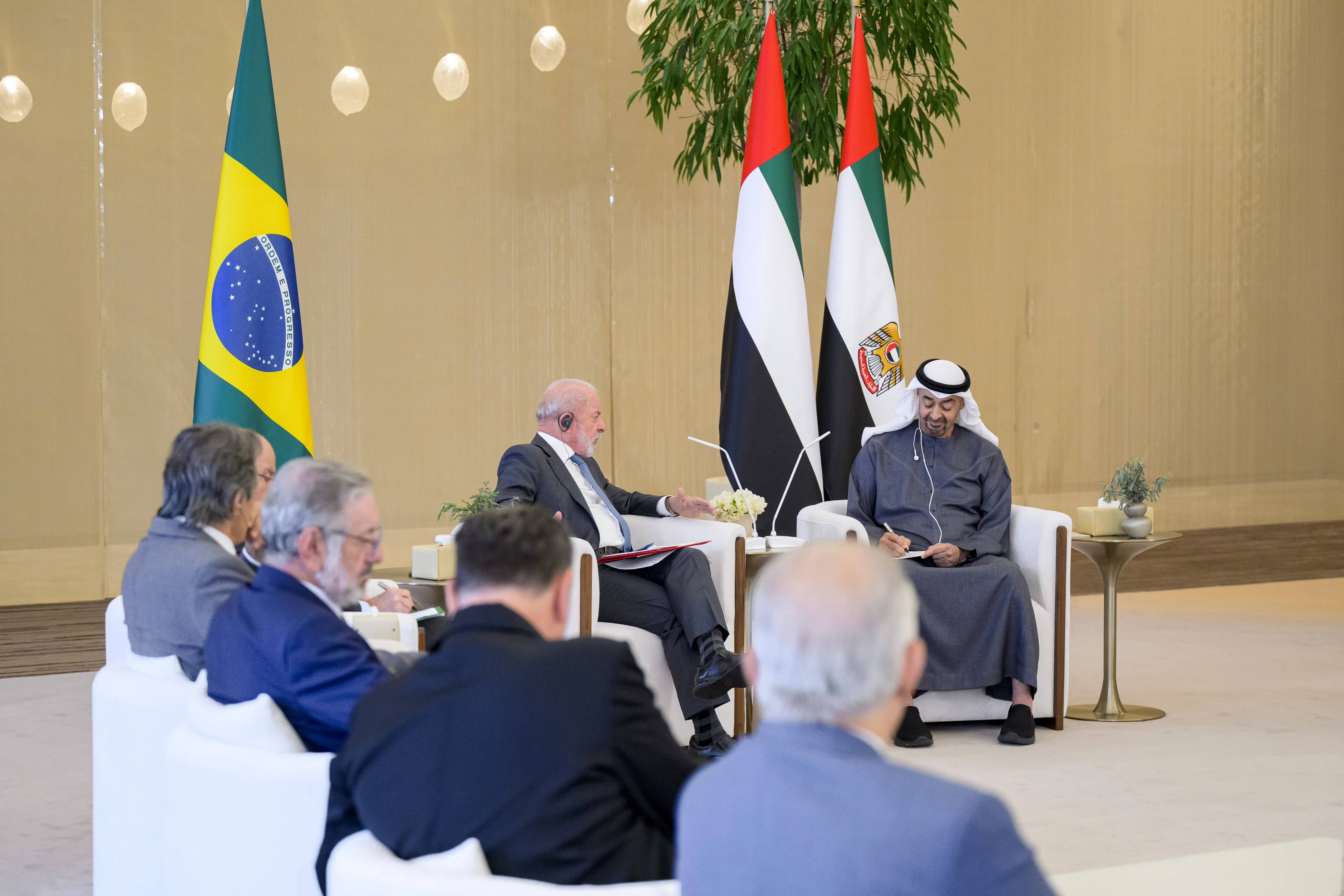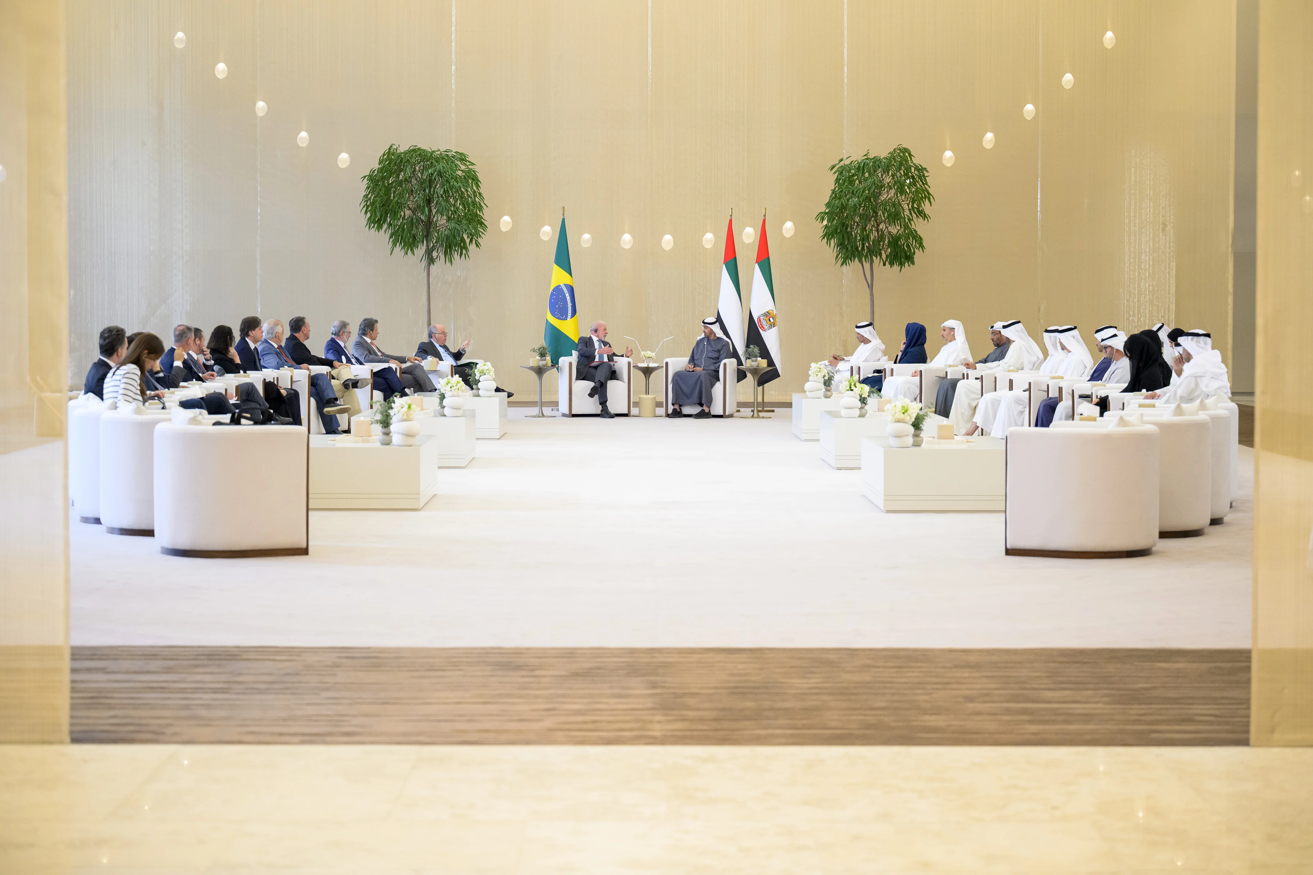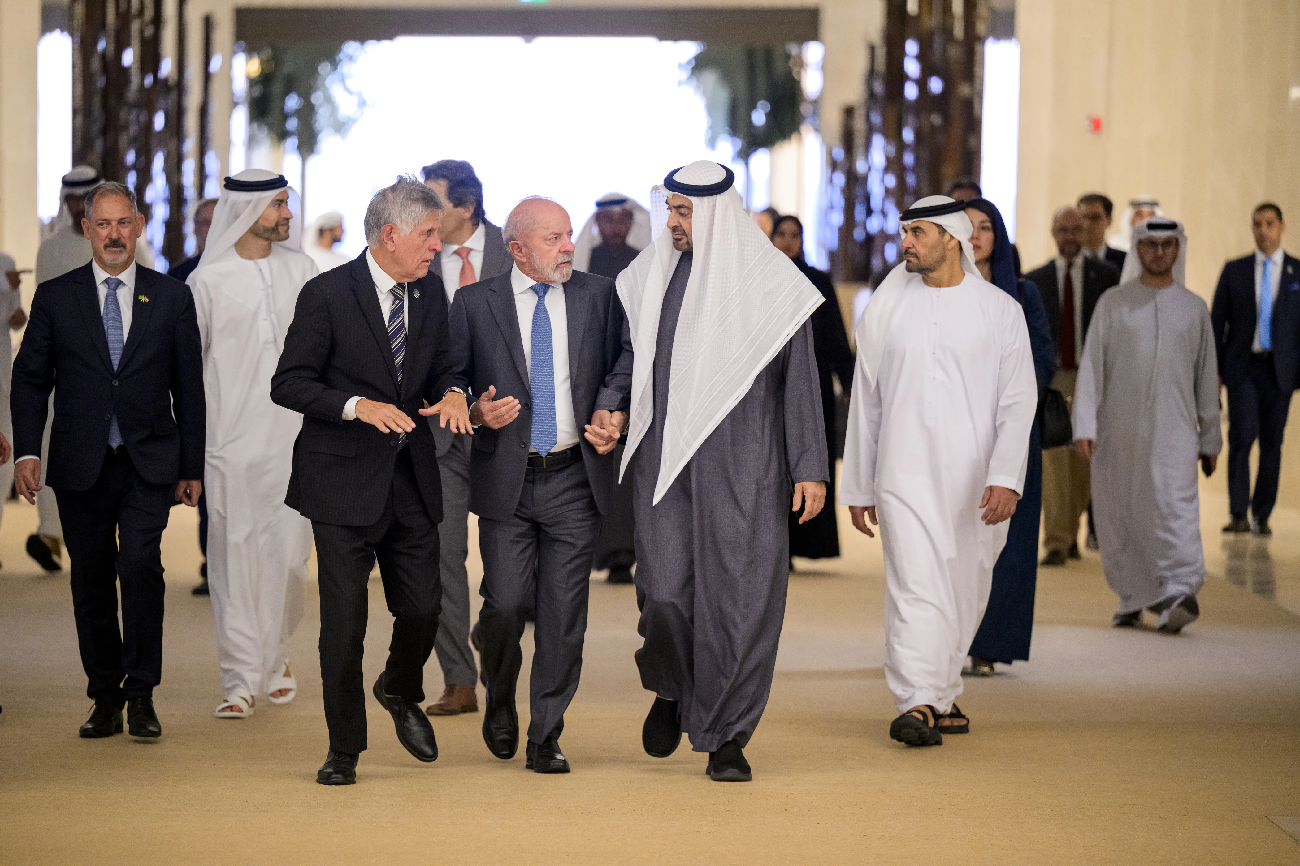 Upon his arrival in the UAE earlier in the day, President Lula da Silva was received at the Presidential Flight in Abu Dhabi by His Highness Sheikh Mohamed bin Zayed Al Nahyan, along with a number of sheikhs, ministers, and senior officials.