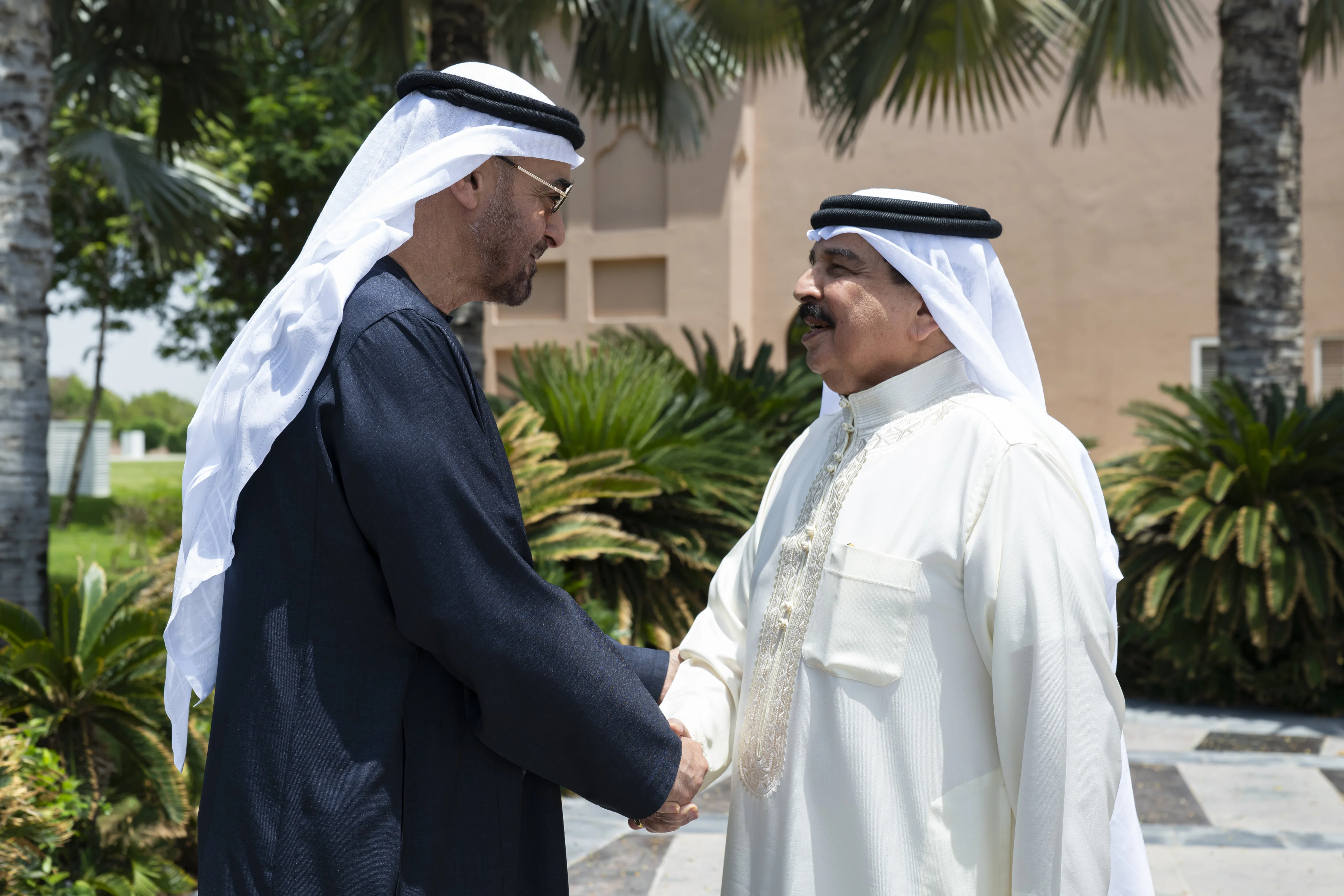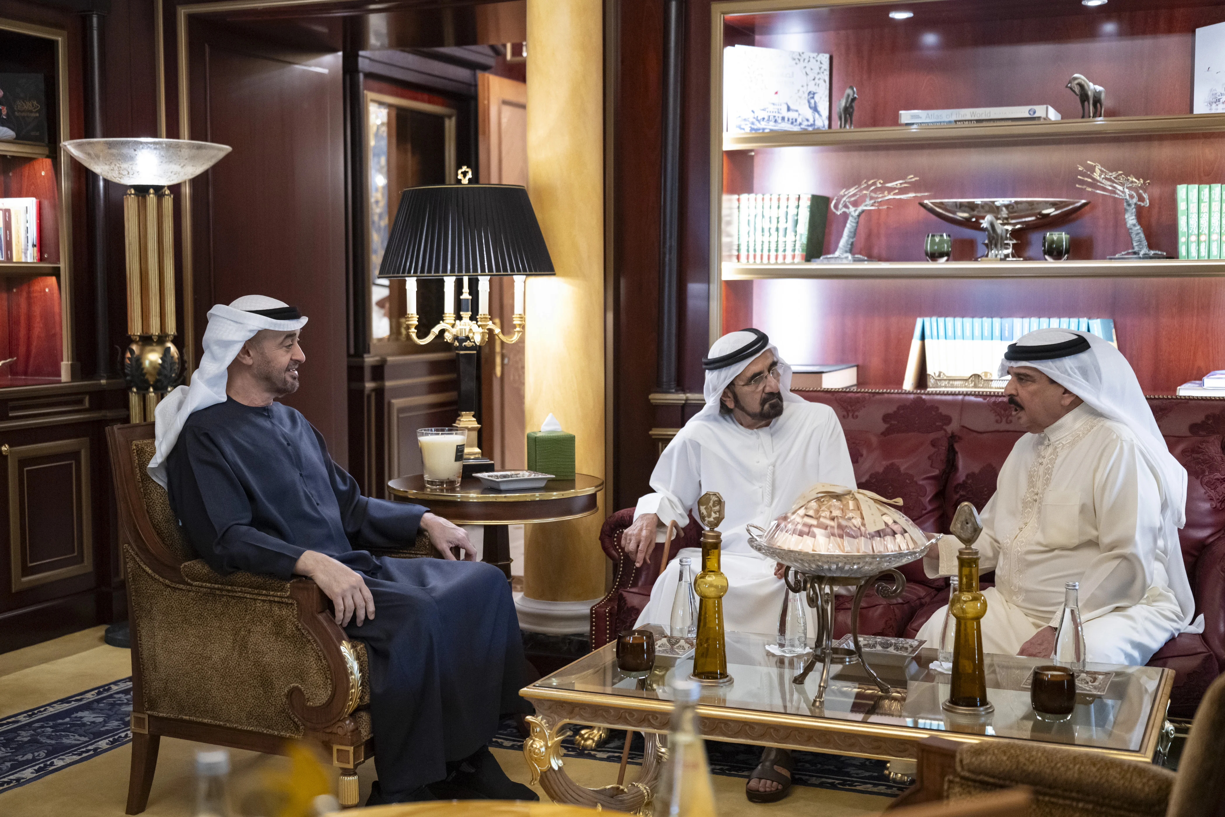 UAE President His Highness Sheikh Mohamed bin Zayed Al Nahyan met His Majesty King Hamad bin Isa Al Khalifa of the Kingdom of Bahrain, who is on a visit to the UAE, in the presence of His Highness Sheikh Mohammed bin Rashid Al Maktoum, Vice President, Prime Minister and Ruler of Dubai, and His Highness Sheikh Mansour bin Zayed Al Nahyan, Vice President, Deputy Prime Minister and Chairman of the Presidential Court.