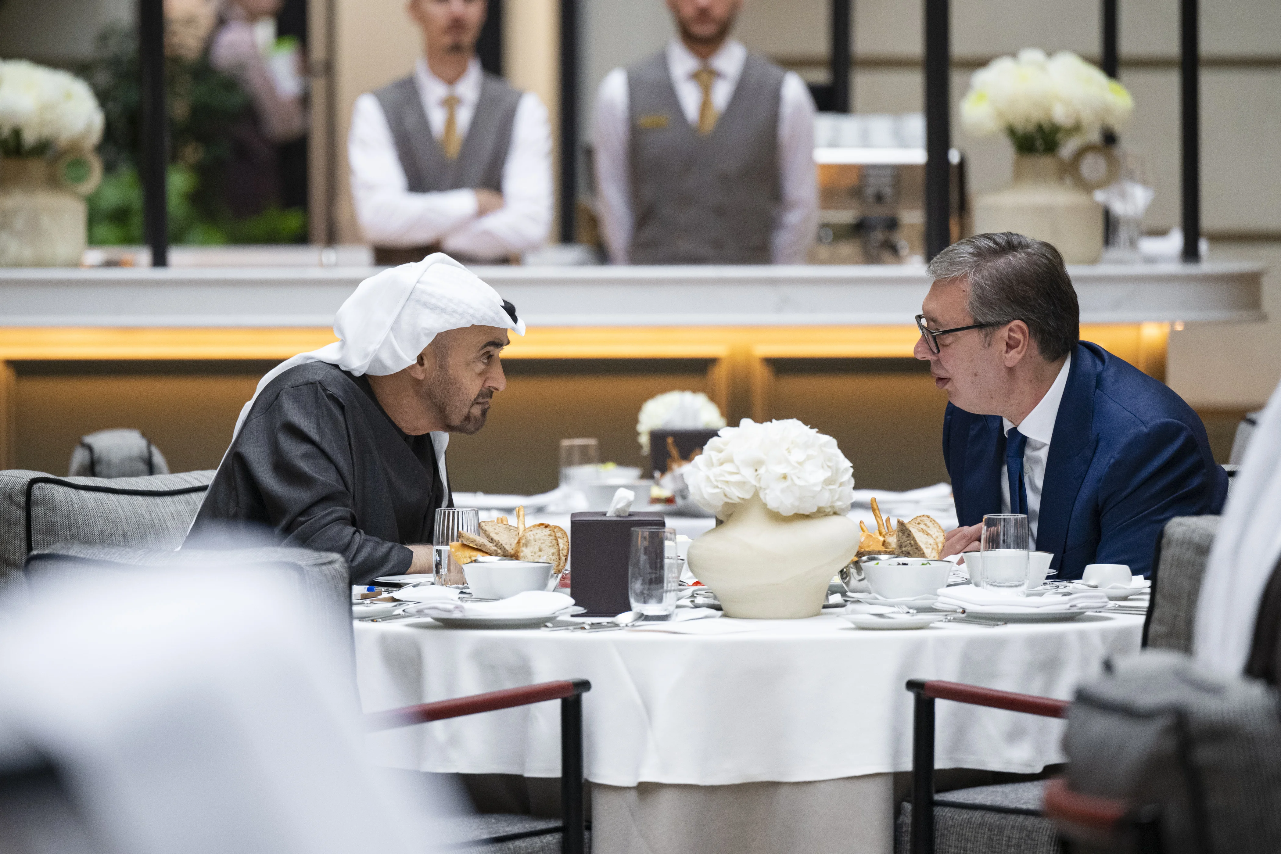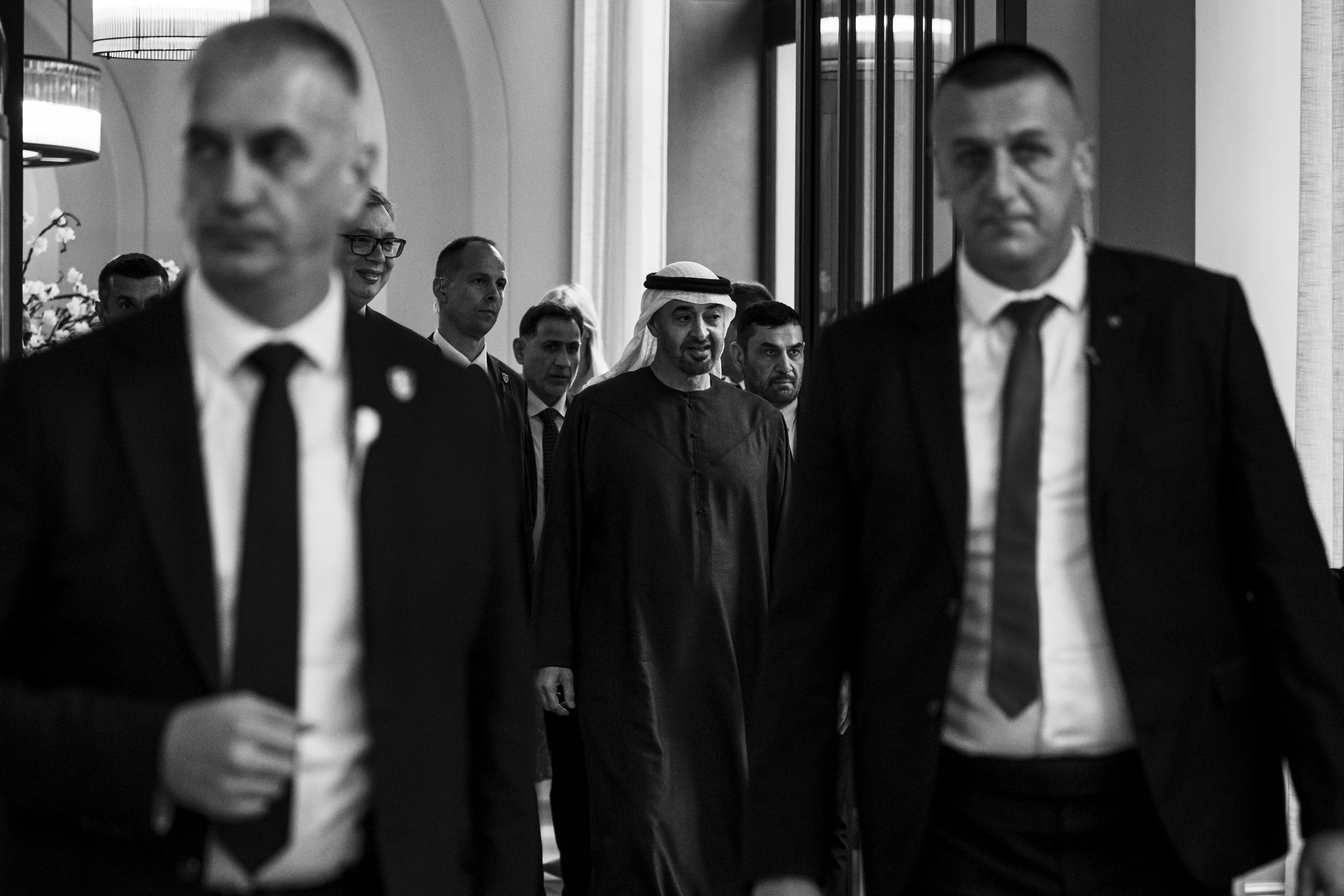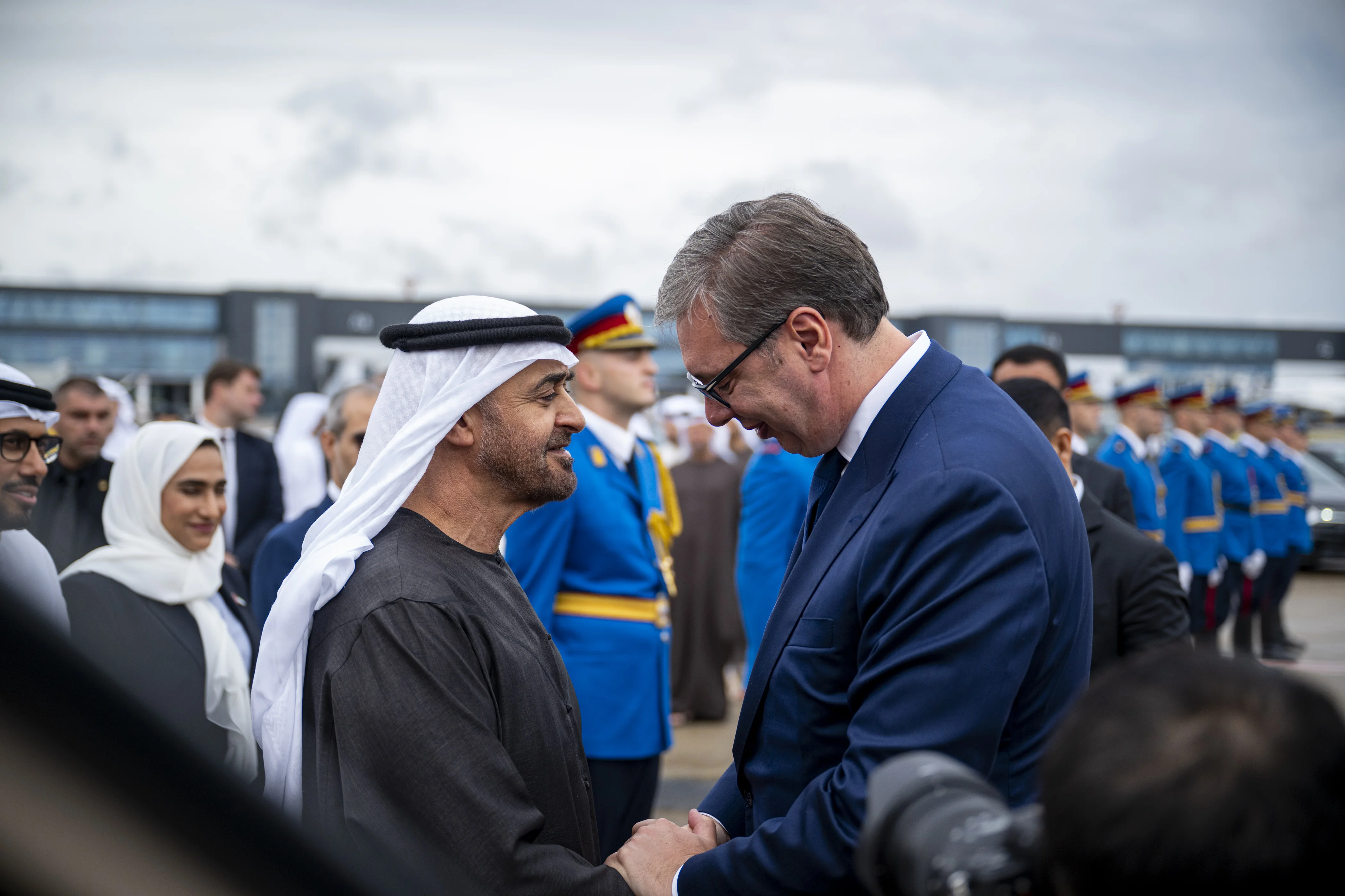 His Highness was accompanied by a delegation that included H.H. Sheikh Hamdan bin Mohamed bin Zayed Al Nahyan, Deputy Chairman of the Presidential Court for Special Affairs; H.H. Sheikh Zayed bin Mohamed bin Zayed Al Nahyan; Sheikh Mohammed bin Hamad bin Tahnoun Al Nahyan, Adviser to the UAE President; Ali bin Hammad Al Shamsi, Secretary-General of the Supreme Council for National Security; Dr. Sultan bin Ahmed Al Jaber, Minister of Industry and Advanced Technology; Sheikh Shakhboot bin Nahyan Al Nahyan, Minister of State; Faisal Abdulaziz Al Bannai, Adviser to the UAE President for Strategic Research and Advanced Technology Affairs; Dr. Ahmed Mubarak Ali Al Mazrouei, Chairman of the President’s Office for Strategic Affairs and Chairman of the Abu Dhabi Executive Office; Lana Zaki Nusseibeh, Assistant of Minister of Foreign Affairs for Political Affairs; Khaldoon Khalifa Al Mubarak, Chairman of the Executive Affairs Authority; Ahmed Hatem AlMenhali, UAE Ambassador to Serbia; Mohamed Alabbar, Chairman of the Board of Directors of Eagle Hills; along with several senior officials.