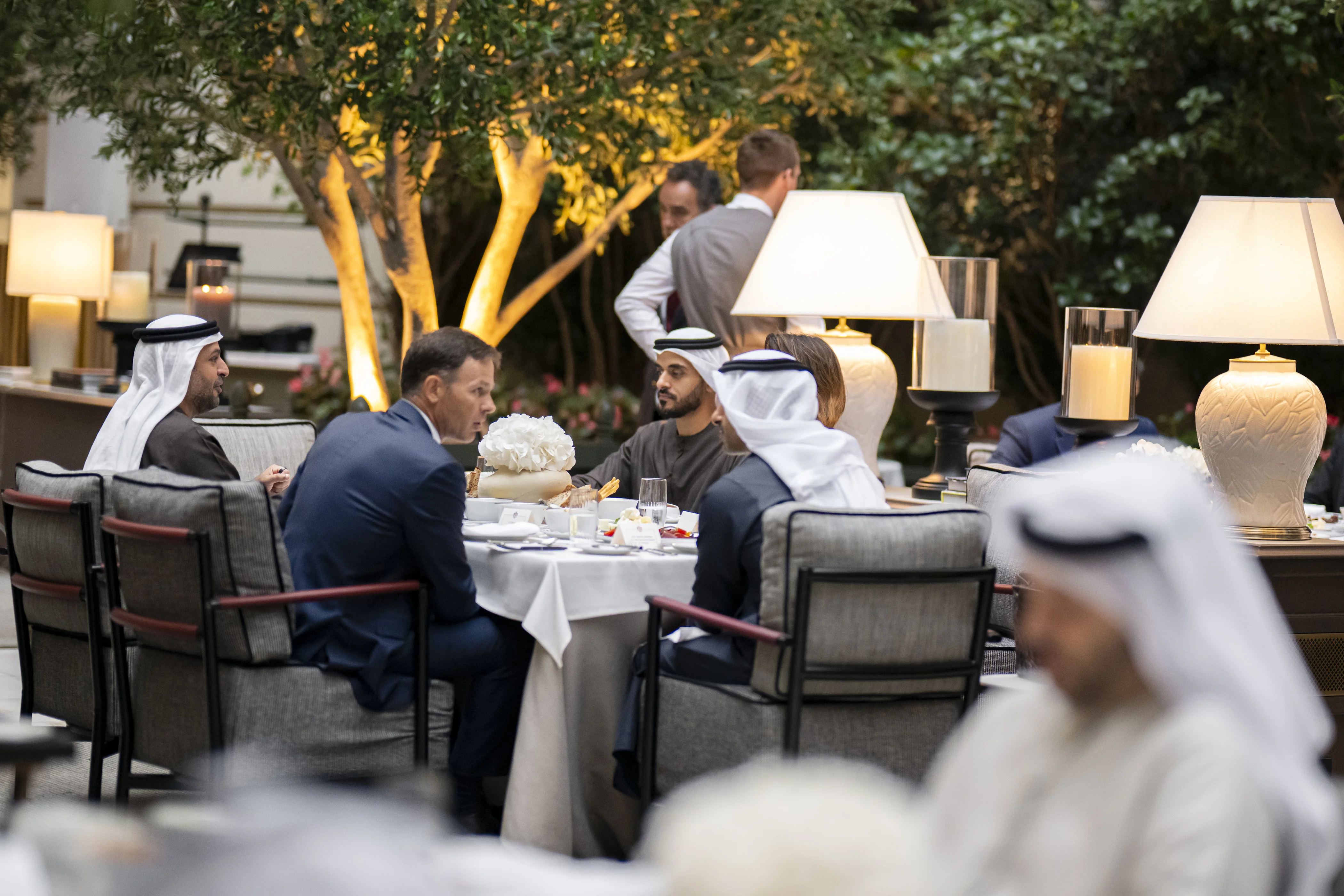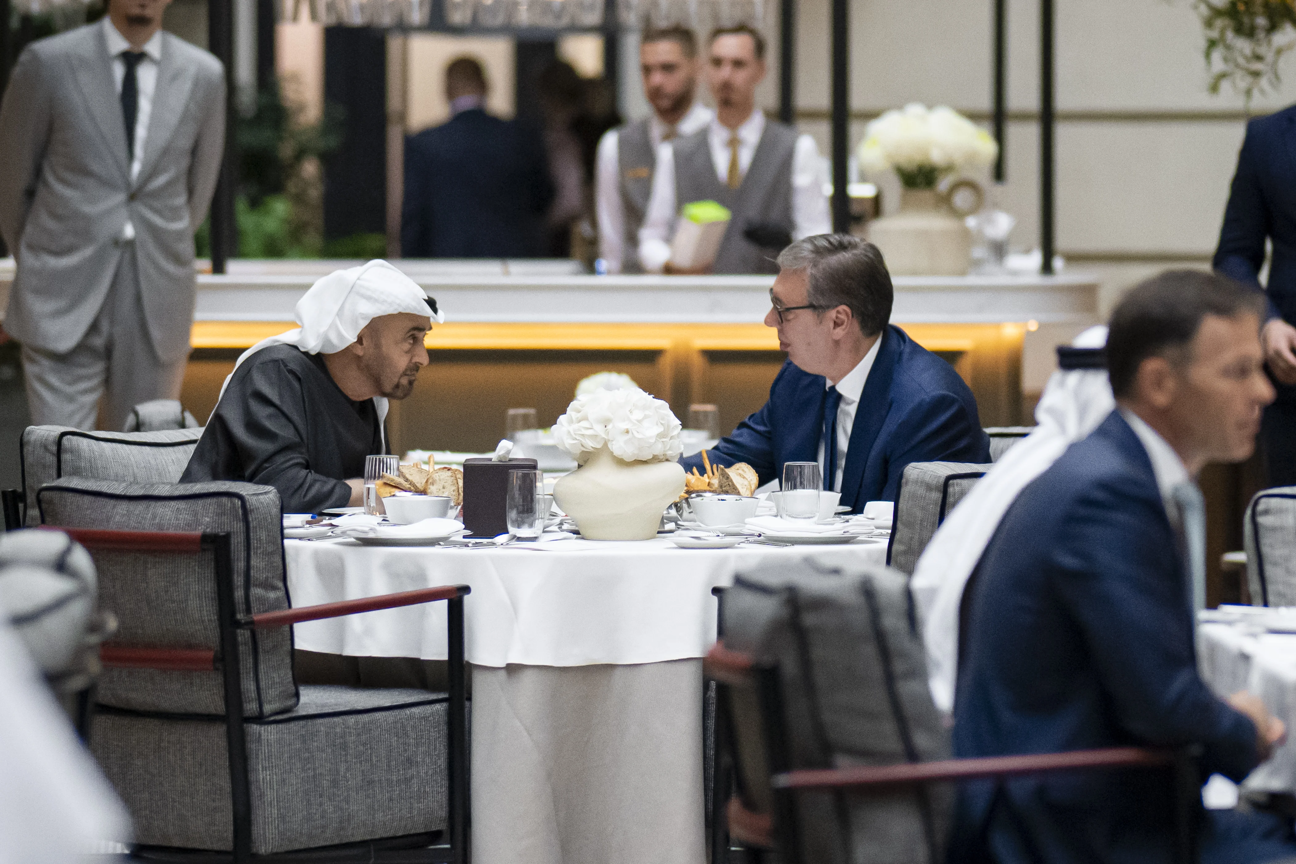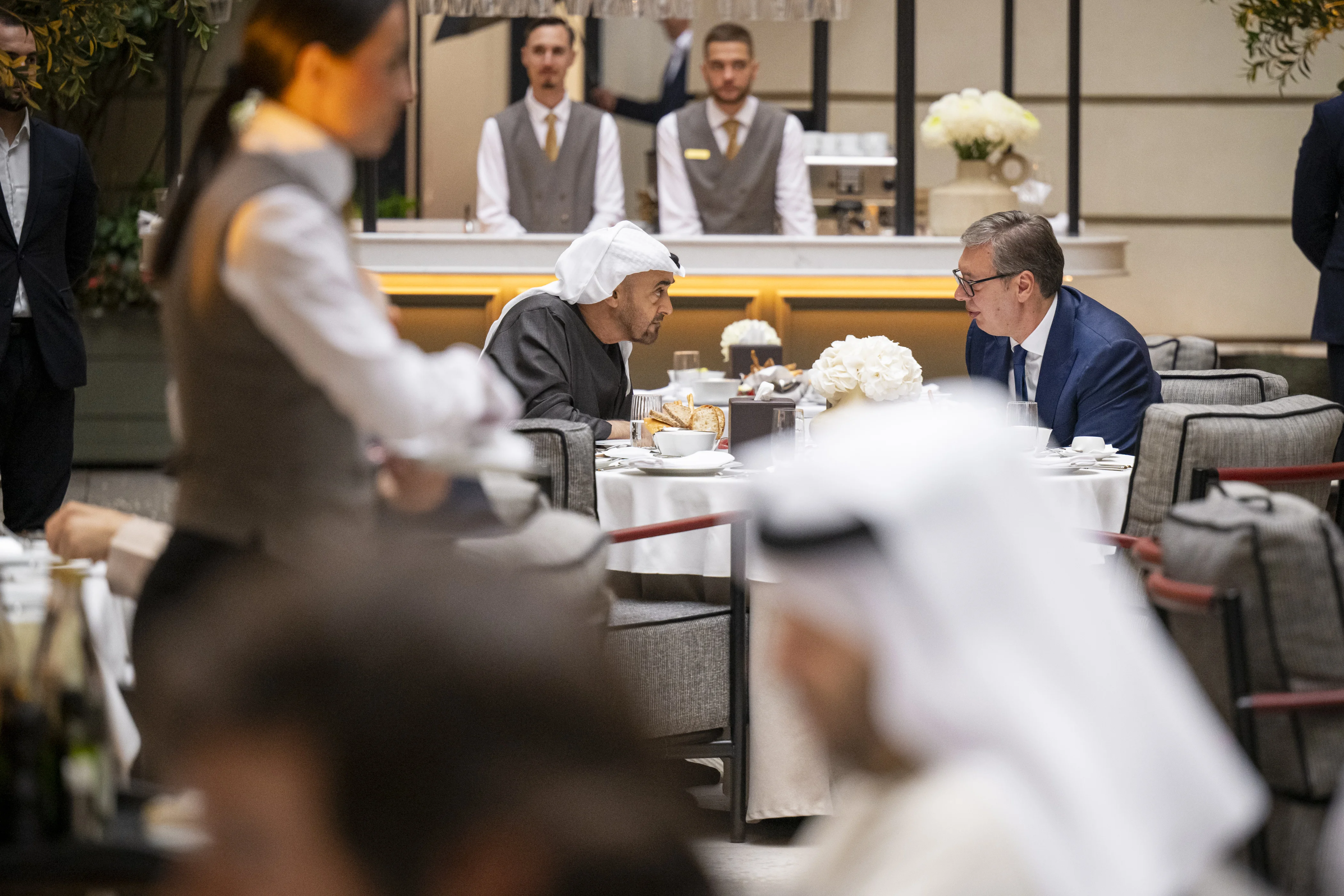 His Highness was accompanied by a delegation that included H.H. Sheikh Hamdan bin Mohamed bin Zayed Al Nahyan, Deputy Chairman of the Presidential Court for Special Affairs; H.H. Sheikh Zayed bin Mohamed bin Zayed Al Nahyan; Sheikh Mohammed bin Hamad bin Tahnoun Al Nahyan, Adviser to the UAE President; Ali bin Hammad Al Shamsi, Secretary-General of the Supreme Council for National Security; Dr. Sultan bin Ahmed Al Jaber, Minister of Industry and Advanced Technology; Sheikh Shakhboot bin Nahyan Al Nahyan, Minister of State; Faisal Abdulaziz Al Bannai, Adviser to the UAE President for Strategic Research and Advanced Technology Affairs; Dr. Ahmed Mubarak Ali Al Mazrouei, Chairman of the President’s Office for Strategic Affairs and Chairman of the Abu Dhabi Executive Office; Lana Zaki Nusseibeh, Assistant of Minister of Foreign Affairs for Political Affairs; Khaldoon Khalifa Al Mubarak, Chairman of the Executive Affairs Authority; Ahmed Hatem AlMenhali, UAE Ambassador to Serbia; Mohamed Alabbar, Chairman of the Board of Directors of Eagle Hills; along with several senior officials.