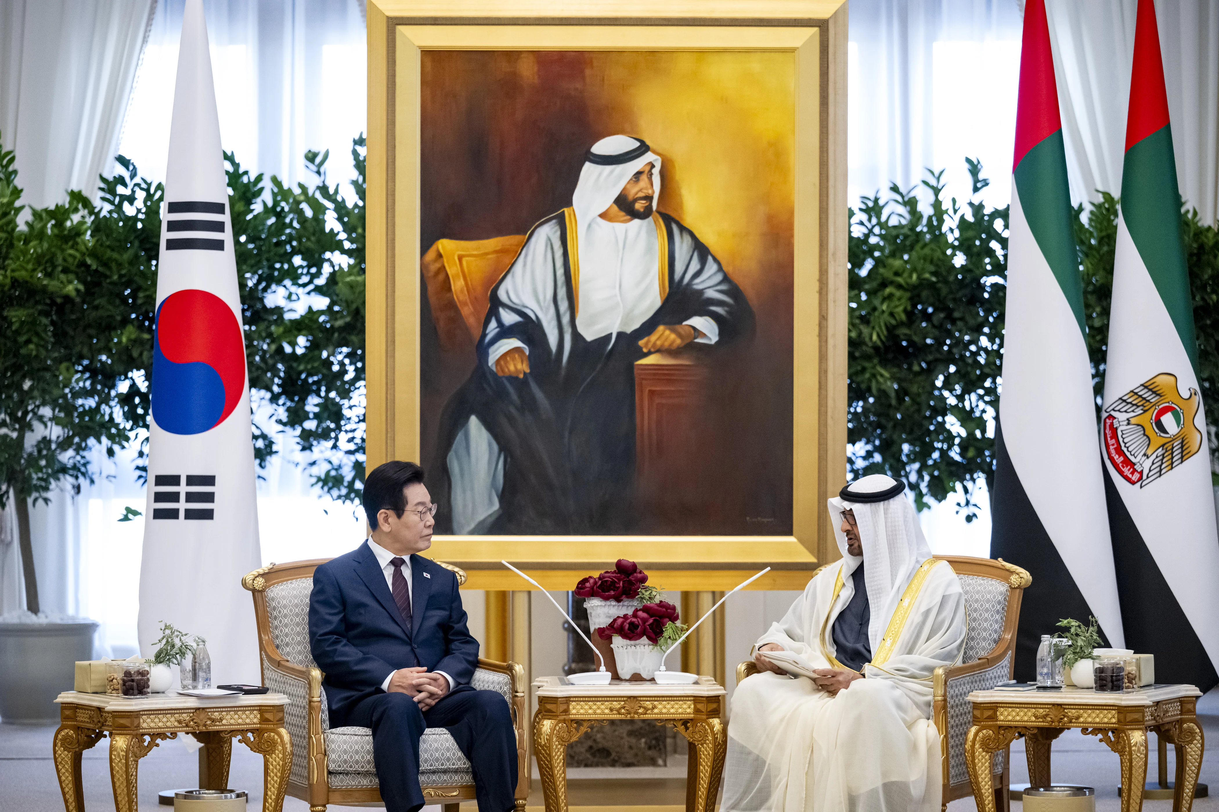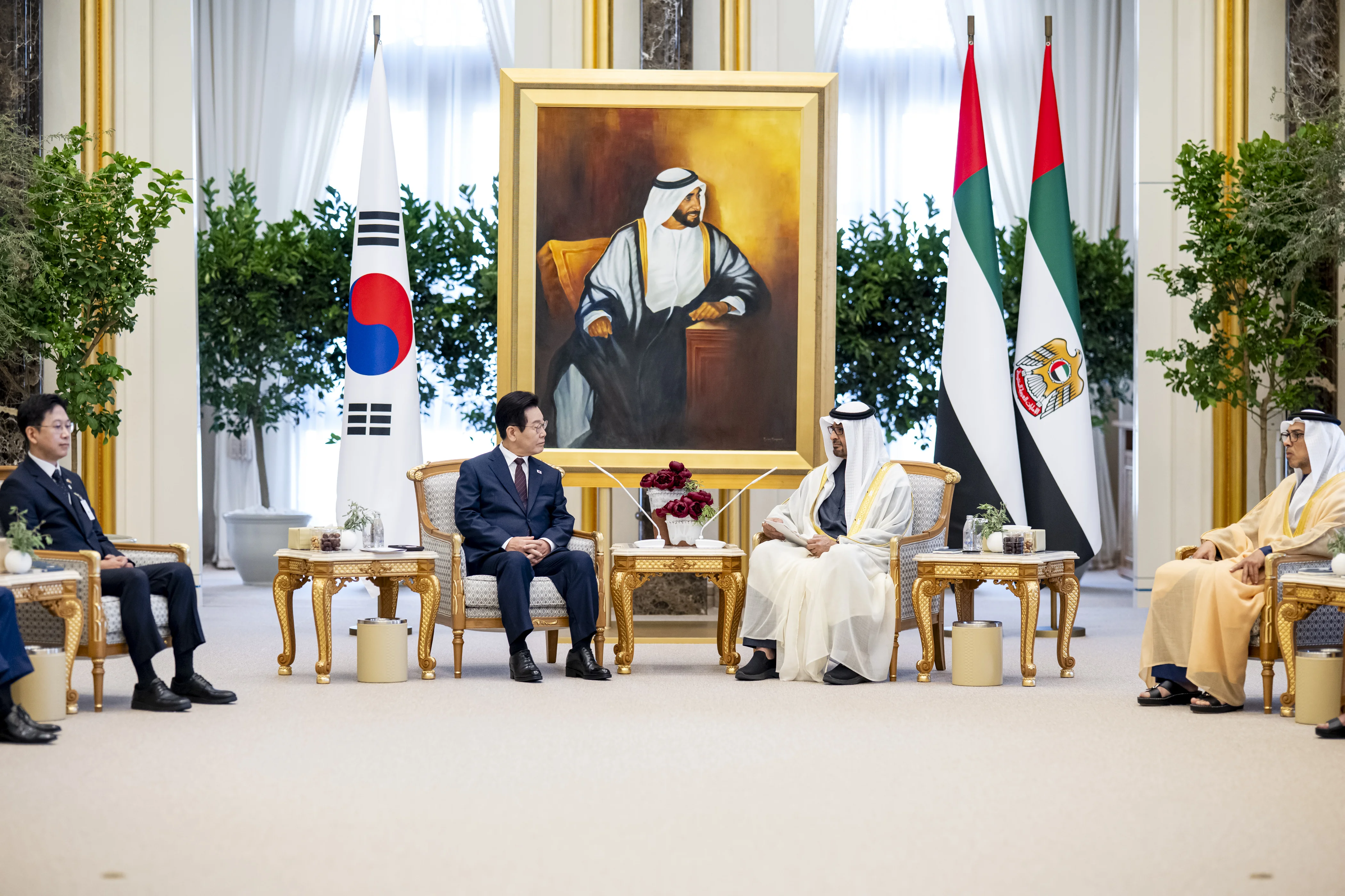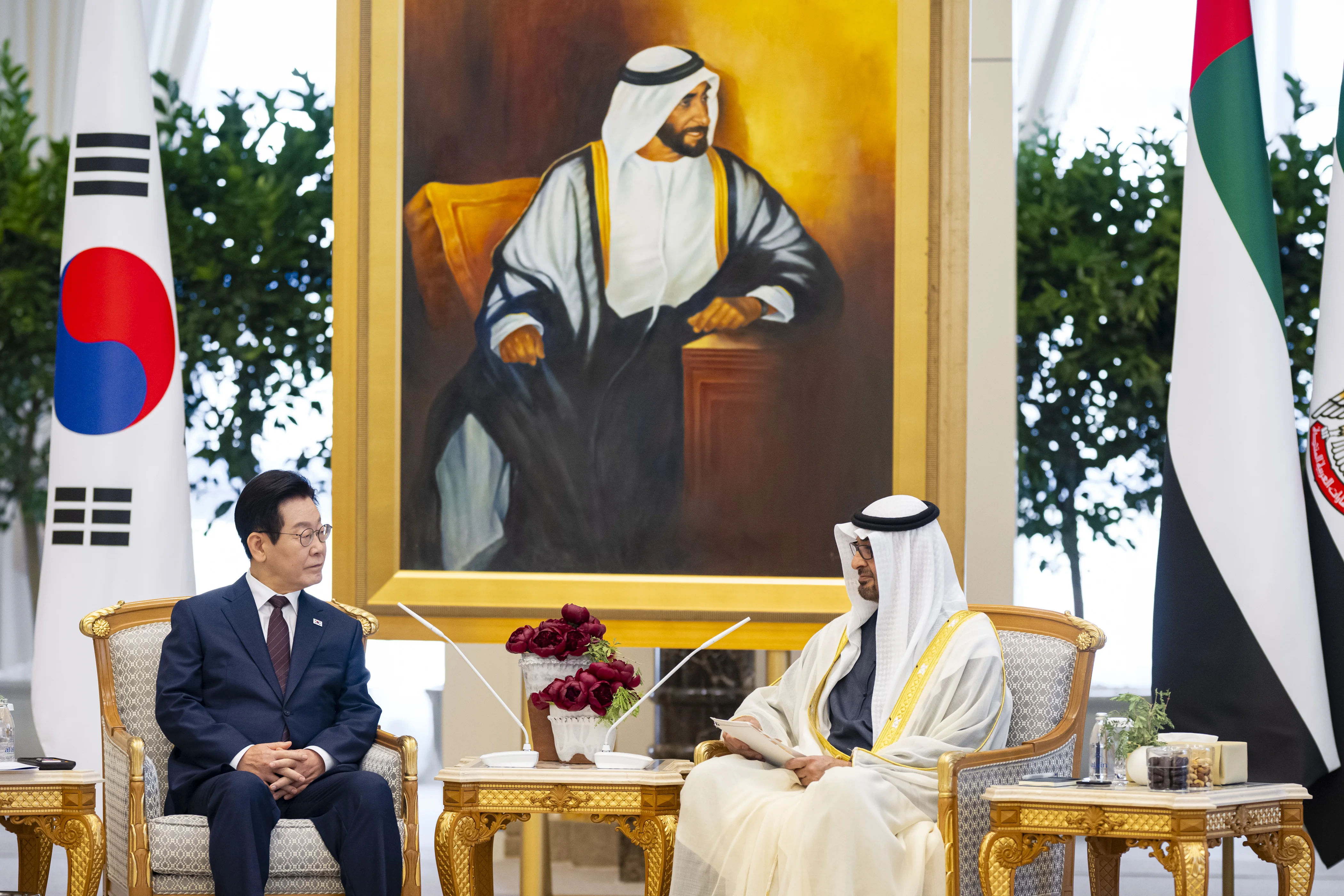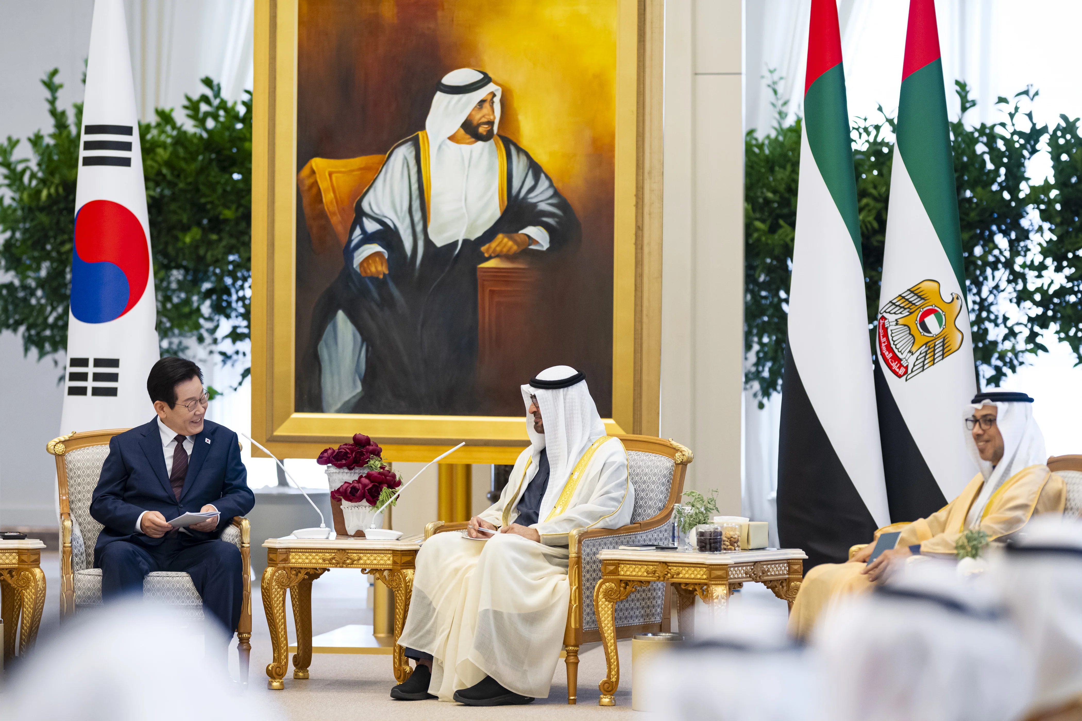 بحث صاحب السمو الشيخ محمد بن زايد آل نهيان رئيس الدولة "حفظه الله" وفخامة لي جيه ميونغ رئيس جمهورية كوريا اليوم مختلف مسارات التعاون والعمل المشترك لتحقيق أهداف الشراكة الإستراتيجية الخاصة والشراكة الاقتصادية الشاملة بين البلدين وفرص توسيع آفاقهما بما يخدم المصالح المشتركة لهما ويعود بالخير والنماء على شعبيهما.