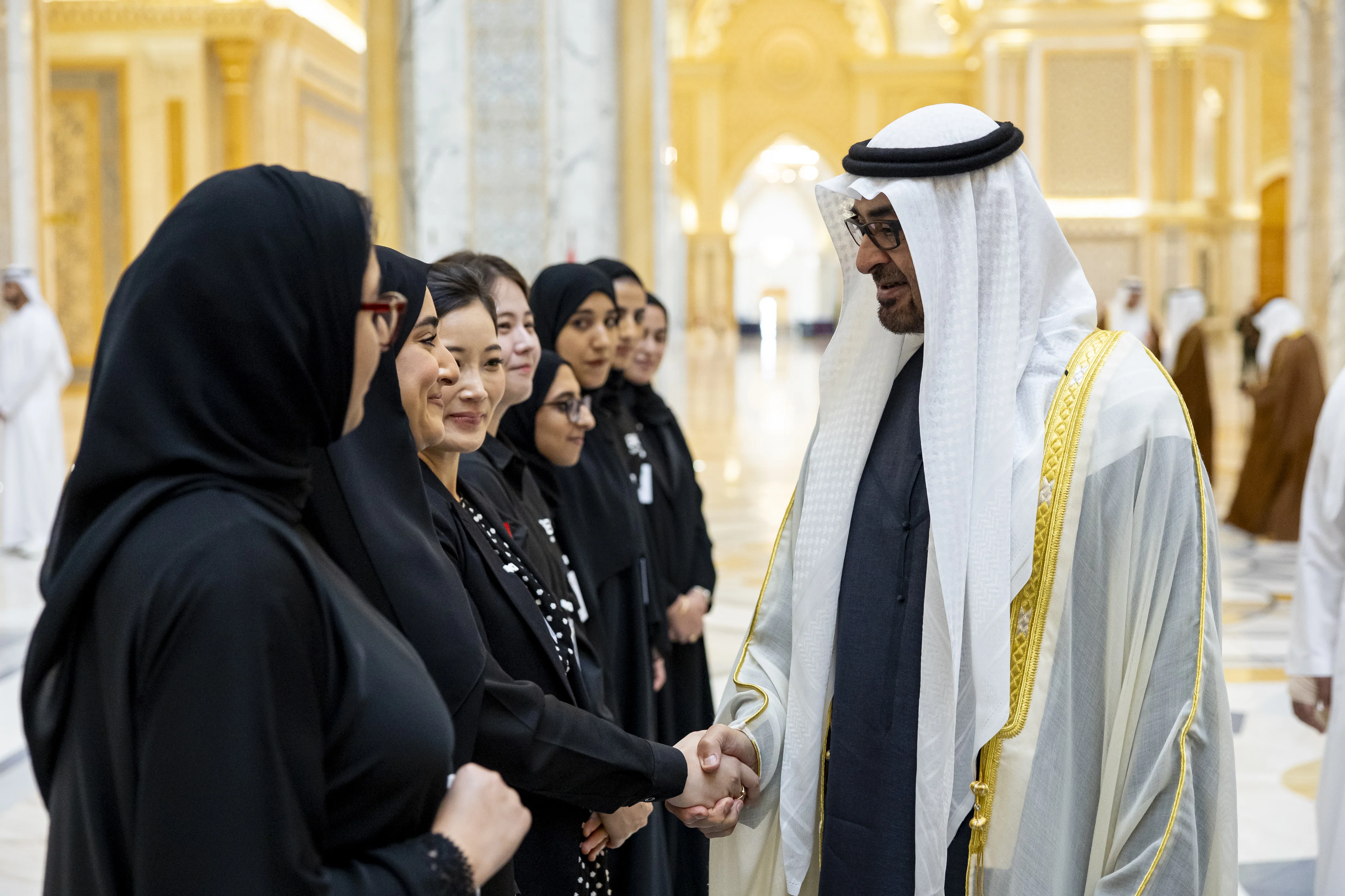 وكان صاحب السمو رئيس الدولة وفخامة الرئيس الكوري قد صافحا مجموعة مجتمعية شاركت في مراسم الاستقبال احتفاء بالرئيس الضيف ضمت عدداً من الطلبة المتميزين إضافة إلى مجموعة من المهندسين والمهندسات والعاملين في مجال الطاقة النووية ضمن مشاريع الدولة التنموية بجانب وفد اقتصادي من الجانبين الإماراتي والكوري.