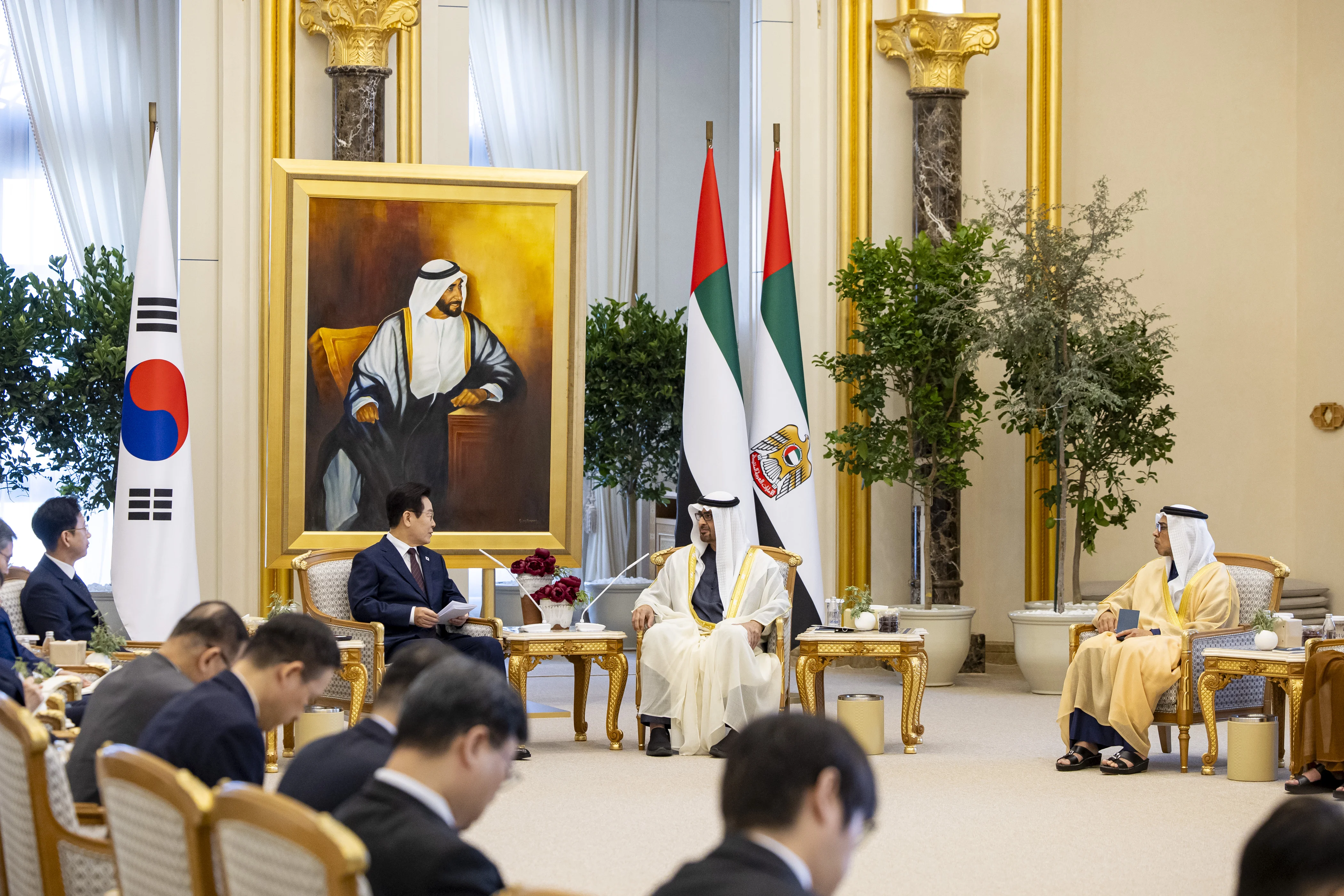 حضر جلسة المحادثات كل من..سمو الشيخ منصور بن زايد آل نهيان، نائب رئيس الدولة نائب رئيس مجلس الوزراء رئيس ديوان الرئاسة، وسمو الشيخ خالد بن محمد بن زايد آل نهيان، ولي عهد أبوظبي، والفريق سمو الشيخ سيف بن زايد آل نهيان، نائب رئيس مجلس الوزراء وزير الداخلية، وسمو الشيخ ذياب بن محمد بن زايد آل نهيان، نائب رئيس ديوان الرئاسة للشؤون التنموية وأسر الشهداء، وسمو الشيخ حمدان بن محمد بن زايد آل نهيان، نائب رئيس ديوان الرئاسة للشؤون الخاصة، ومعالي الشيخ محمد بن حمد بن طحنون آل نهيان، مستشار صاحب السمو رئيس الدولة، وعدد من الشيوخ والوزراء وكبار المسؤولين في الدولة..كما حضرها الوفد المرافق للرئيس الكوري الذي يضم عدداً من الوزراء وكبار المسؤولين.