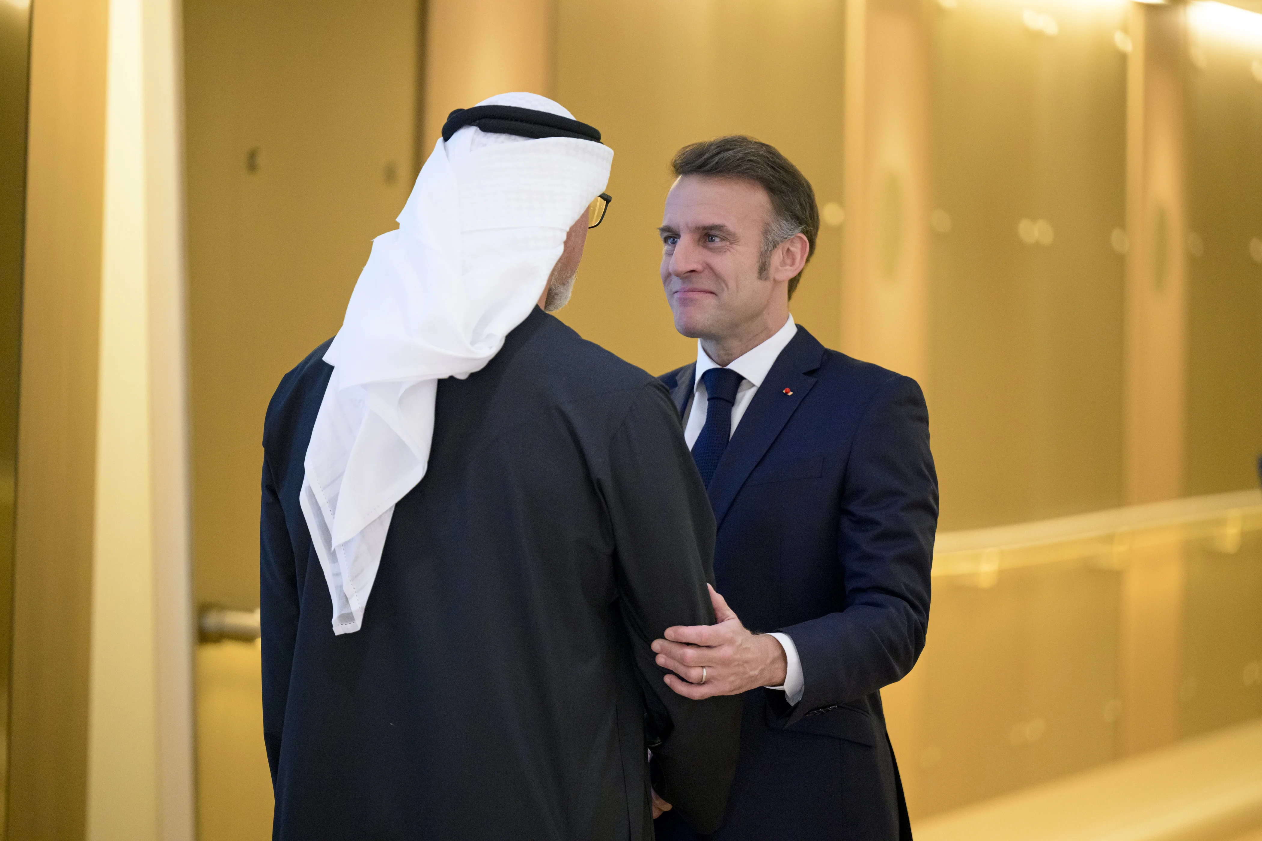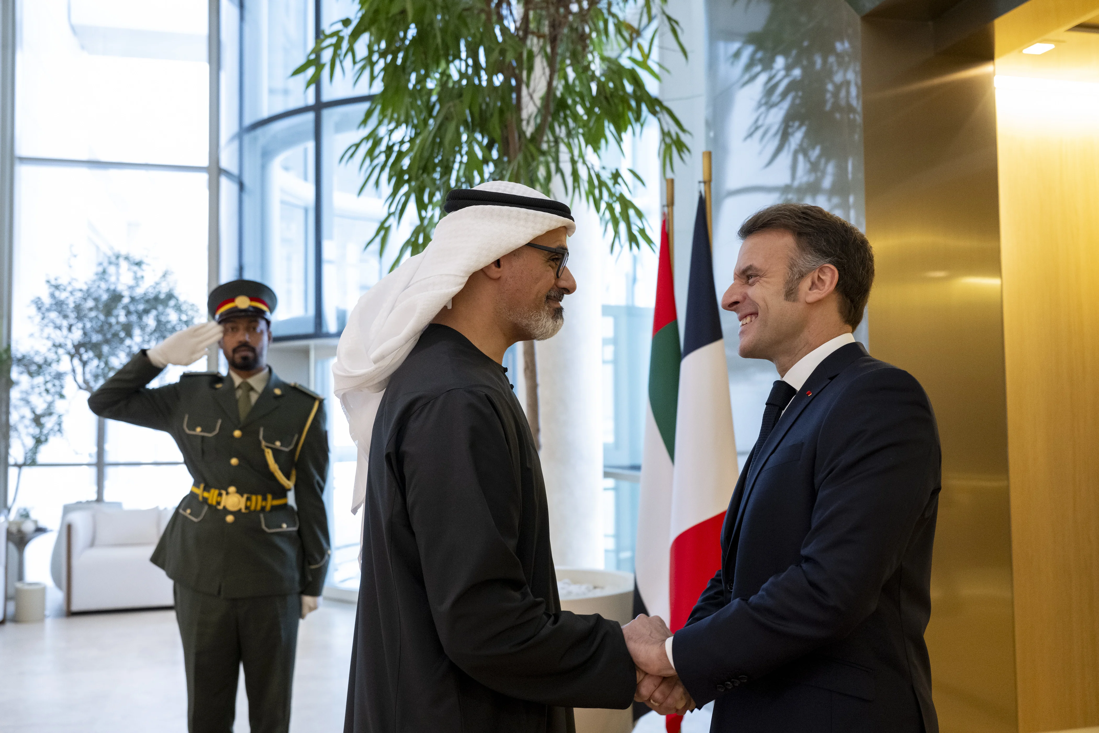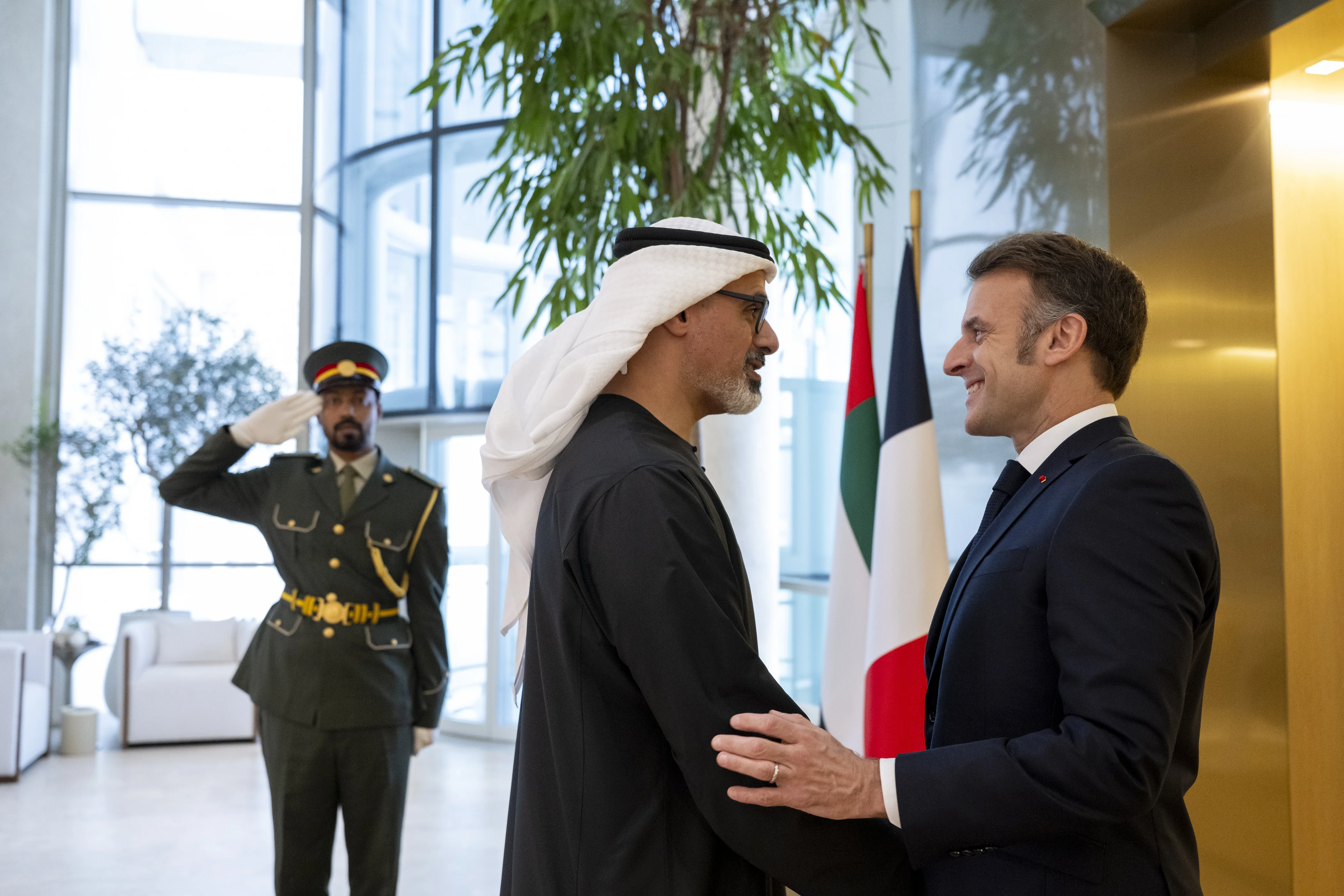 ورحب سموه ــ خلال اللقاء الذي جرى في متحف زايد الوطني في أبوظبي ــ بفخامة الرئيس الفرنسي..وتبادل معه التهاني بمناسبة قرب حلول العام الجديد متمنيين للبلدين وشعبيهما دوام التقدم والازدهار.