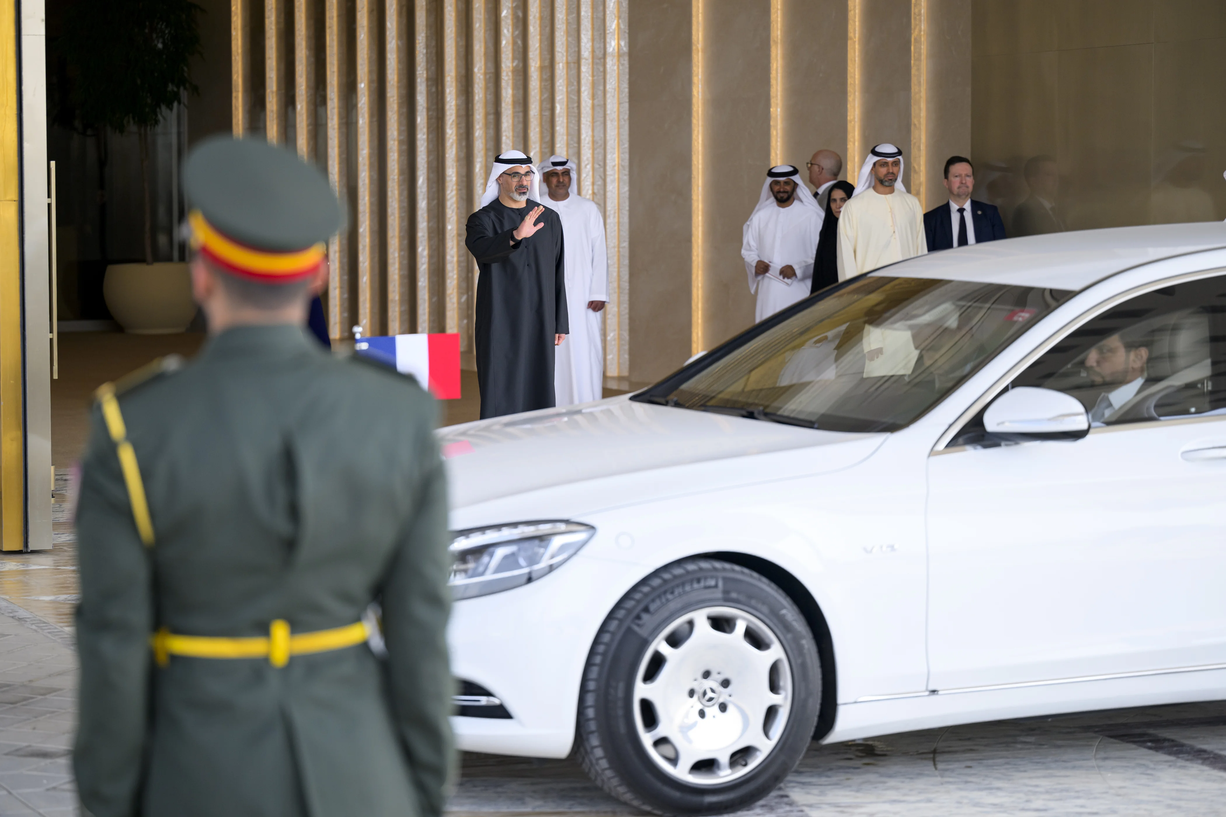 وكان الرئيس الفرنسي قد وصل البلاد في وقت سابق اليوم حيث كان في مقدمة مستقبلي فخامته في مطار الرئاسة في أبوظبي..سمو الشيخ خالد بن محمد بن زايد آل نهيان ولي عهد أبوظبي وعدد من كبار المسؤولين.