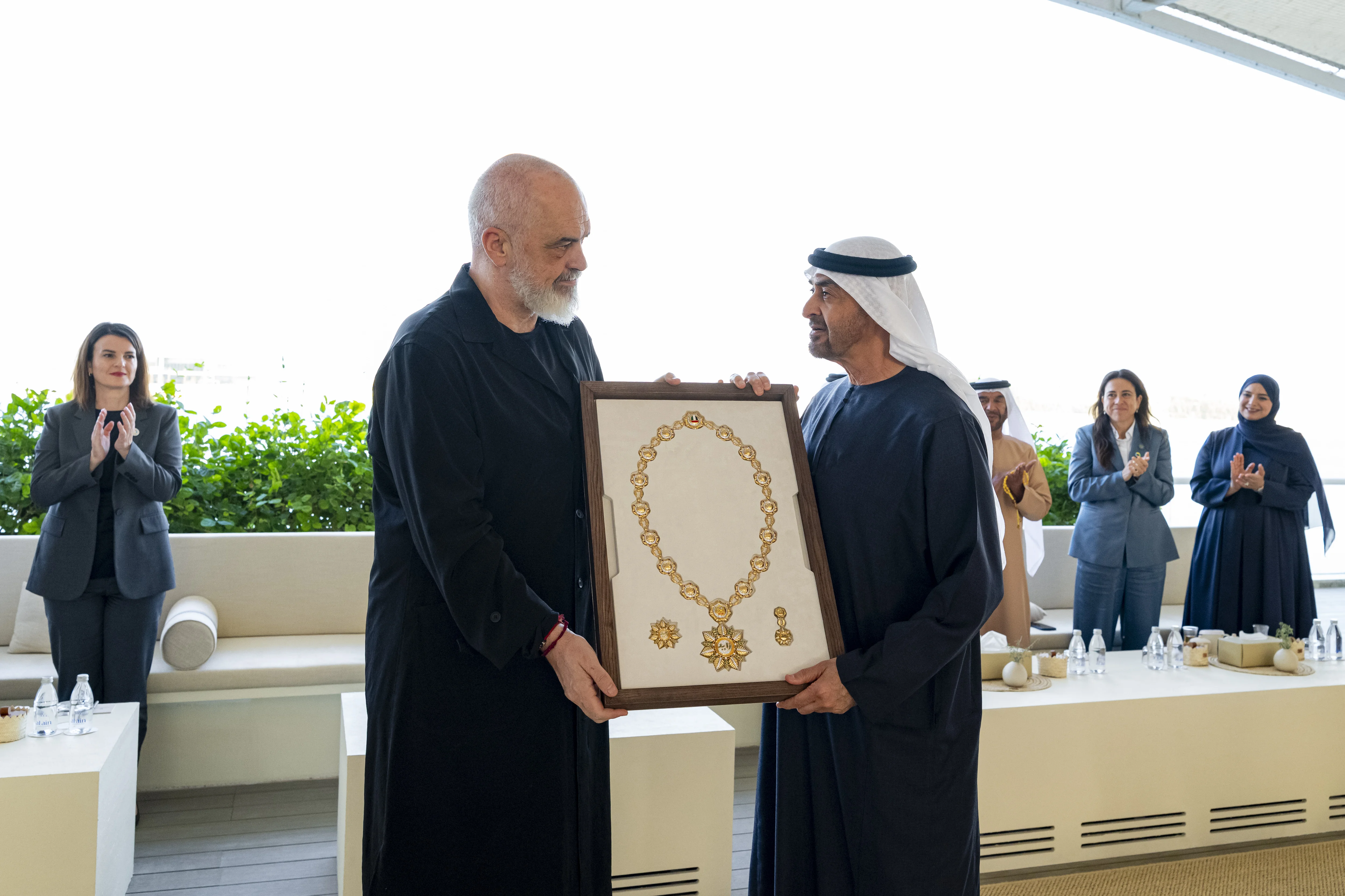 منح صاحب السمو الشيخ محمد بن زايد آل نهيان رئيس الدولة "حفظه الله" اليوم، معالي إيدي راما رئيس وزراء جمهورية ألبانيا "وسام زايد" الذي يعد أعلى وسام تمنحه دولة الإمارات إلى قادة الدول ورؤسائها وملوكها وذلك تقديراً للجهود التي بذلها معاليه في تعزيز علاقات التعاون بين دولة الإمارات وجمهورية ألبانيا وازدهارها.