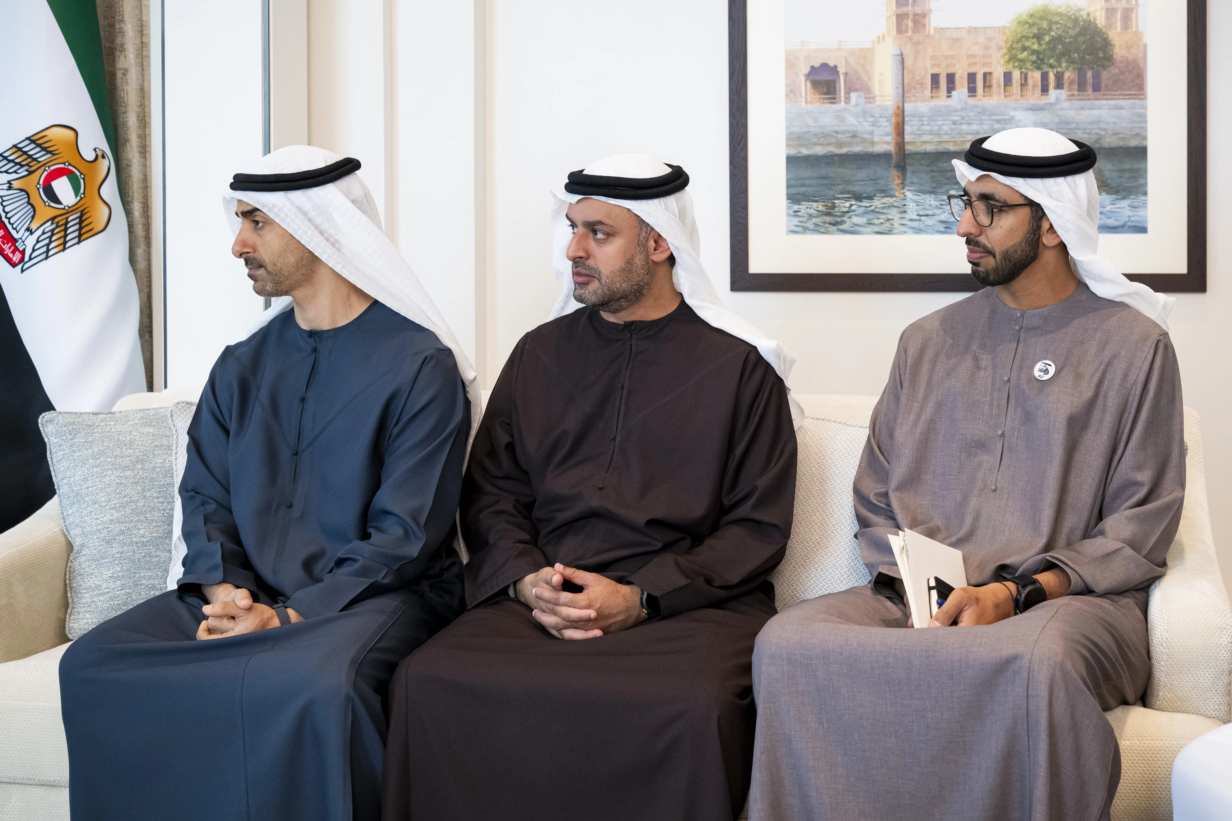 حضر اللقاء..سمو الشيخ حمدان بن محمد بن زايد آل نهيان نائب رئيس ديوان الرئاسة للشؤون الخاصة ومعالي الشيخ محمد بن حمد بن طحنون آل نهيان مستشار صاحب السمو رئيس الدولة وعدد من الوزراء وكبار المسؤولين في الدولة.