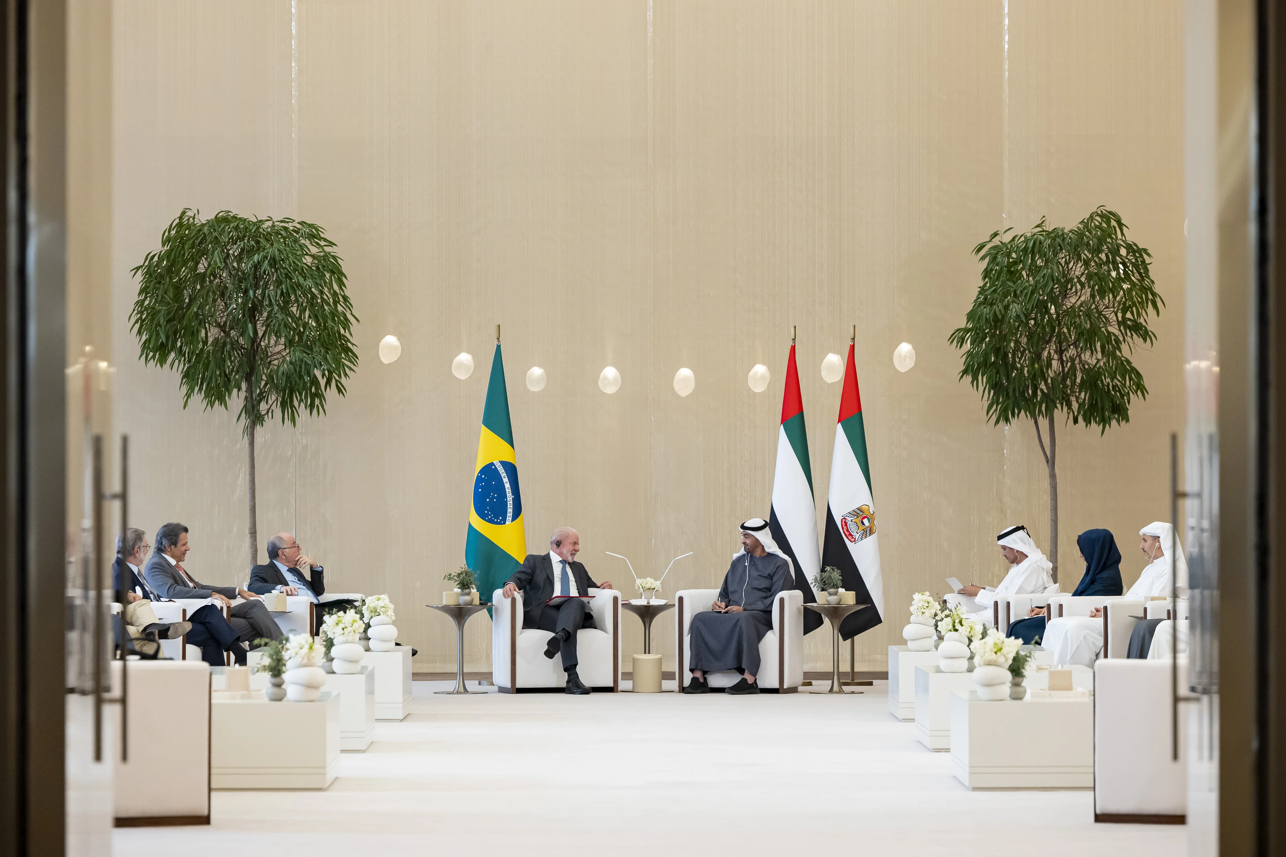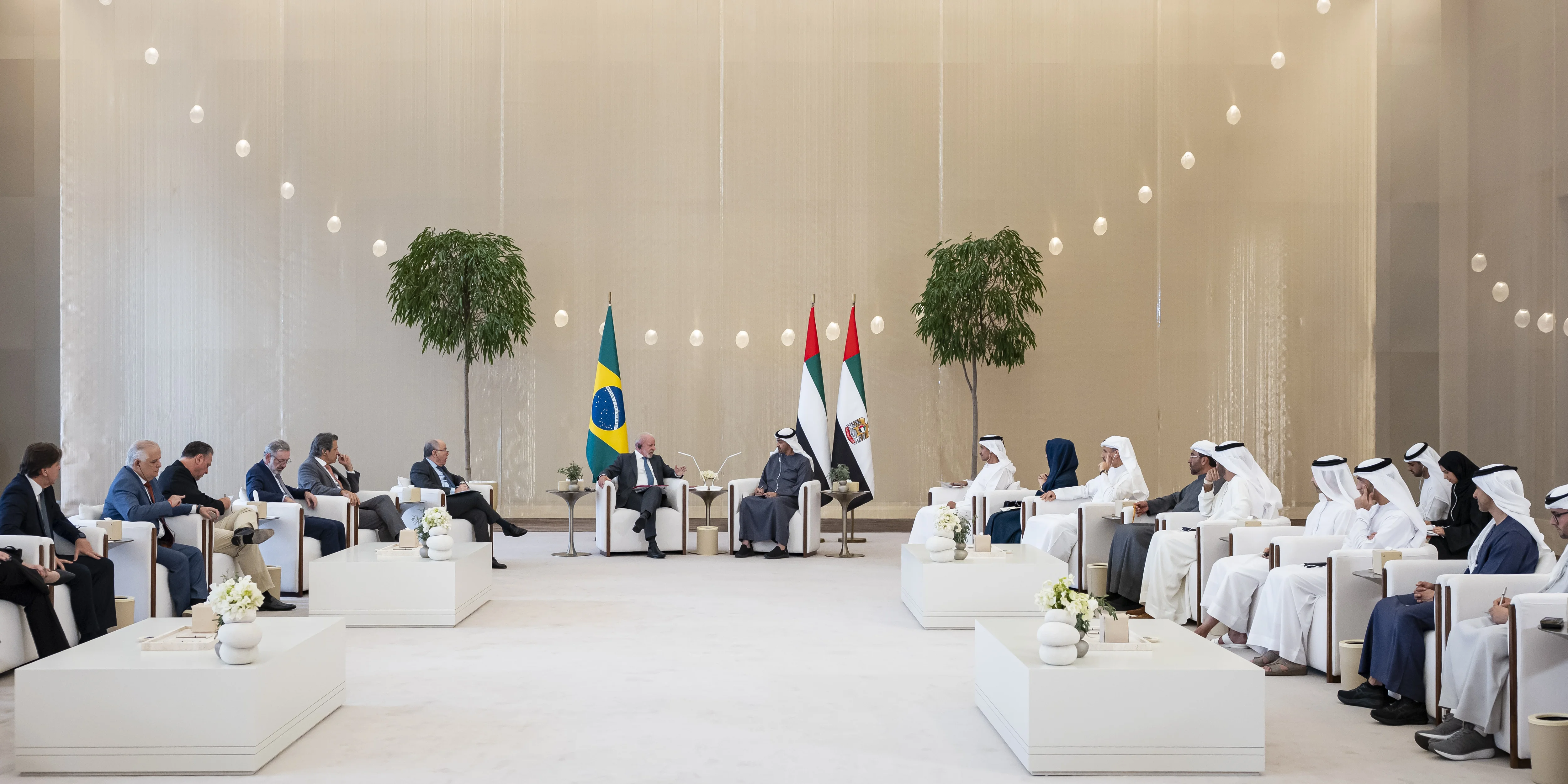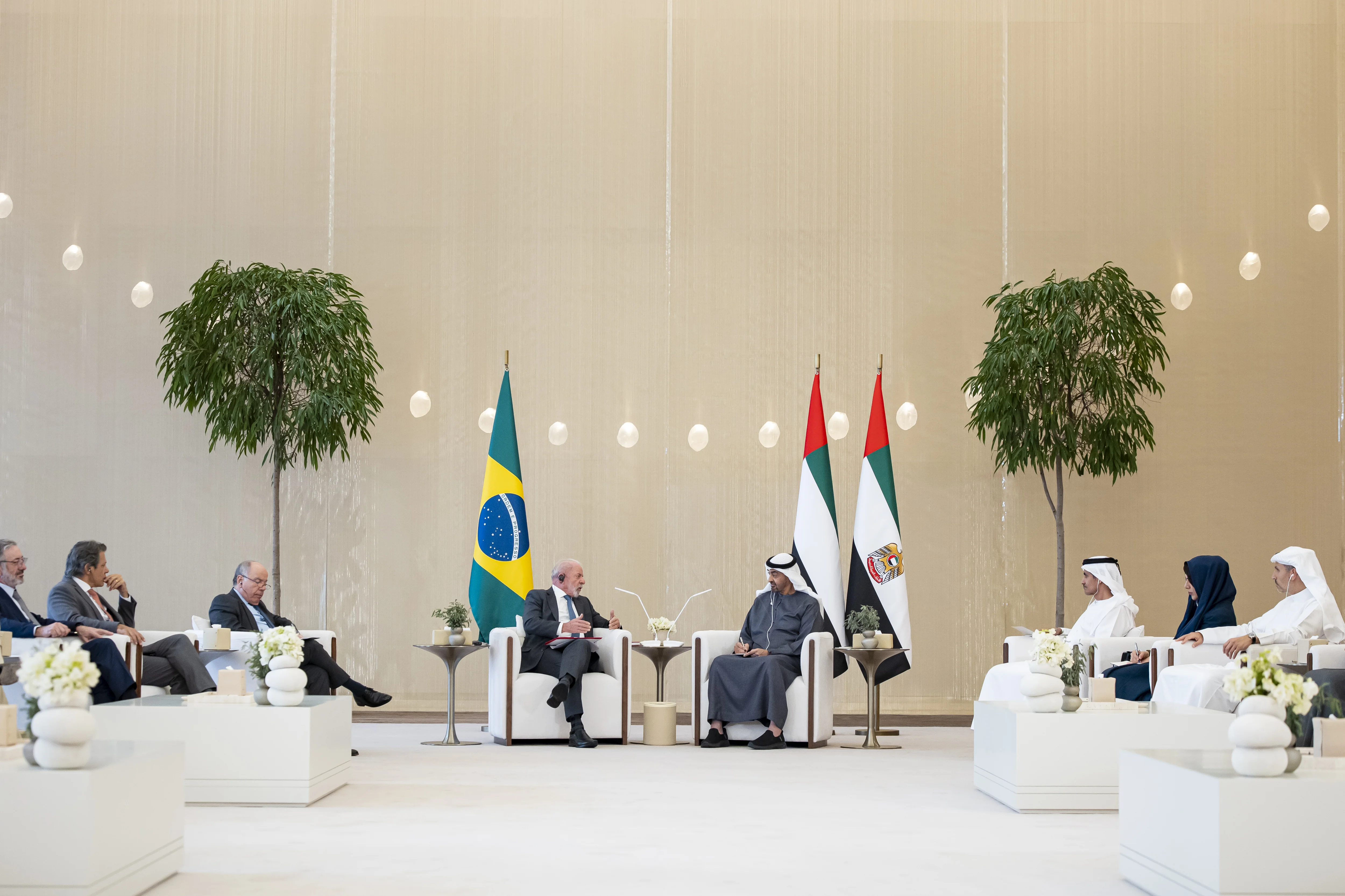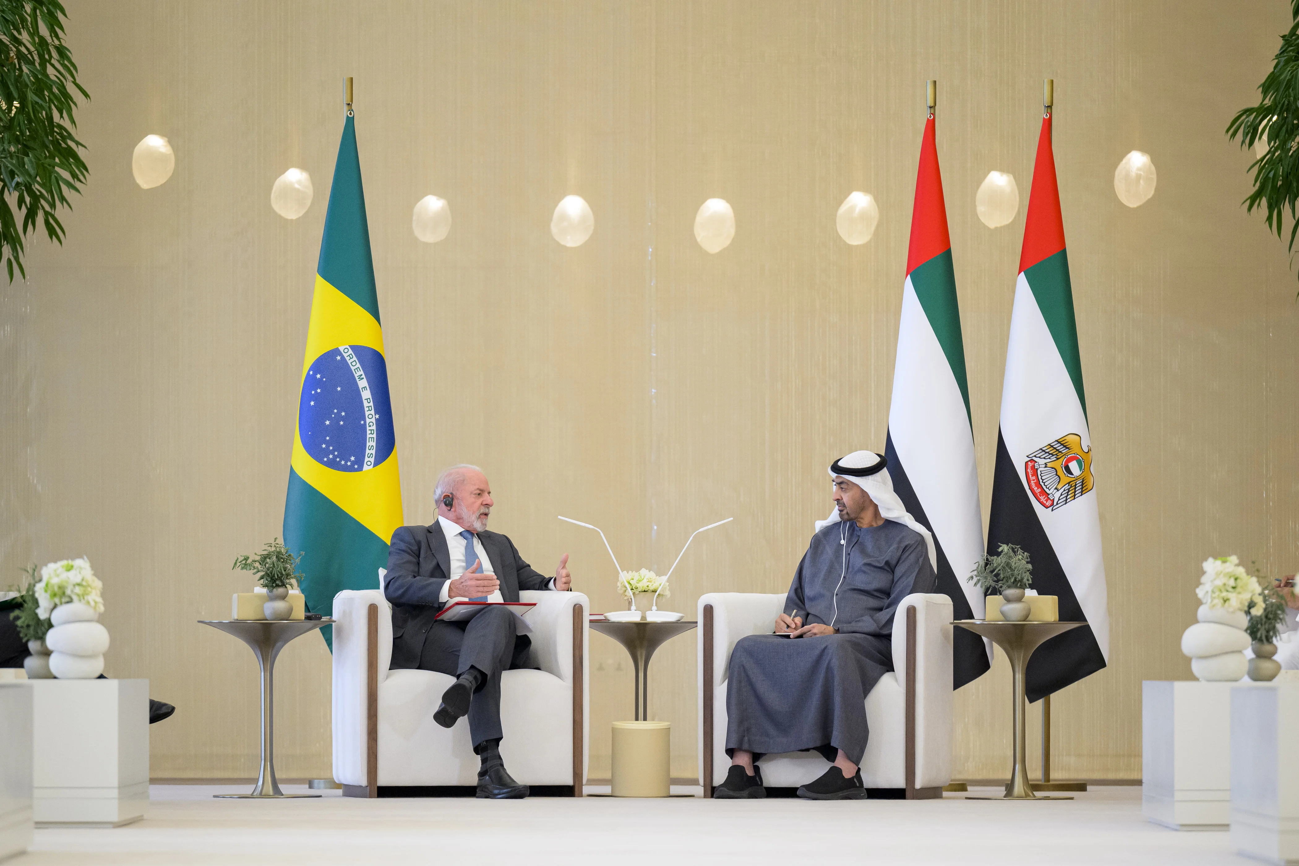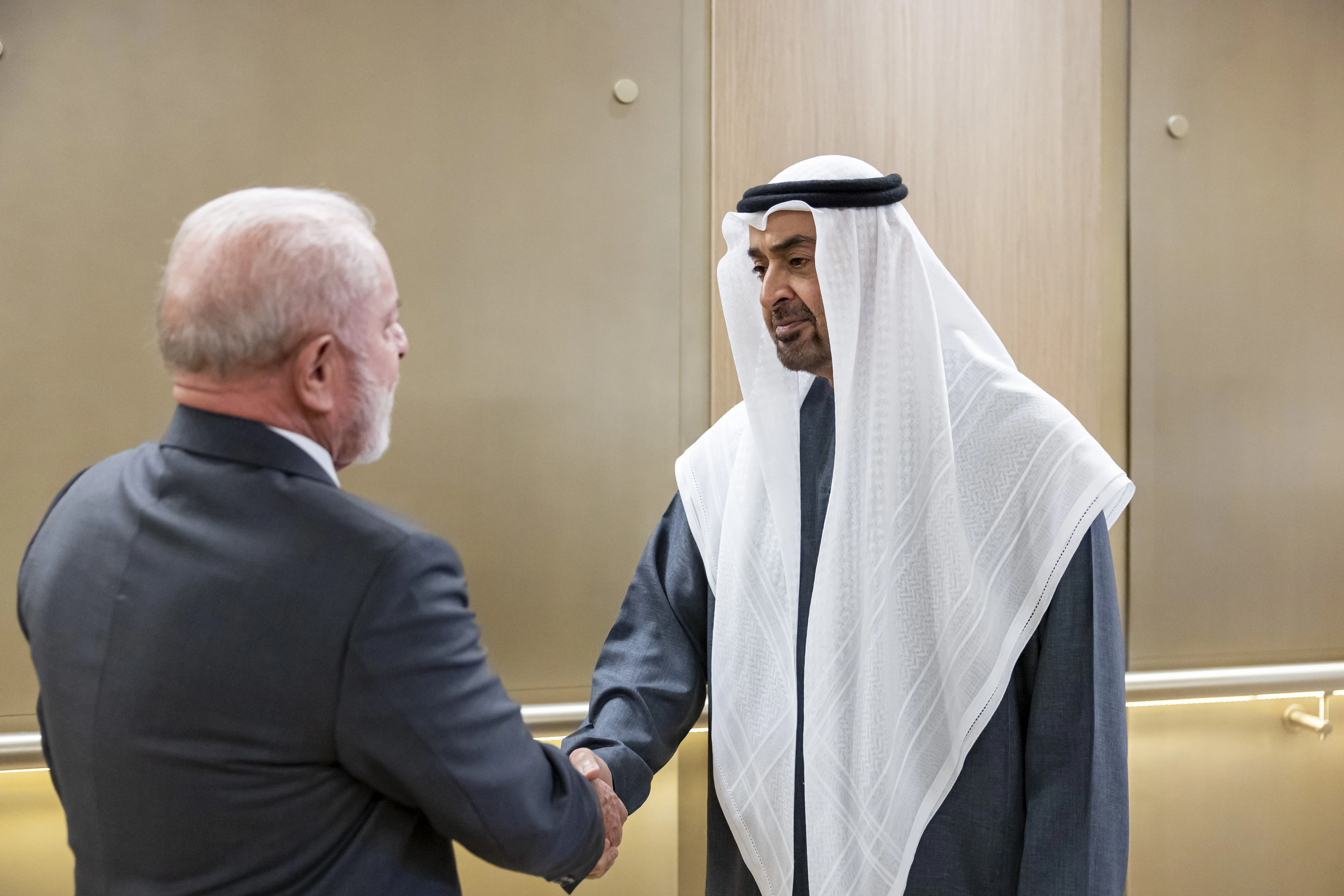 بحث صاحب السمو الشيخ محمد بن زايد آل نهيان رئيس الدولة "حفظه الله"، وفخامة لويس إيناسيو داسيلفا رئيس جمهورية البرازيل الاتحادية، مختلف جوانب التعاون والعمل المشترك وسبل تعزيزهما في إطار الشراكة الإستراتيجية التي تجمع البلدين وحرصهما المتبادل على الدفع بها إلى آفاق أرحب تخدم أولوياتهما التنموية وتعود بالخير على شعبيهما.