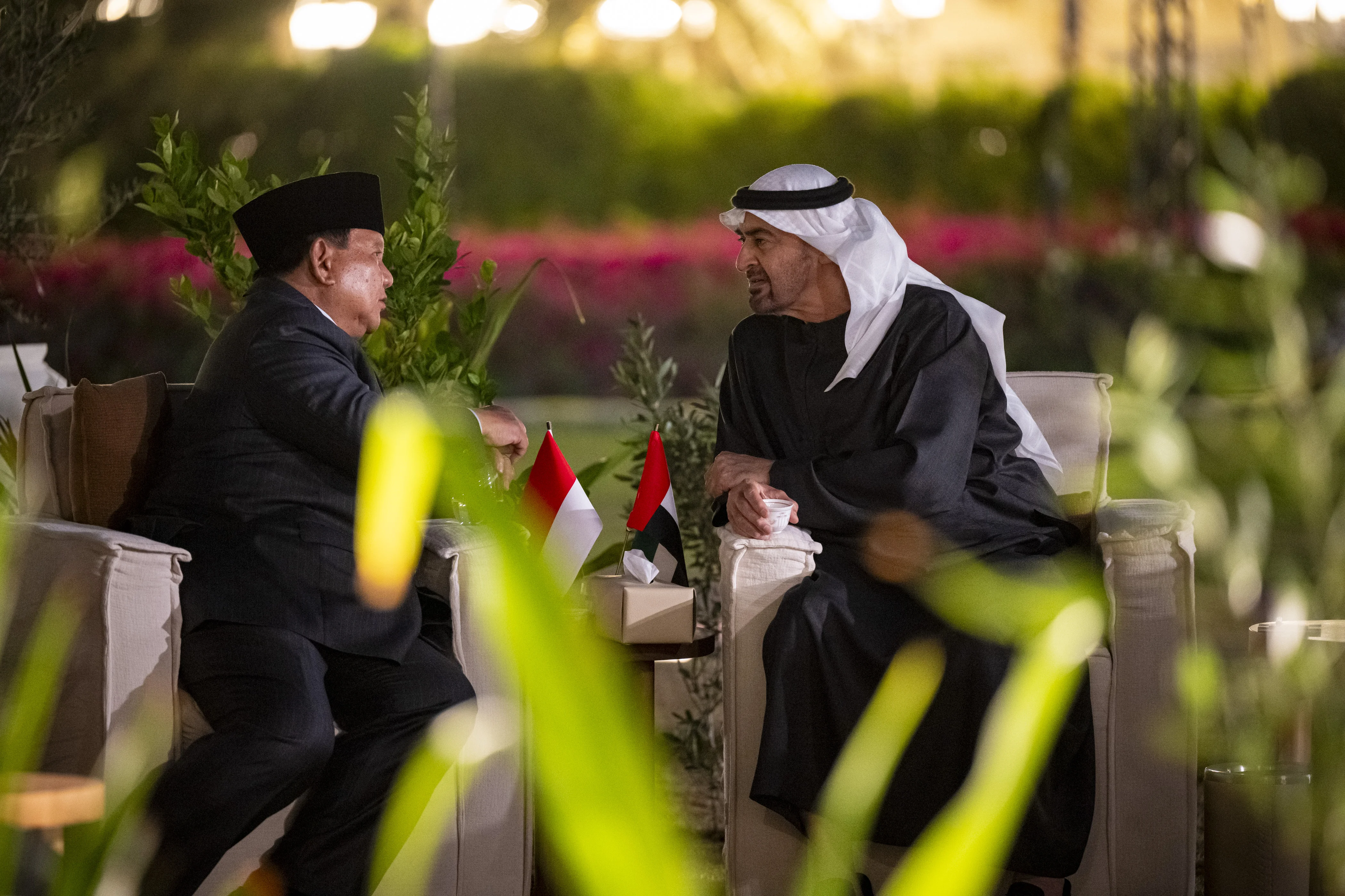 بحث صاحب السمو الشيخ محمد بن زايد آل نهيان رئيس الدولة "حفظه الله" وفخامة برابوو سوبيانتو رئيس جمهورية إندونيسيا اليوم مختلف جوانب العلاقات الثنائية وسبل تعزيزها خاصة في المجالات التنموية وفي مقدمتها الاقتصاد والتجارة والطاقة المتجددة والتكنولوجيا والذكاء الاصطناعي والاستدامة والأمن الغذائي والثقافة وغيرها، وذلك في إطار الشراكة الاقتصادية الشاملة بين البلدين.
